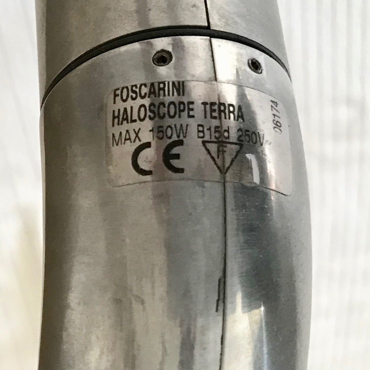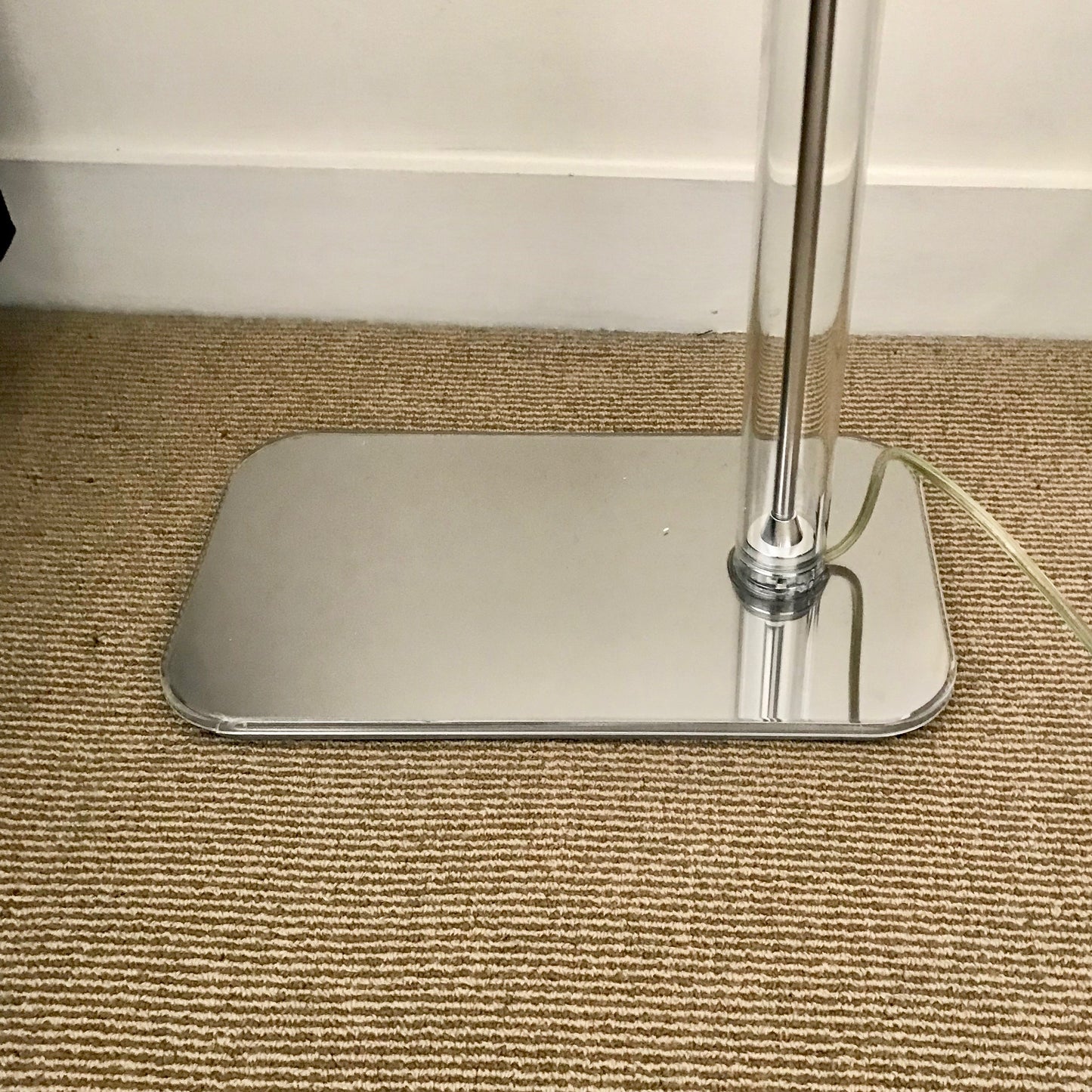 Haloscope Floor Lamp. Floor lamp with stem in borosilicate glass and base in transparent plastic material and metal. The diffuser (polished or satin-finished metal) rotates parallel to the floor and on the light bulb axis.