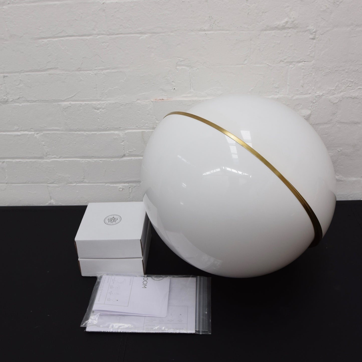 An illuminated sphere sliced in half in opaque acrylic reveals a crescent-shaped brushed brass fascia. Crescent Light seamlessly combines the solid and the opaque.