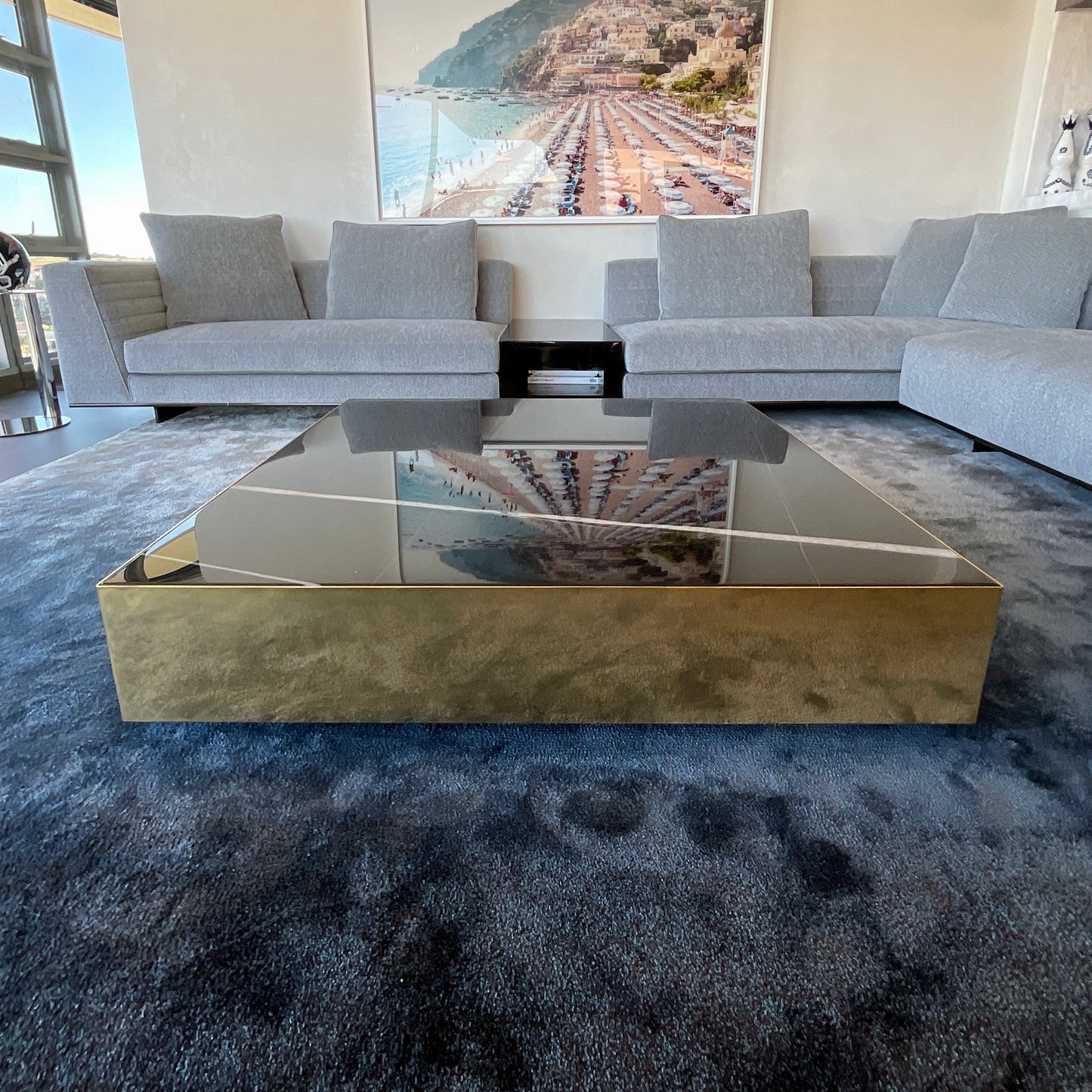 The Elliott coffee tables have been built with a practical internal compartment that can be used for storing magazines or other objects, and comes in a glossy granite-coloured lacquered finish or in oak in an open pore moka-coloured lacquered finish. The complex precessing work of combining an external metal frame with an internal wood frame, adds a touch of warmth and highlights the intrinsic value of Elliott coffee tables. The table we have on offer Minotti Elliott Coffee Table Polished Gold Plated Structure With Sahara Noir Marble Top