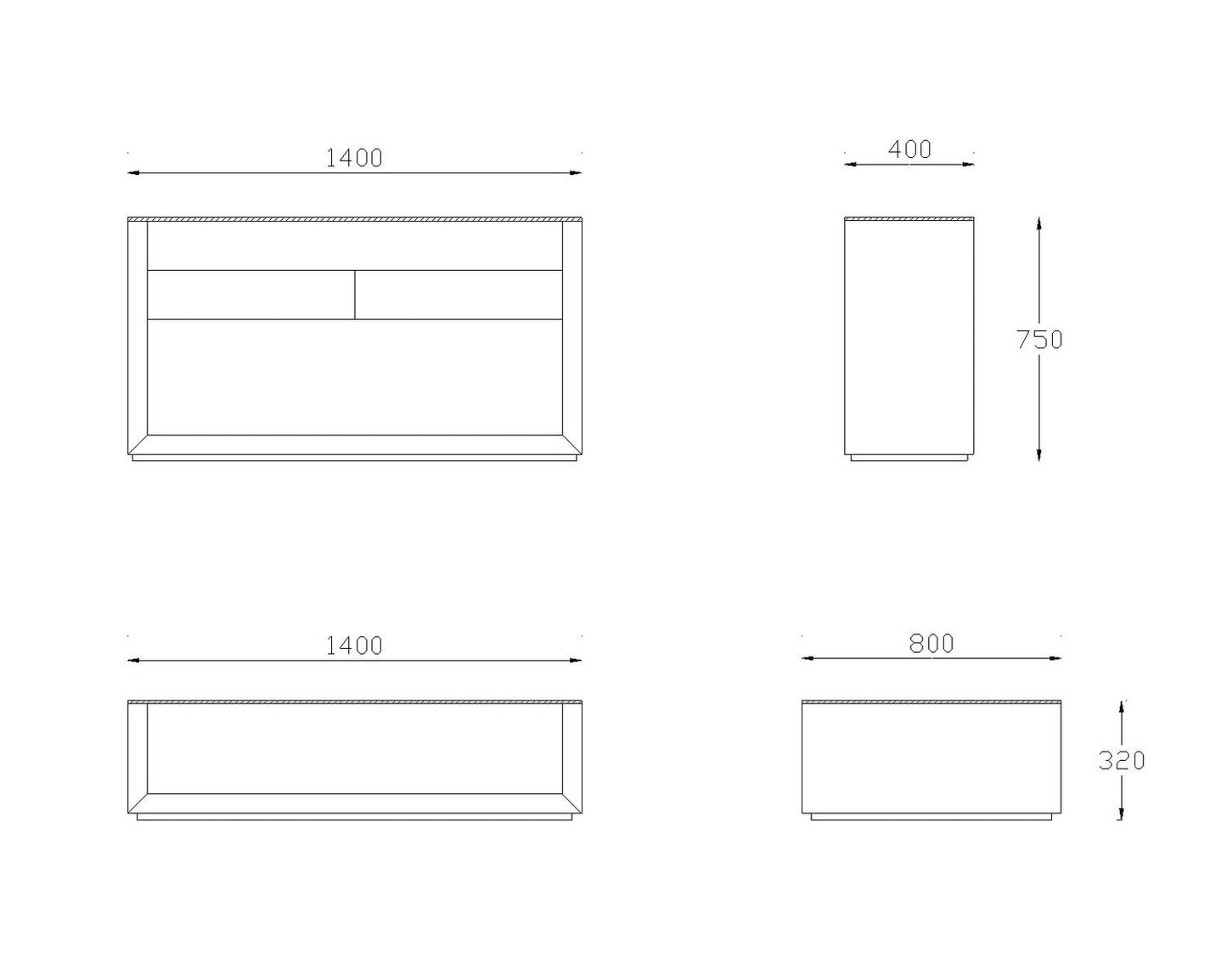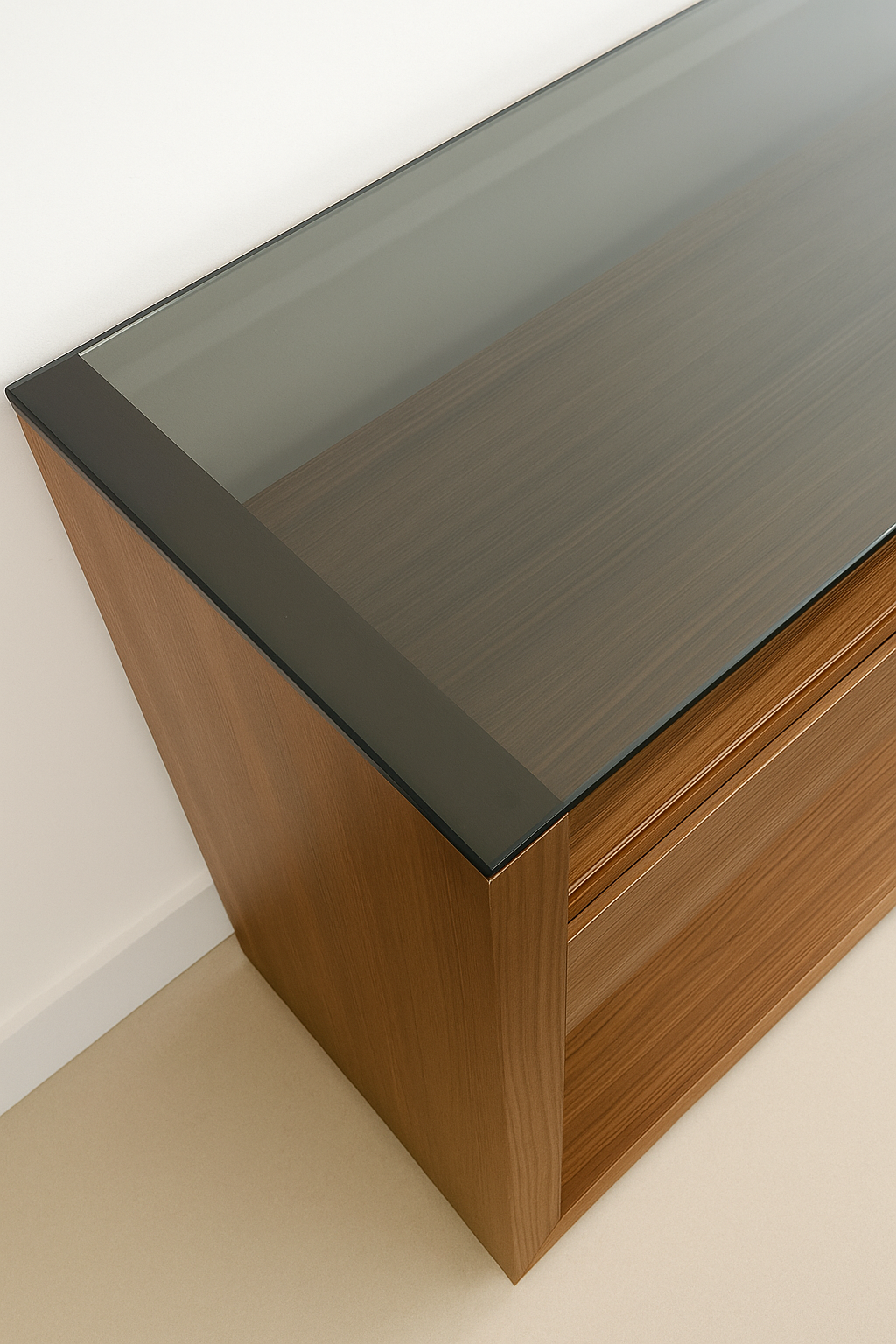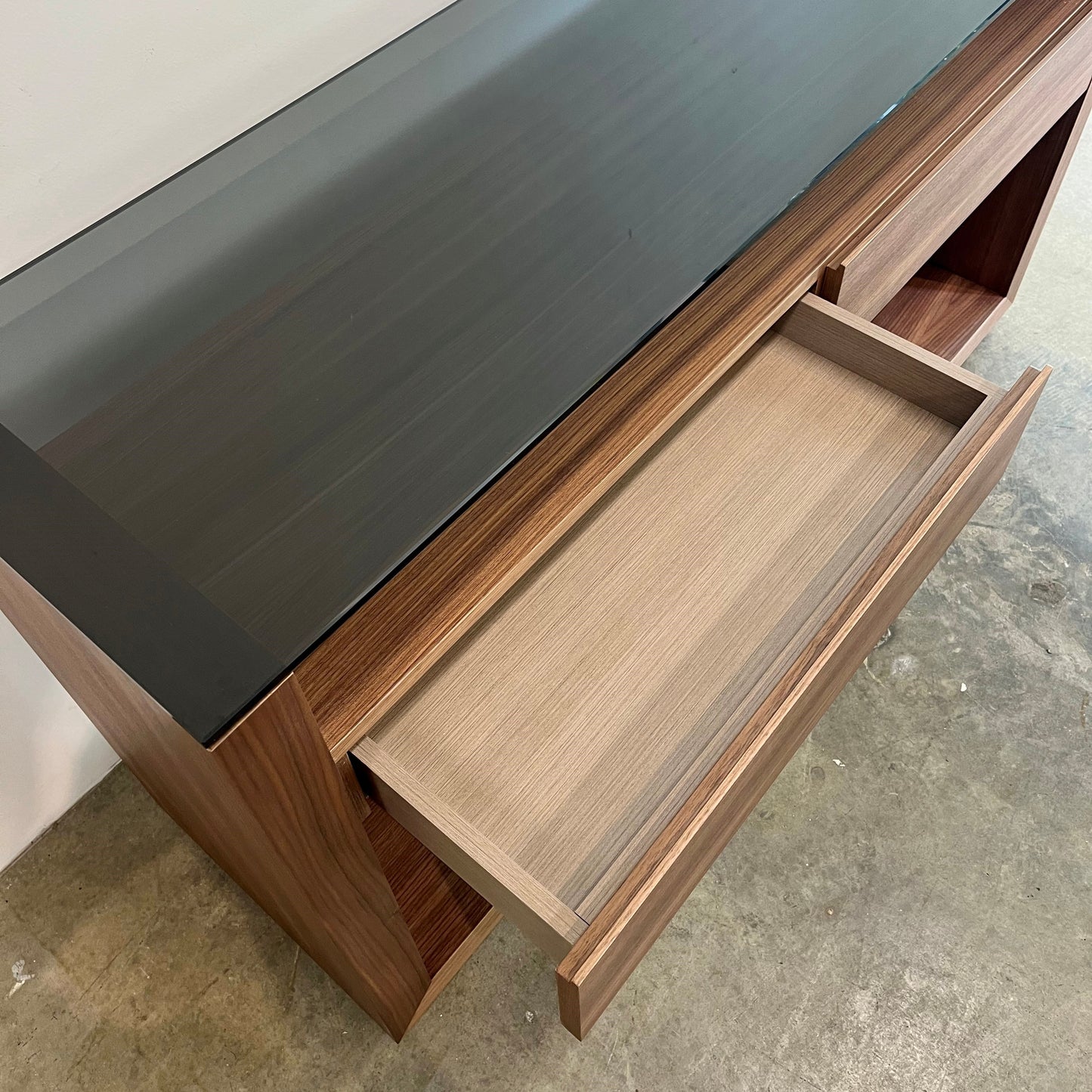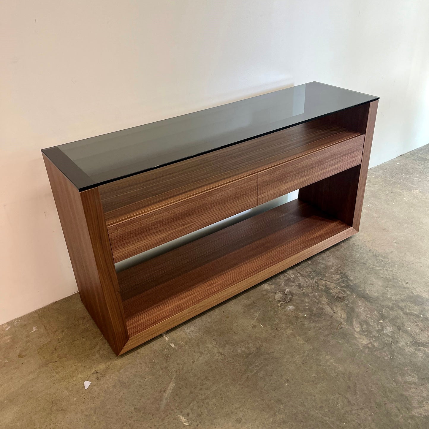 Classic minimalist design. The land console is in American Walnut with a grey tint glass top. There are two pullout drawers and an open shelf above and below.