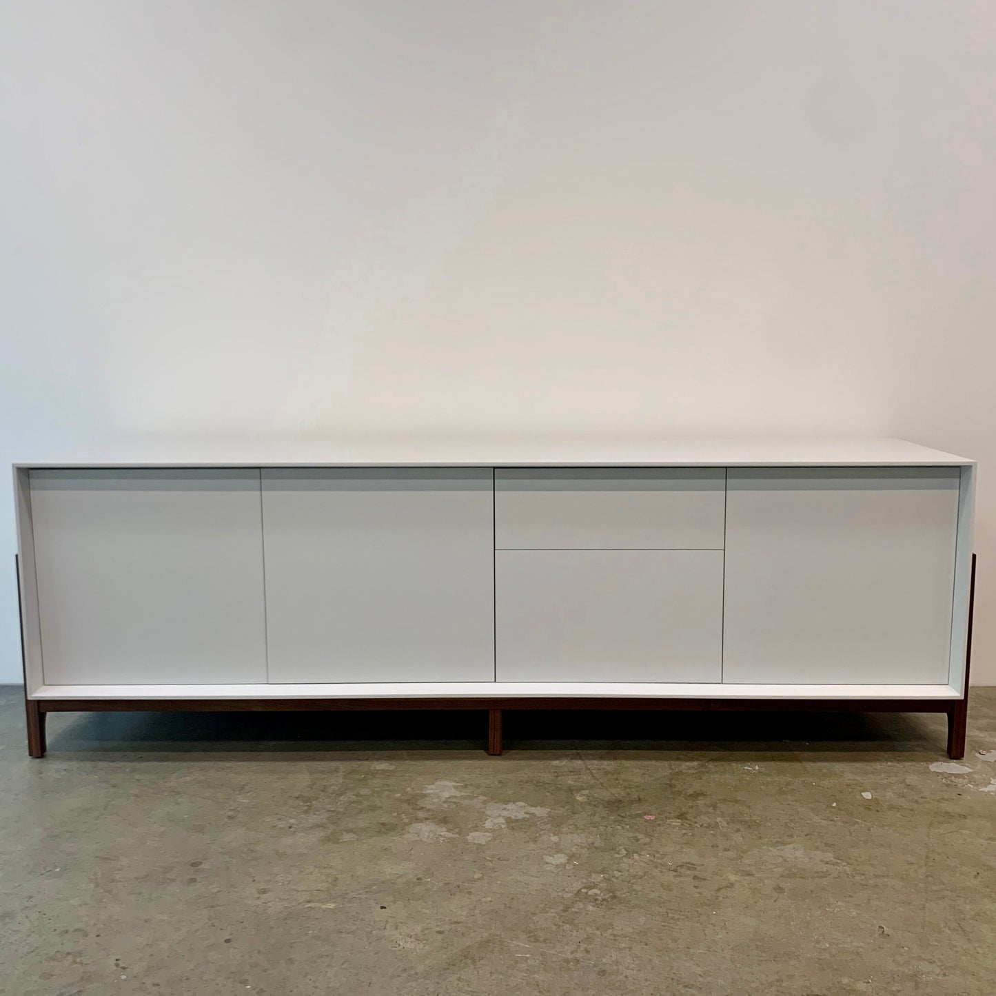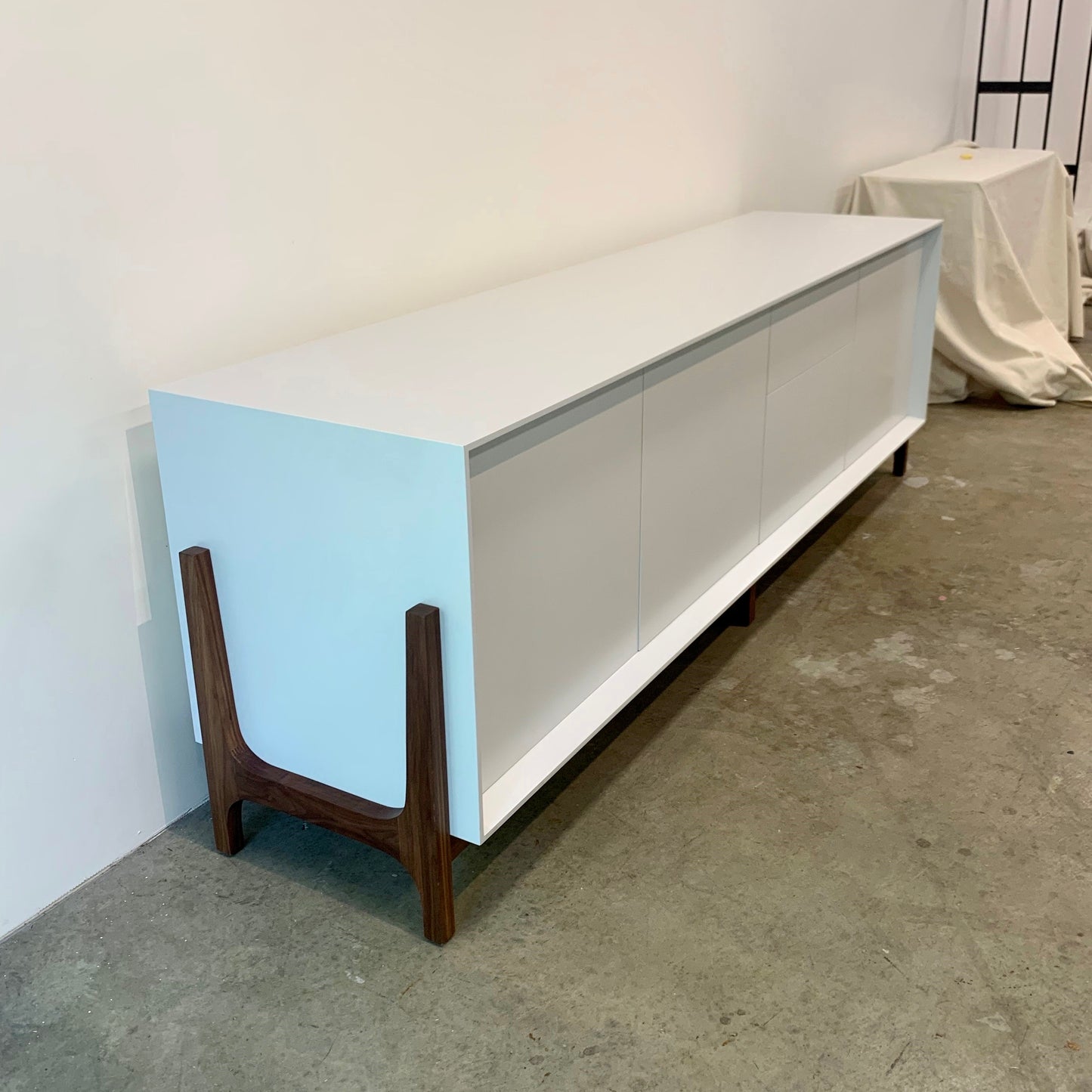 Sideboard with doors and drawers. Unique side fit solid timber leg and frame structure. The sideboard we have on offer is in soft white with American Walnut legs.