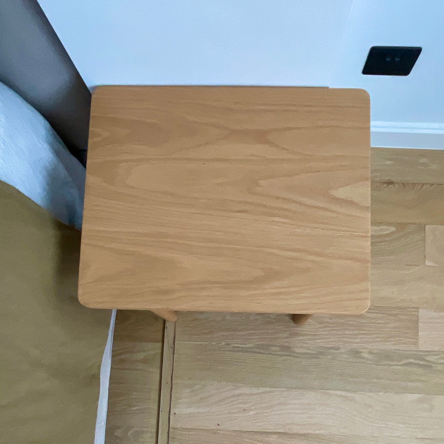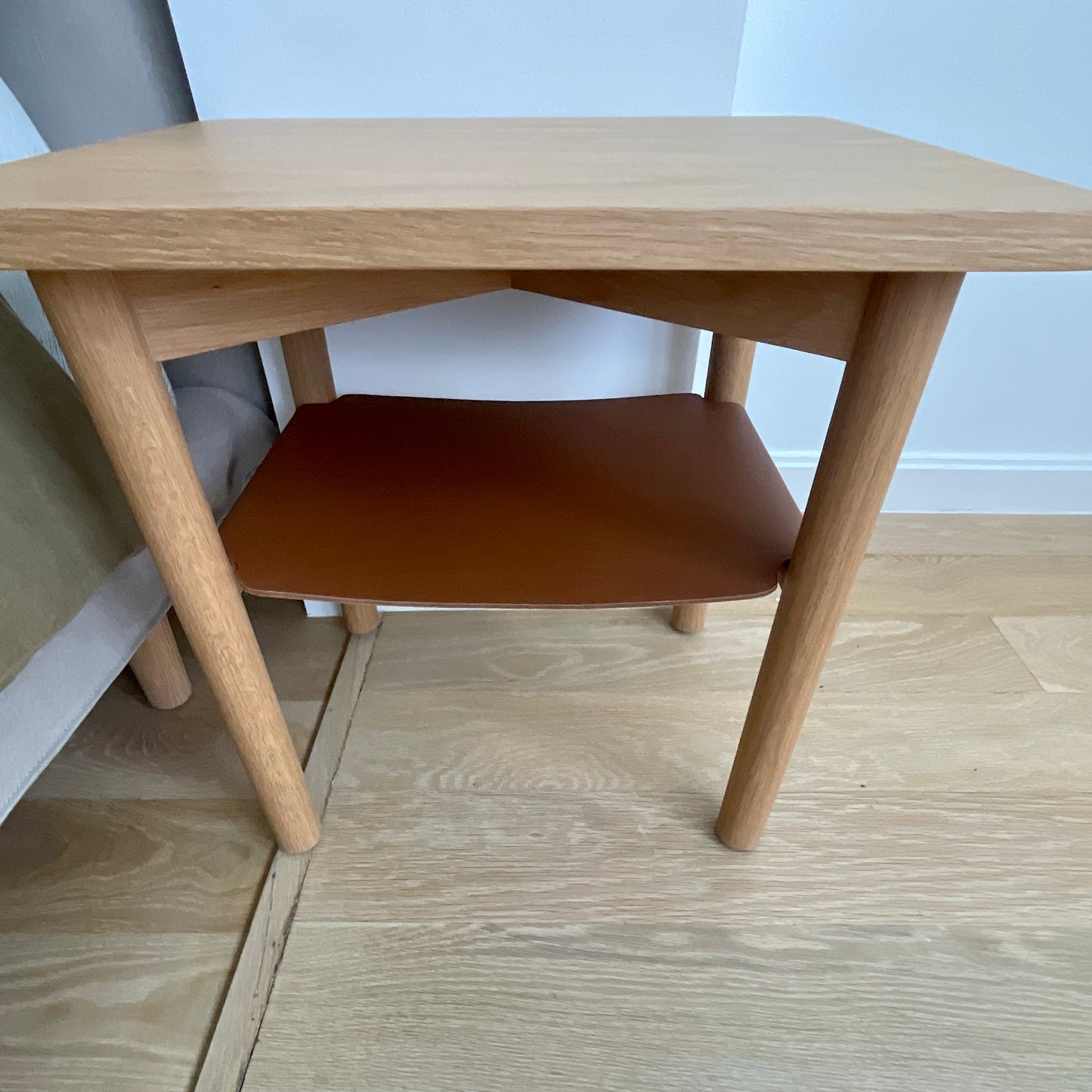 Simplicity, material truth and natural warmth provides Tuck with exceptional quality. The tables we have on offer are in Raw Oak with a tan leather shelf.