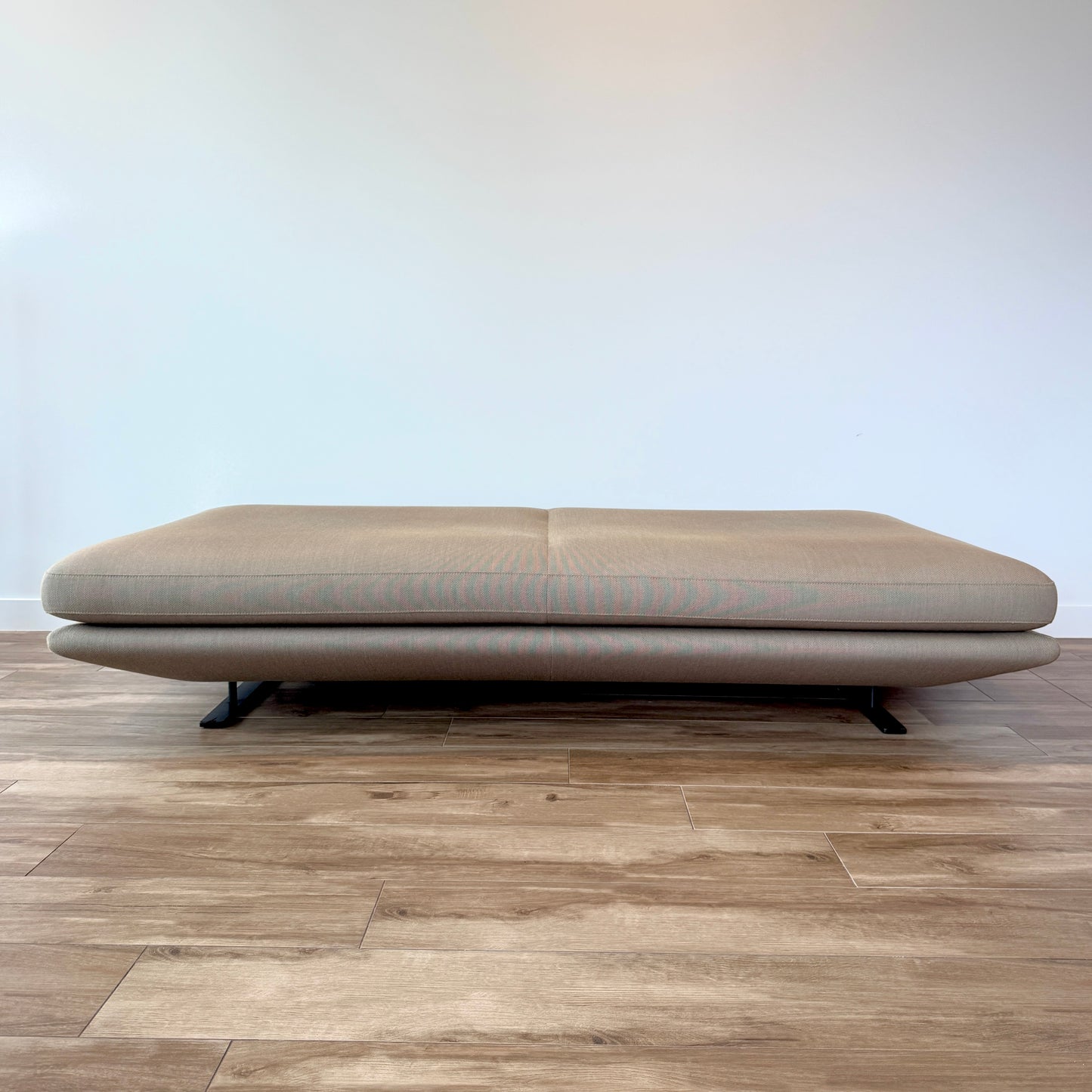 Construction: seat structure in panels of chipboard, webbed and clad in foam and quilting. Seat cushion in polyurethane foam and quilting. Back cushion is injected foam moulded onto a metal insert, equipped with elastic webbing and with a compartmented goose feather-filled comfort layer (10 % down / 90 % feathers) with quilting, plus an anti-slip system. The modular system we have on offer has a three seat section 2.5 seat section and ottoman so could be set up separately as shown or in a corner unit (see images)