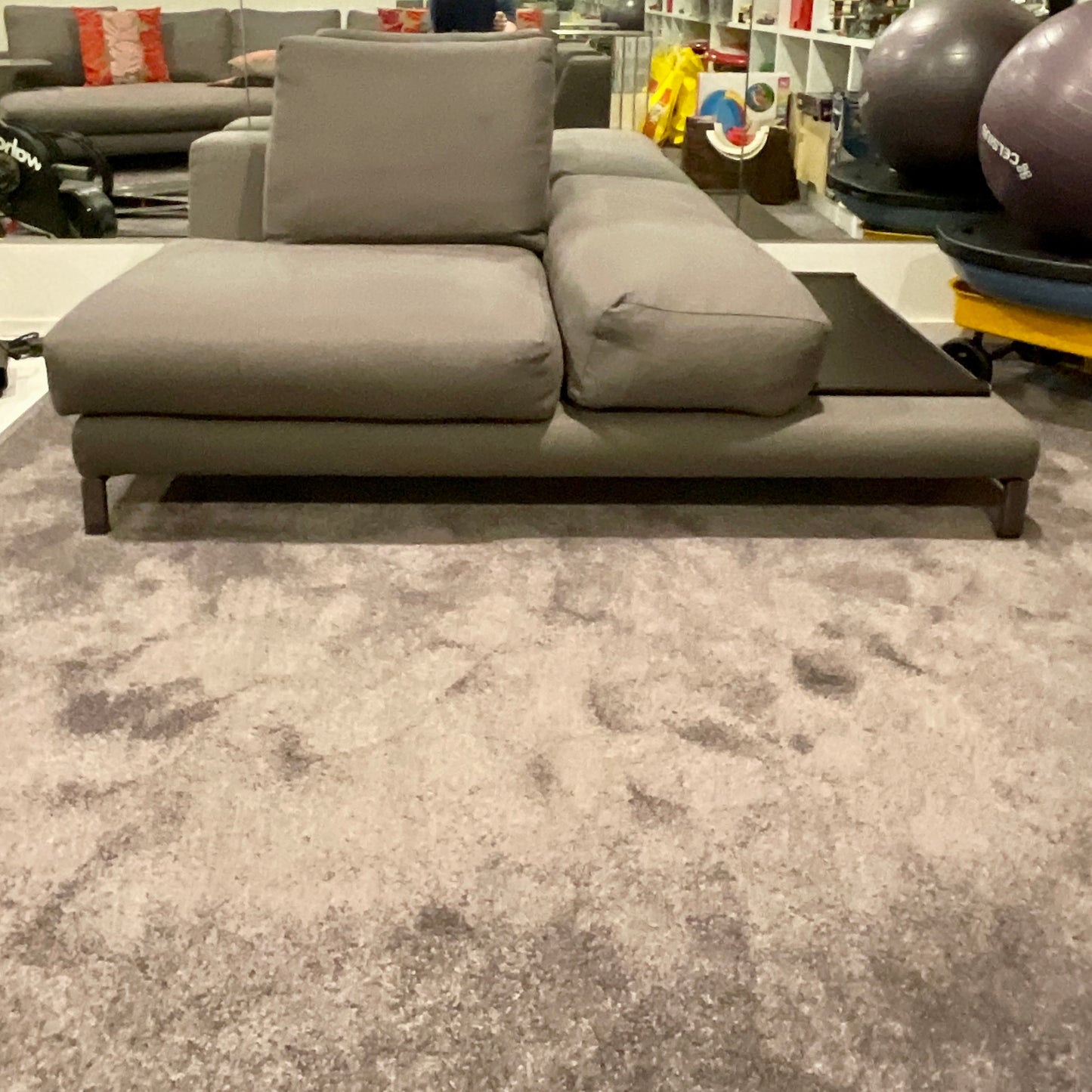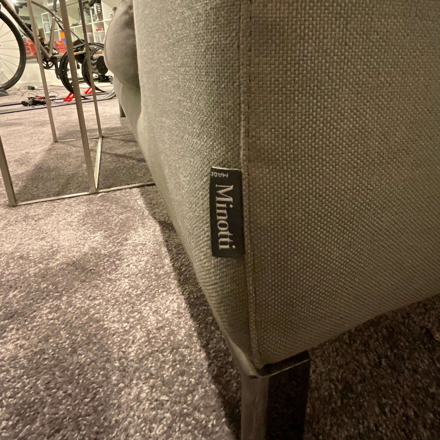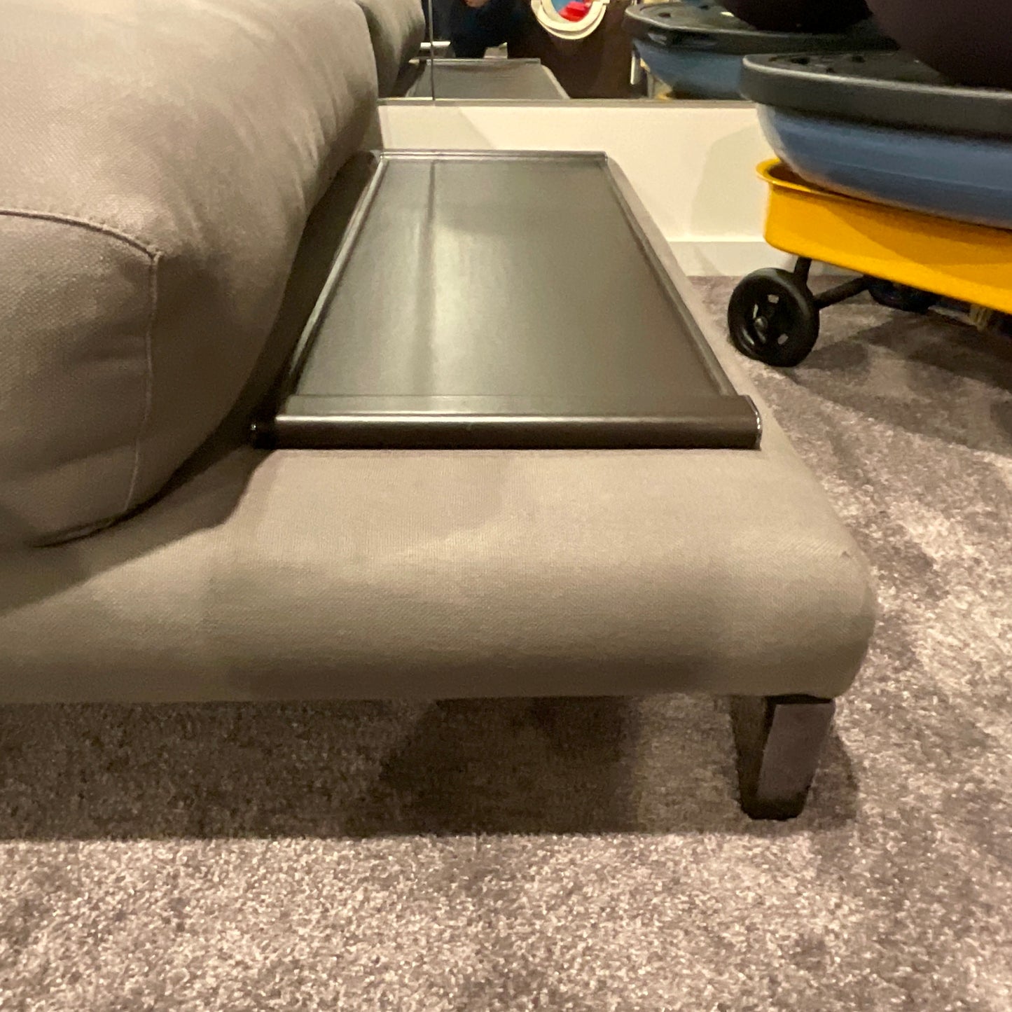 The sofa we have on offer is upholstered Cat F Fabric. Art 13 Senda - Colour Elephant fabric with bright black nickel base. There is also a brown saddle leather tray included 800 x 300.