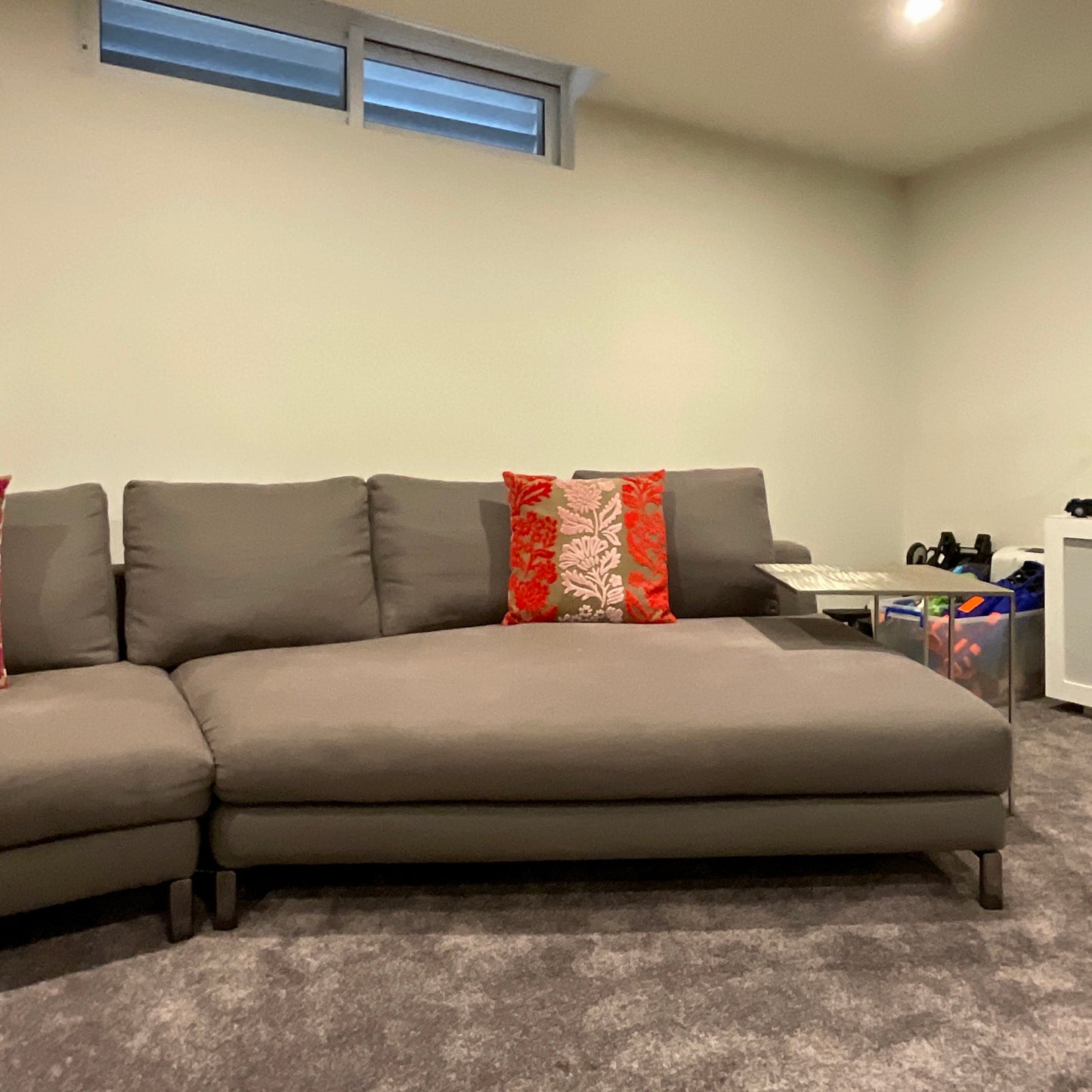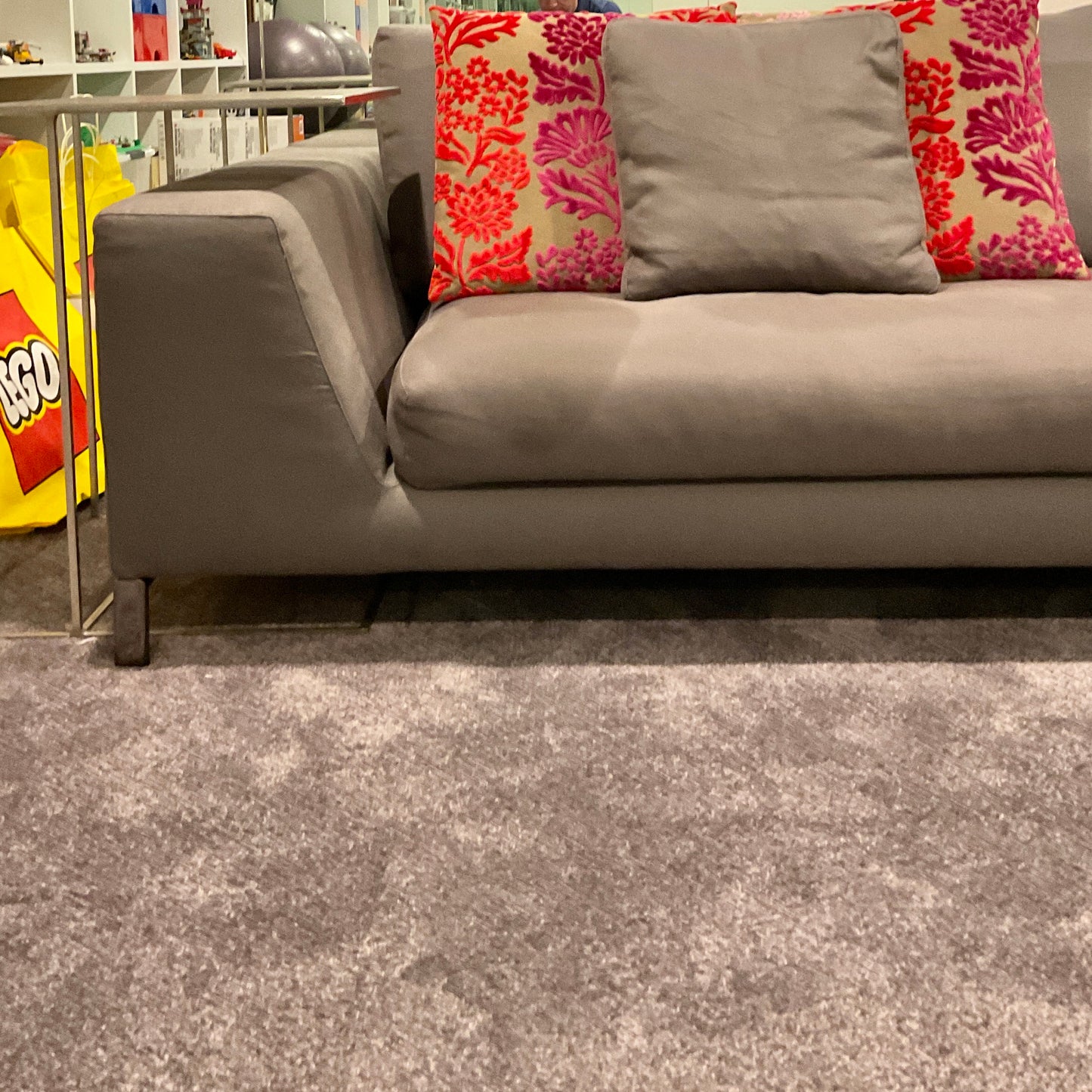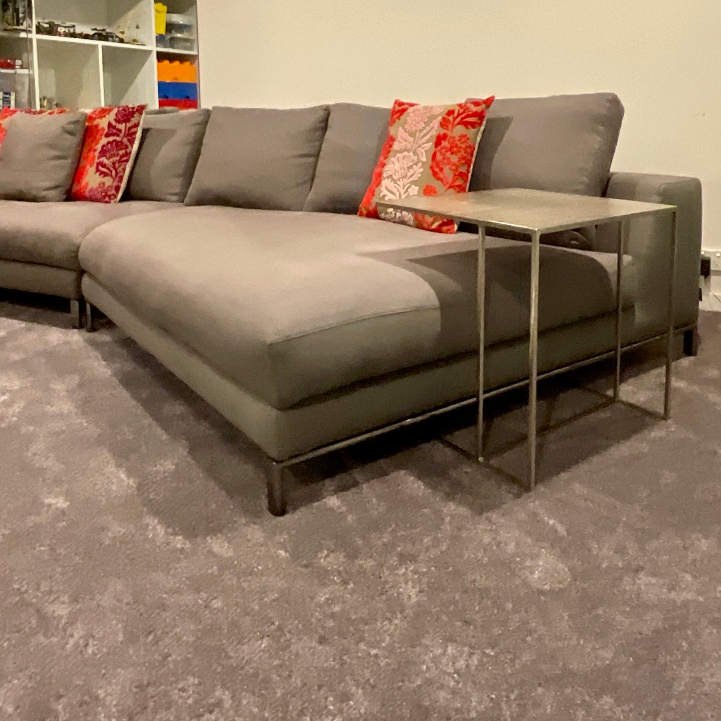 The sofa we have on offer is upholstered Cat F Fabric. Art 13 Senda - Colour Elephant fabric with bright black nickel base. There is also a brown saddle leather tray included 800 x 300.