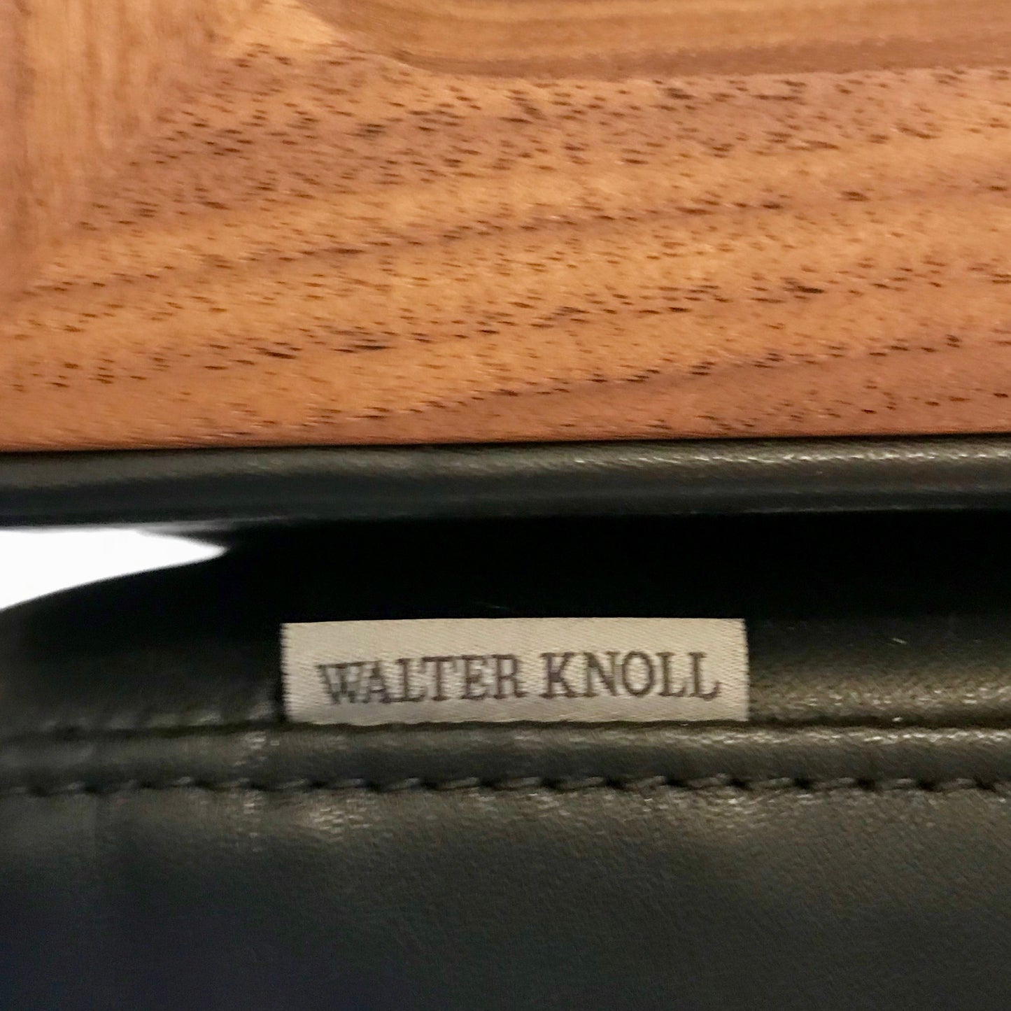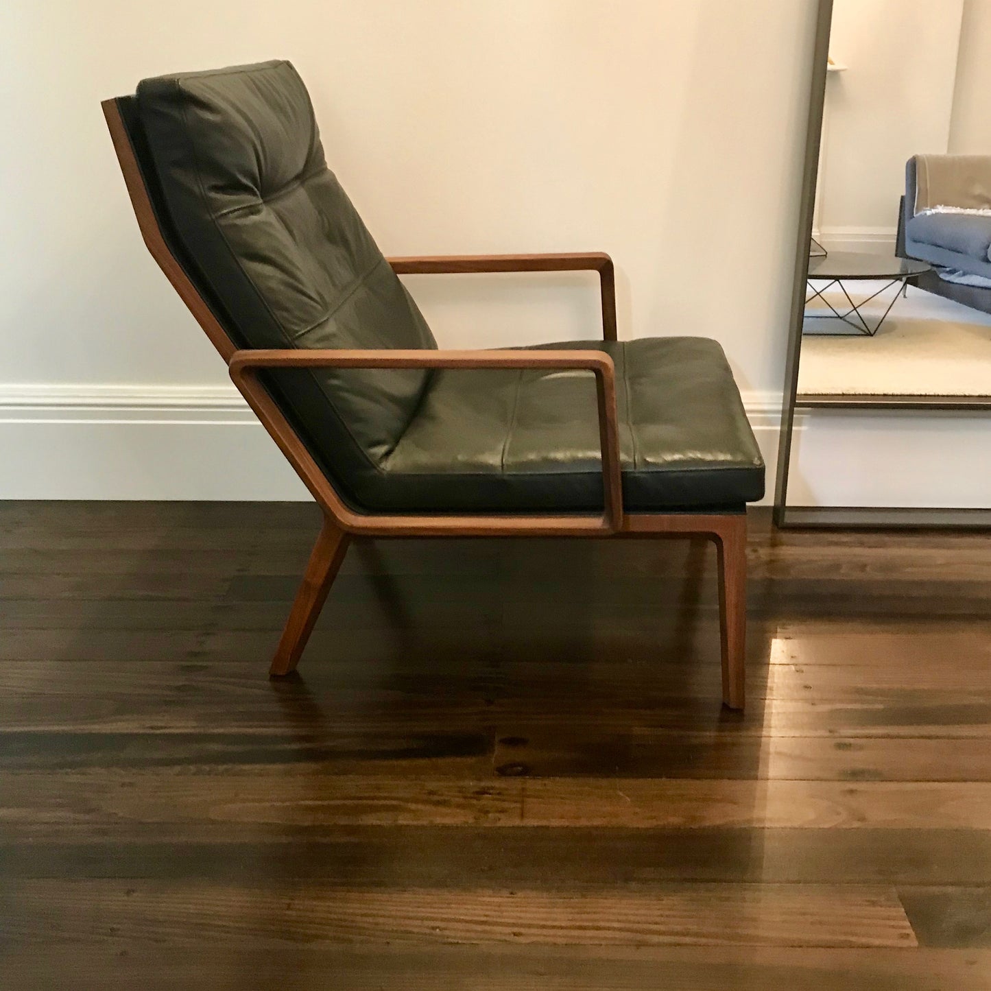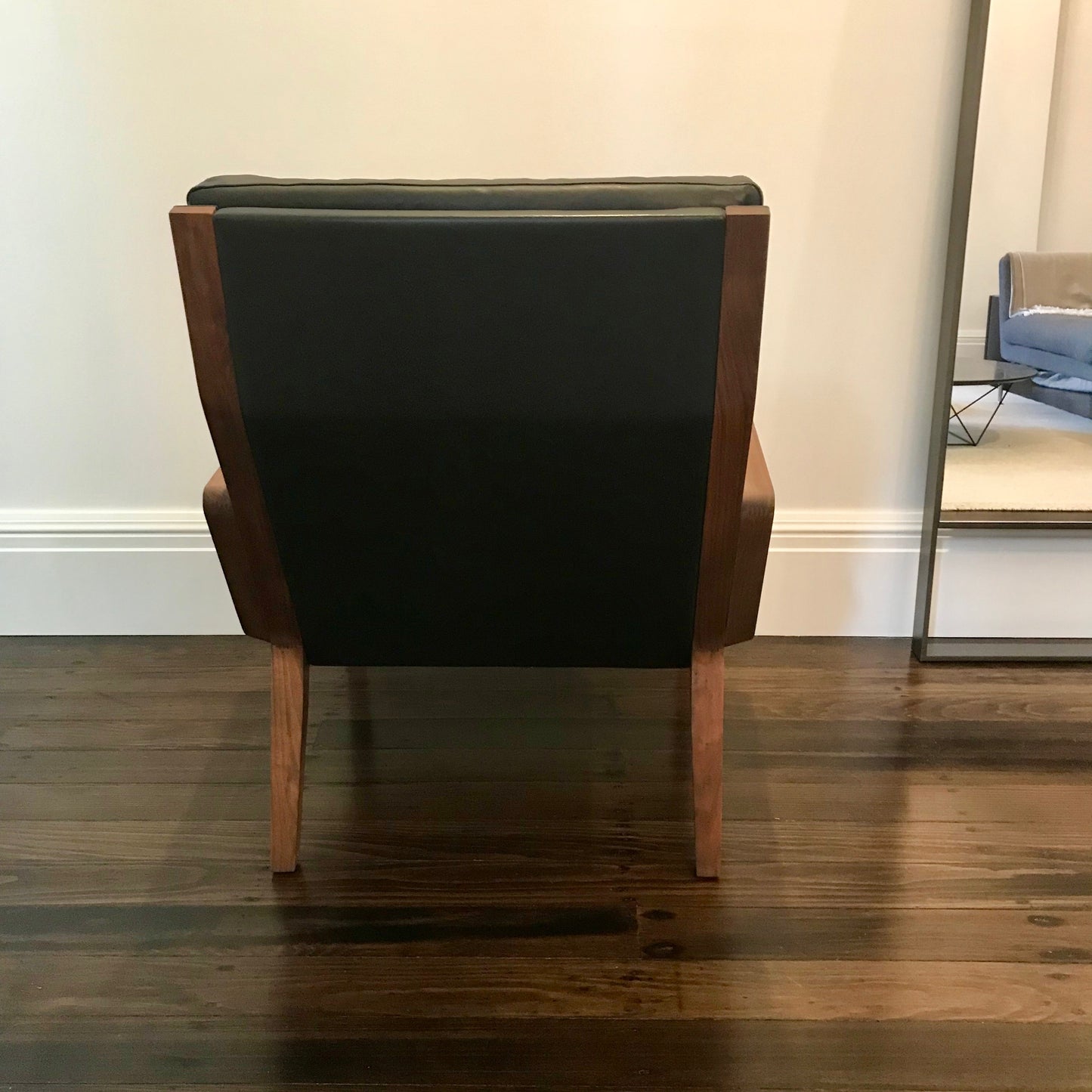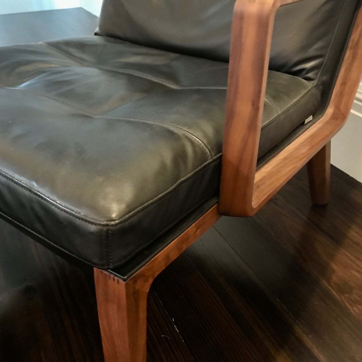 Inviting upholstery, soft leather with integrated piping, wood delicately shaped towards the inside complement each other to create a fine armchair. Simplicity as a highly complex art. Andoo looks familiar and excitingly new at the same time. The chair and footstool on offer has a solid wood frame with black leather upholstery.