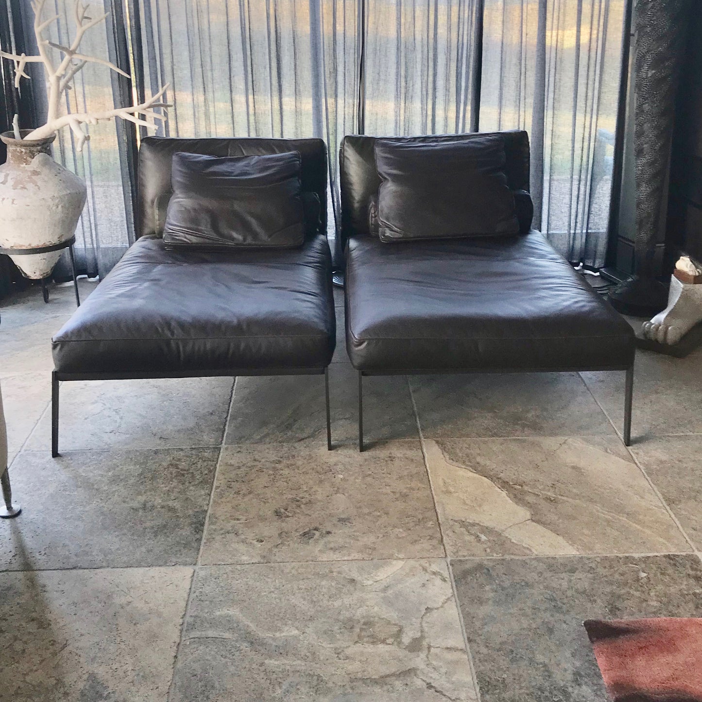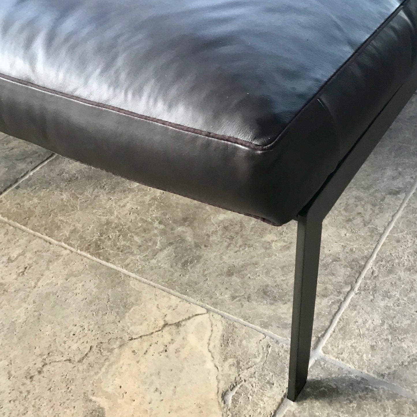 The Arc Chaise Lounge is a contemporary take in a classic theme. This graceful design raised on streamlined dark steel legs, invites you to lounge and relax. Delicate piping and woven leather back completes the look with an attractive touch. The chaise we have on offer is in a dark brown leather.