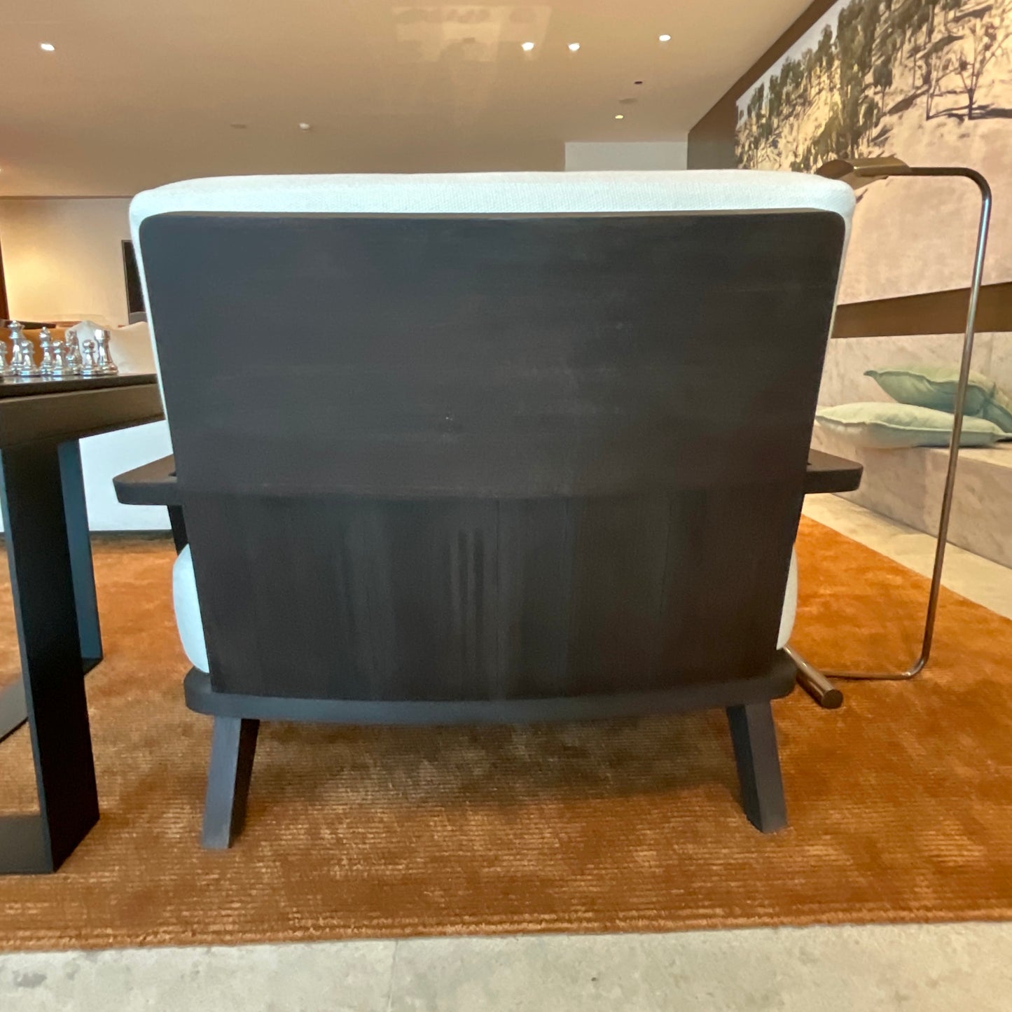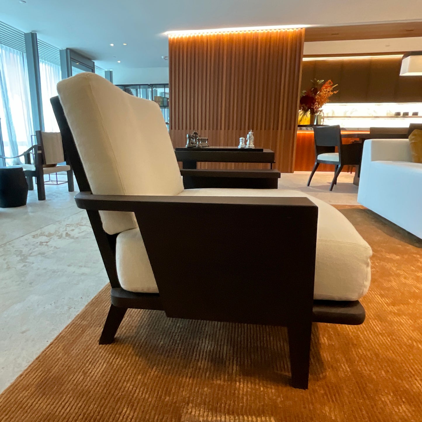 Wood frame lounge chair in solid Wenge, open grain with a Natural, Oiled finish. Chair has a loose back cushion and loose seat cushion upholstered in fabric.