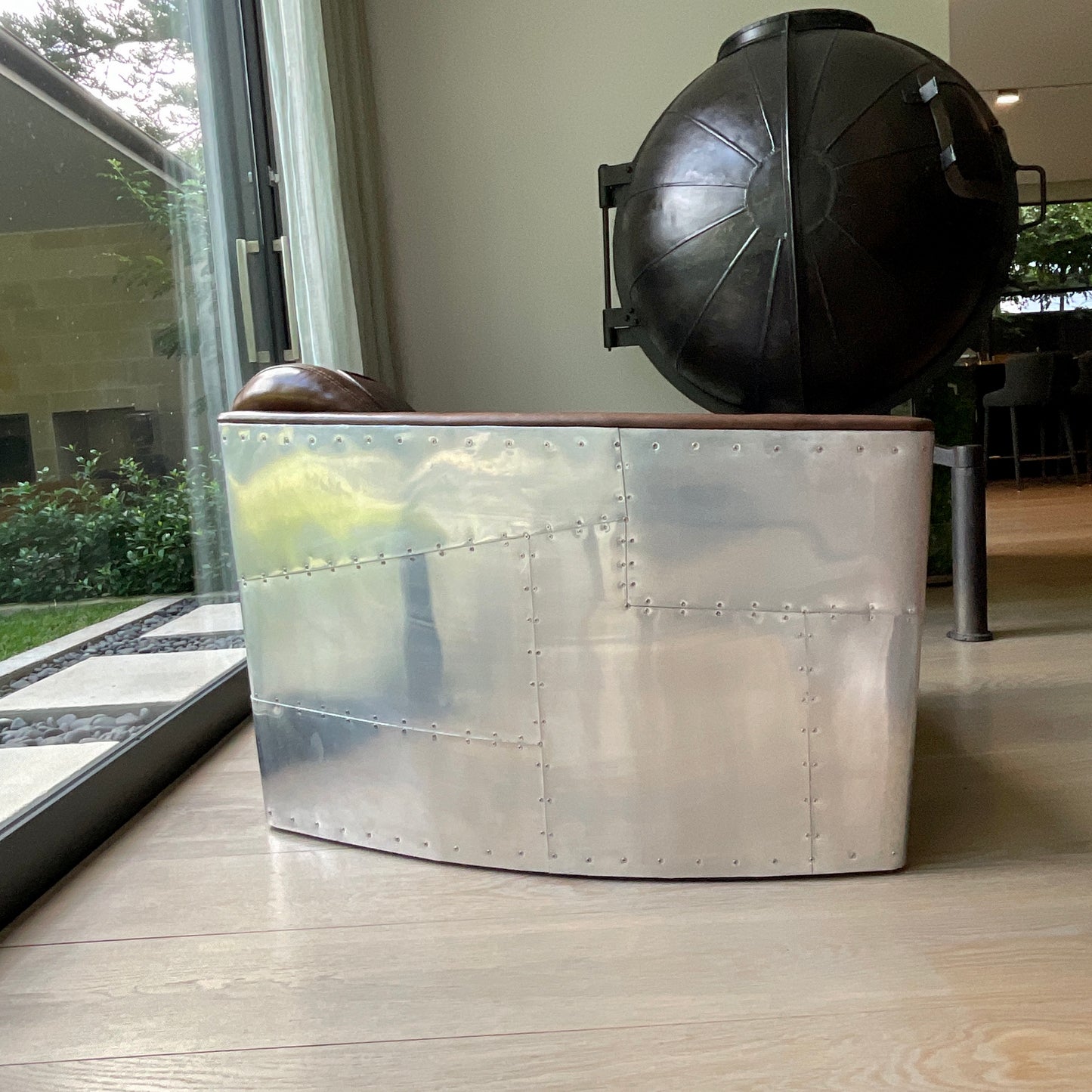 The Aviator Tomcat chair takes its cue from military aviation history, inspired by the twin-cockpit seats of the F-14 Tomcat which was deployed by the U.S. Navy for some of its most prolific missions in the 1970s. The chair's aerodynamic curves are hugged in riveted aluminum, inspired by the World War II British Supermarine Spitfire, put through a five-stage process to distress the metal and create the unique Spitfire finish. The seat and back are swathed in ribbed leather, distressed by hand to emulate the worn-down softness of a vintage bomber jacket. Please note, the Spitfire finish features surface distress variations, which may vary from piece to piece. The chair we have on offer is in brown leather.