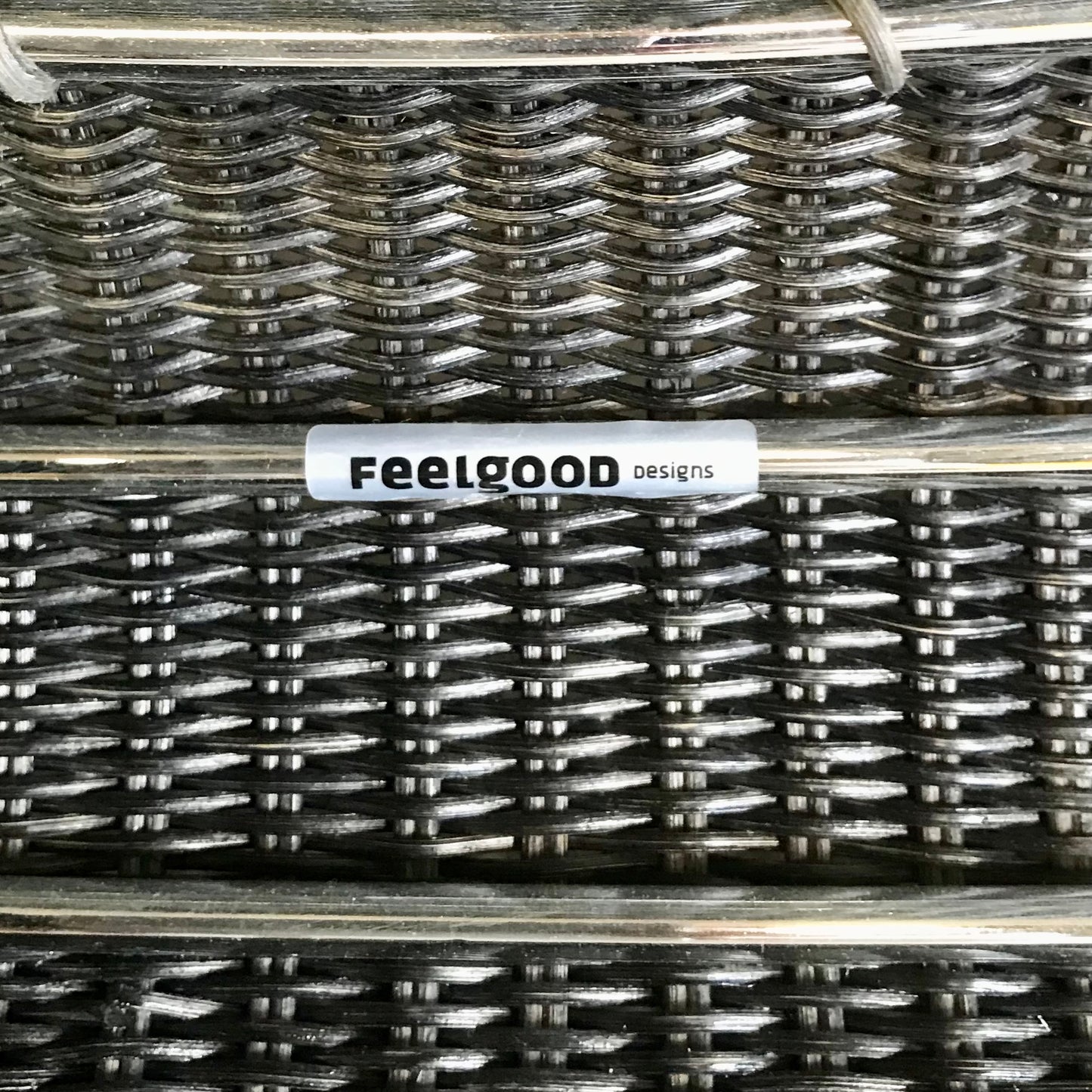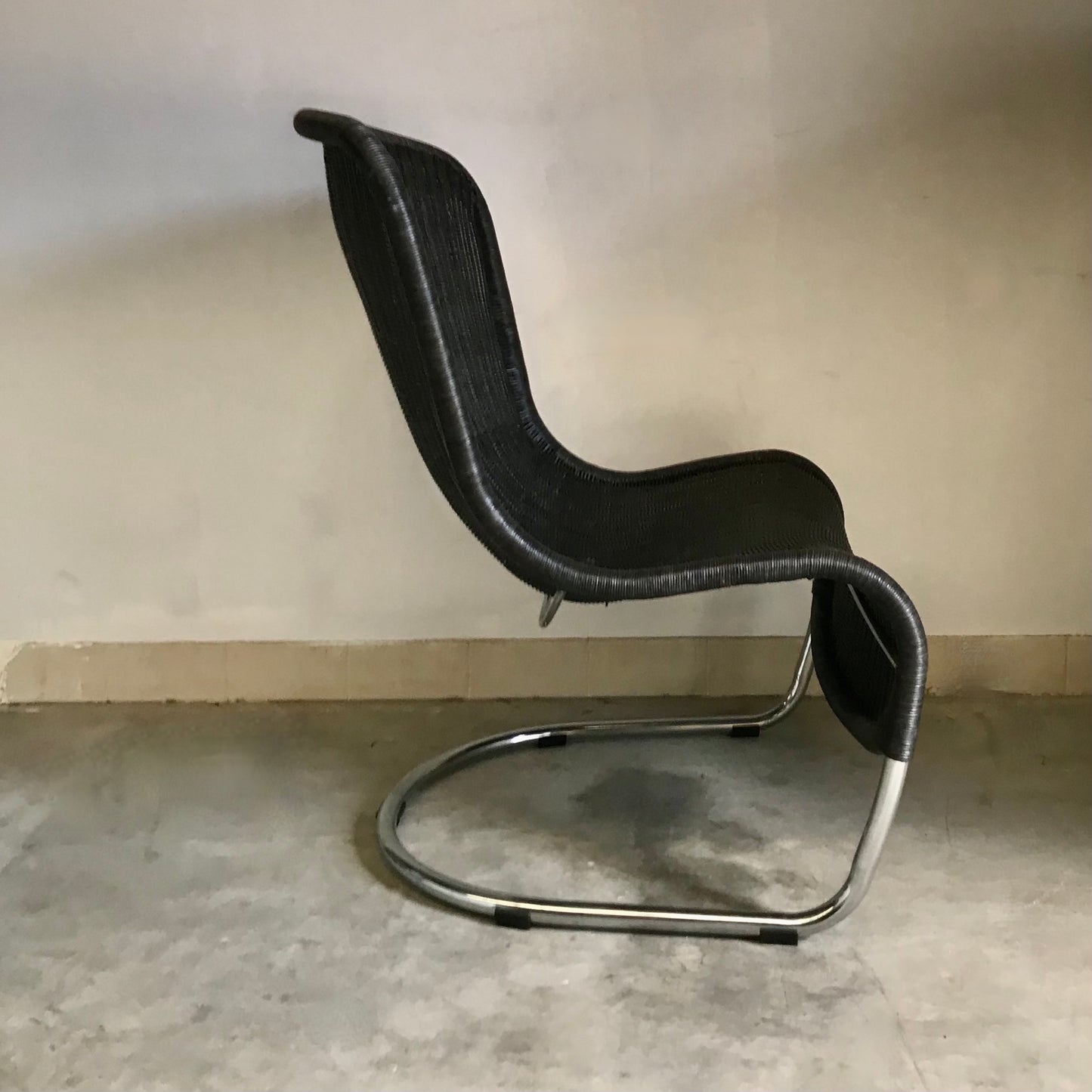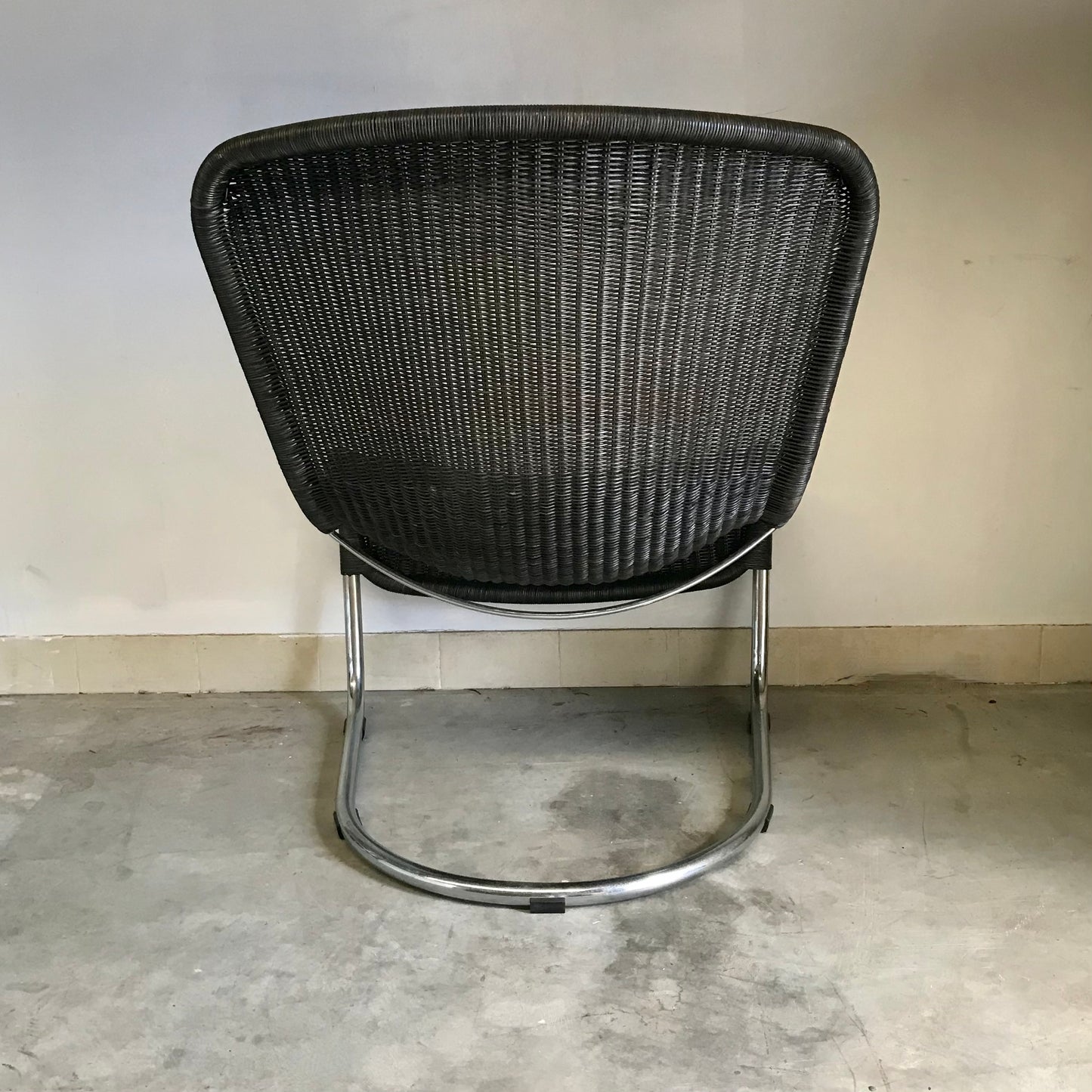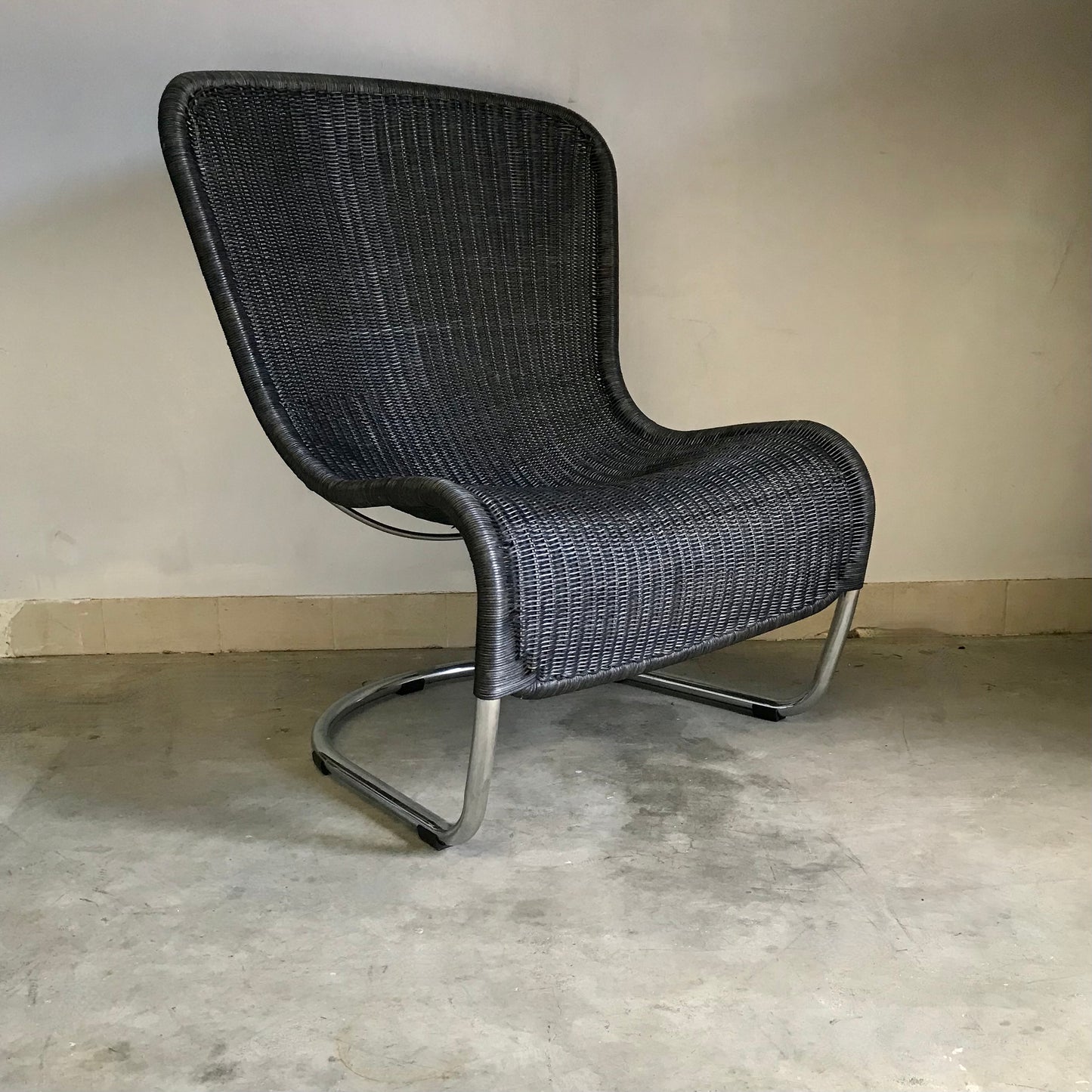 The Cantilever Chair by Yuzuru Yamakawa has a chrome frame with charcoal rattan.