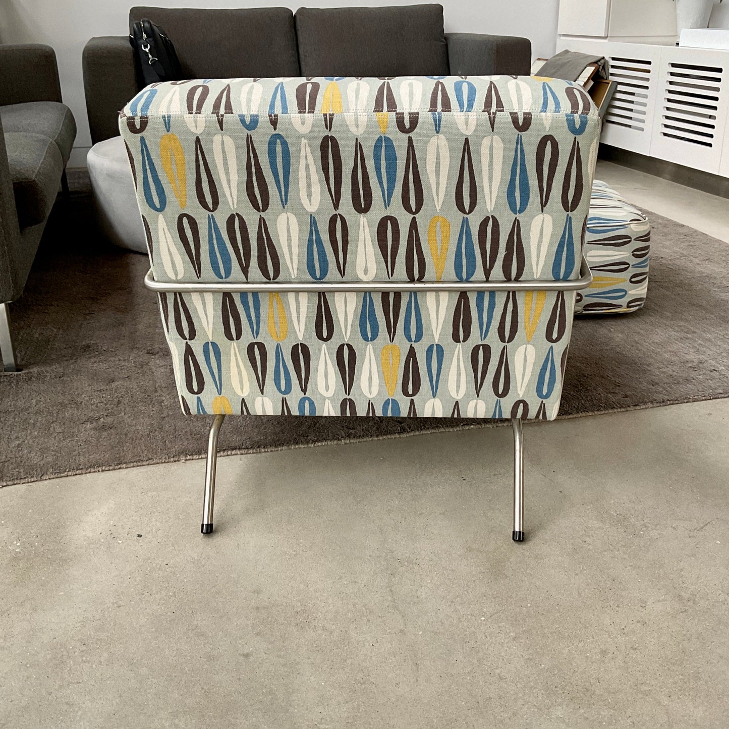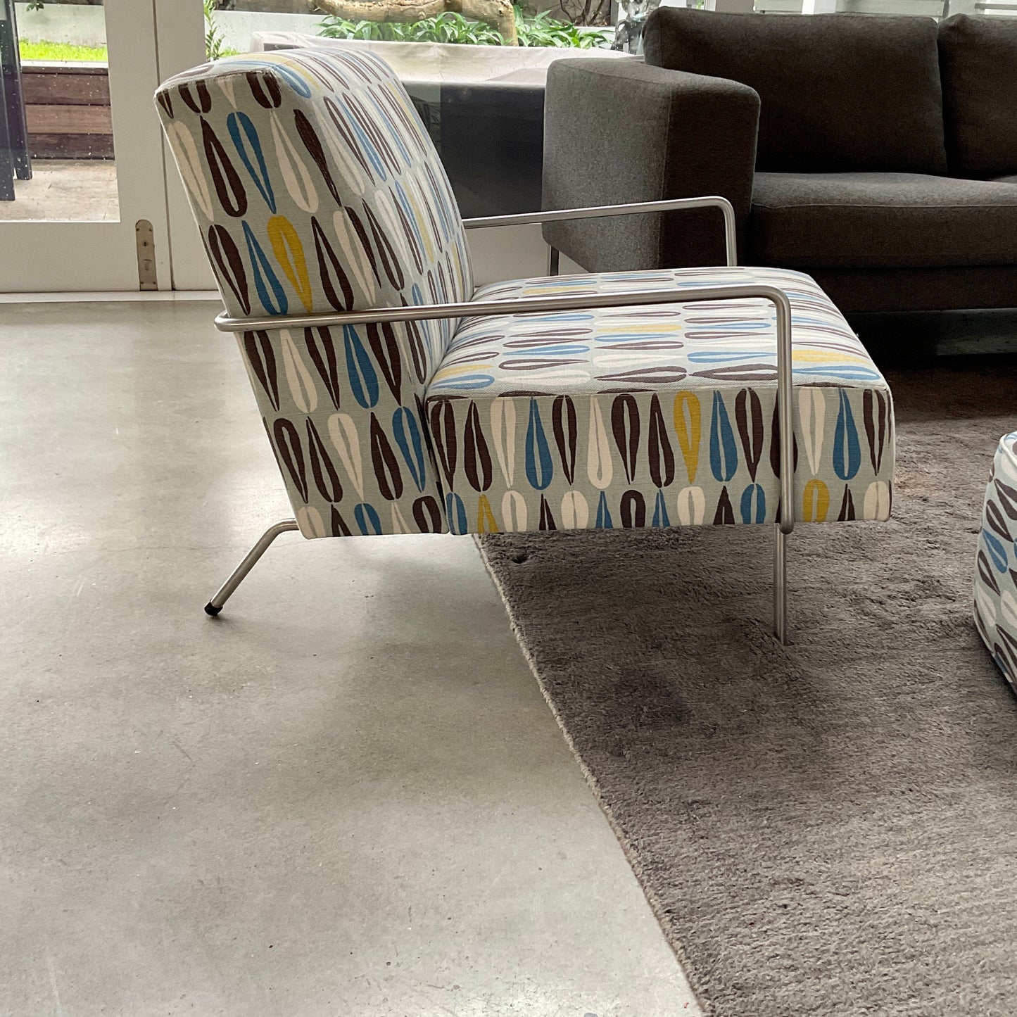 The Grace is a generous low lounge chair with a linished stainless steel frame. The chair and custom footstool are upholstered in a custom Norbar USA fabric.