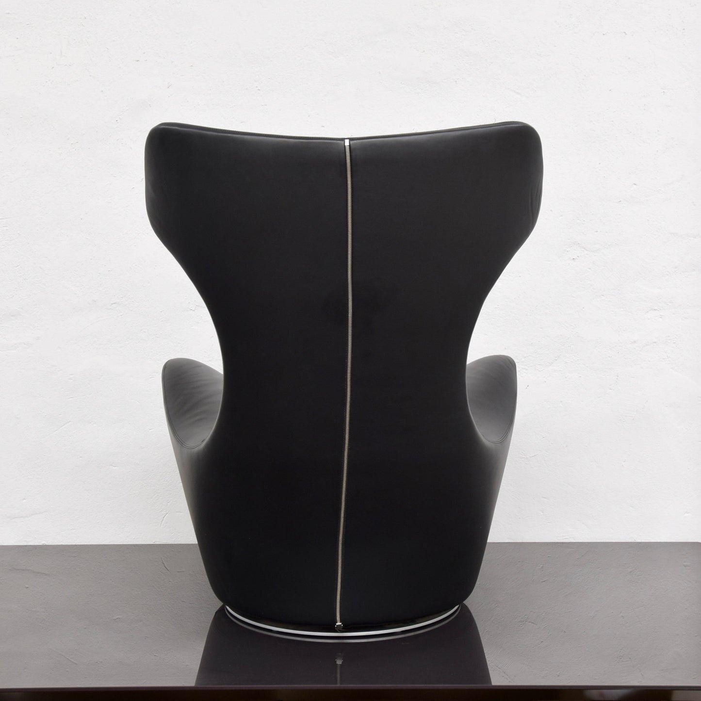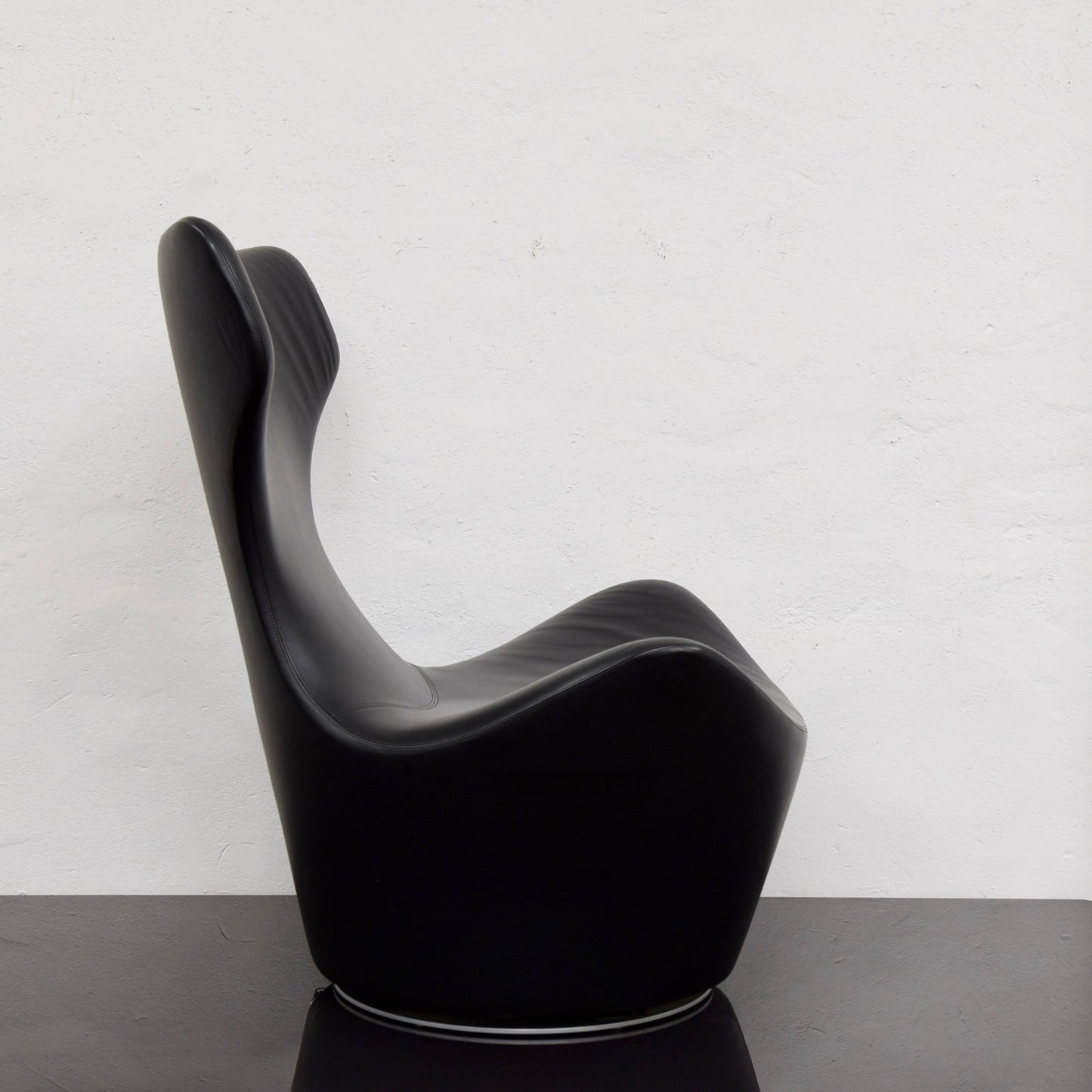 The Grande Papilio armchair is designed by Naoto Fukasawa for B&B Italia. An organic design with fluid curves, for ultimate comfort and relaxation. As with the original Papilio chair, and not only due to the zip along the back, the Grande Papilio armchair appears as a single form made of a single material. Its shape is a fluid design carved out of the trunk of an upside-down cone, where the roomy upper part and backrest are truly pronounced, offering the ultimate comfort and relaxation. Equipped with a swivel system that provides a 360° view of the room, this armchair sets itself apart thanks to its organic and statuesque design. The chair we have on offer is in black gamma leather.