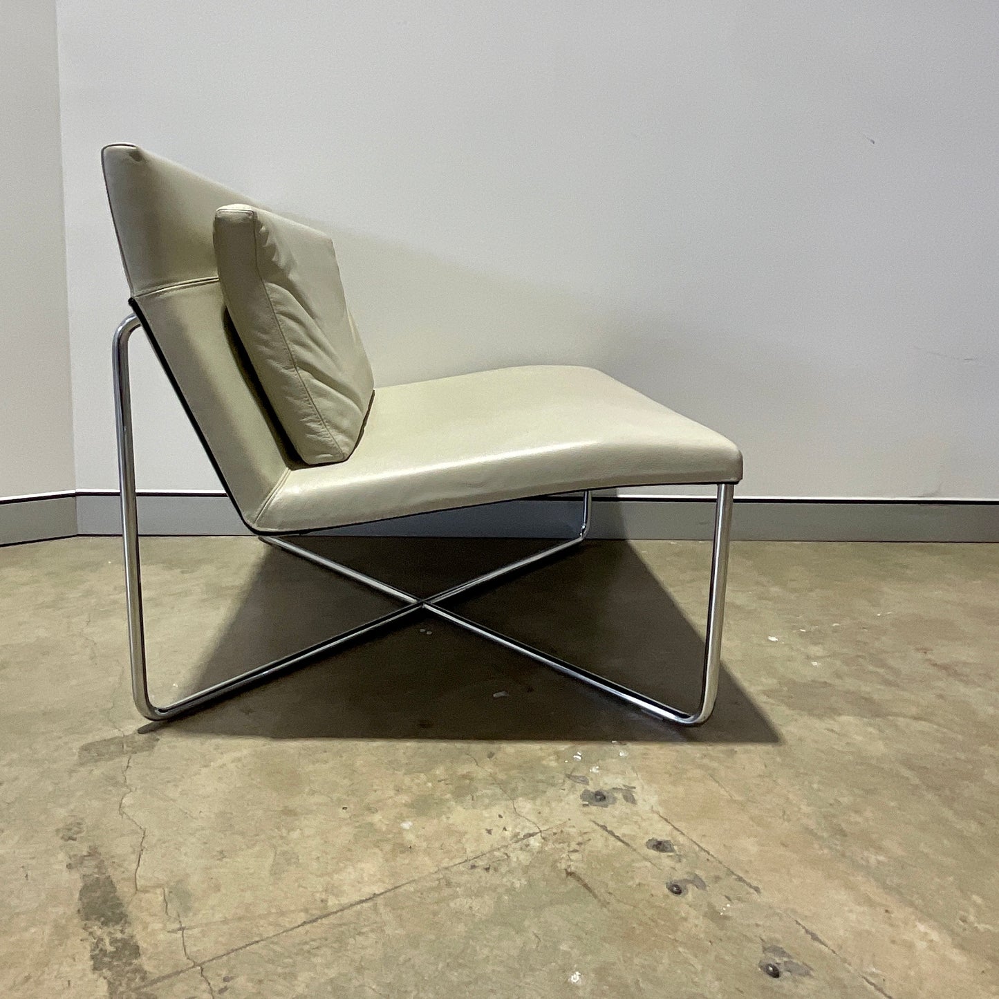 The Held chair is a low slung sculptural chair upholstered in a taupe leather. The chair sits upon a polished chrome X base.