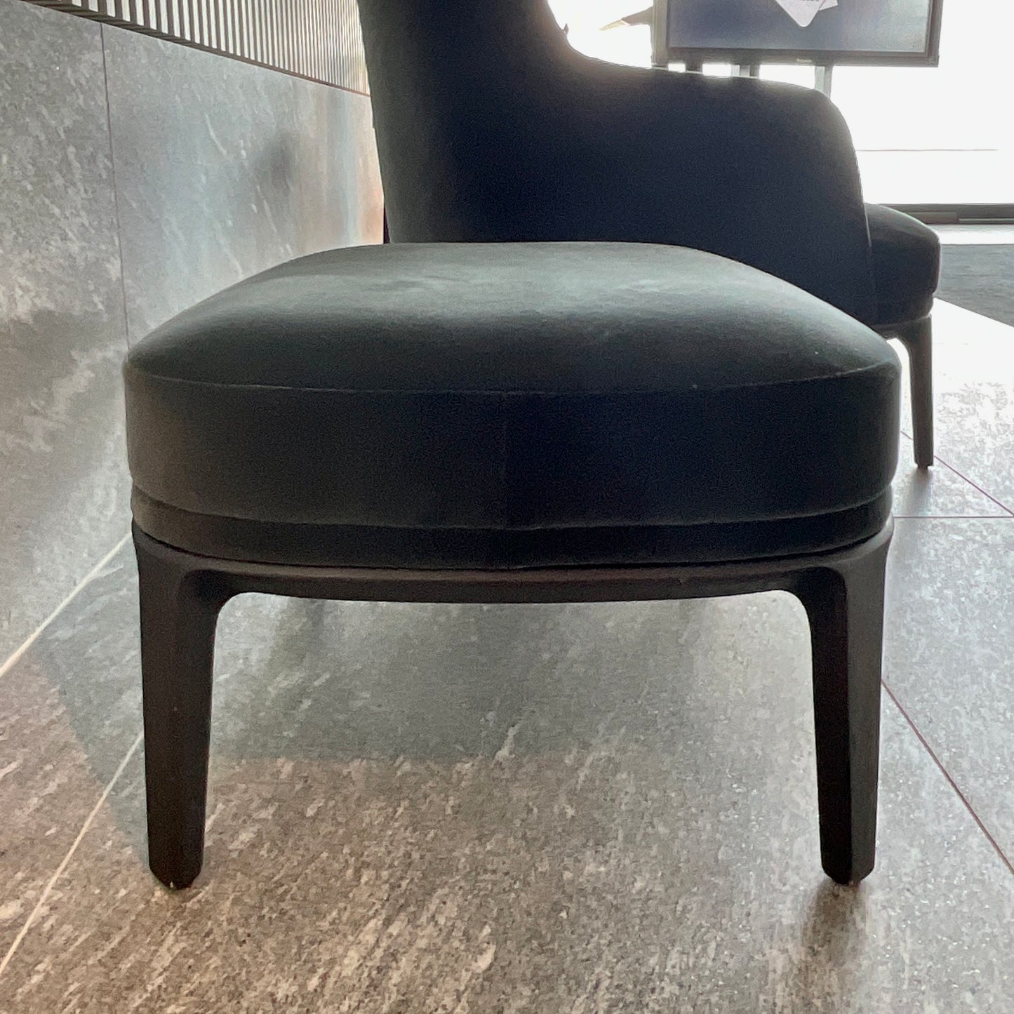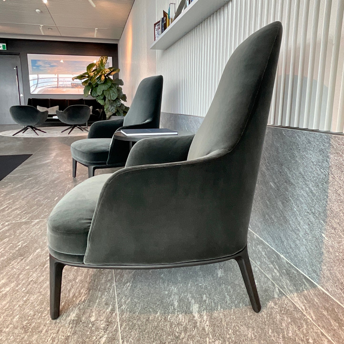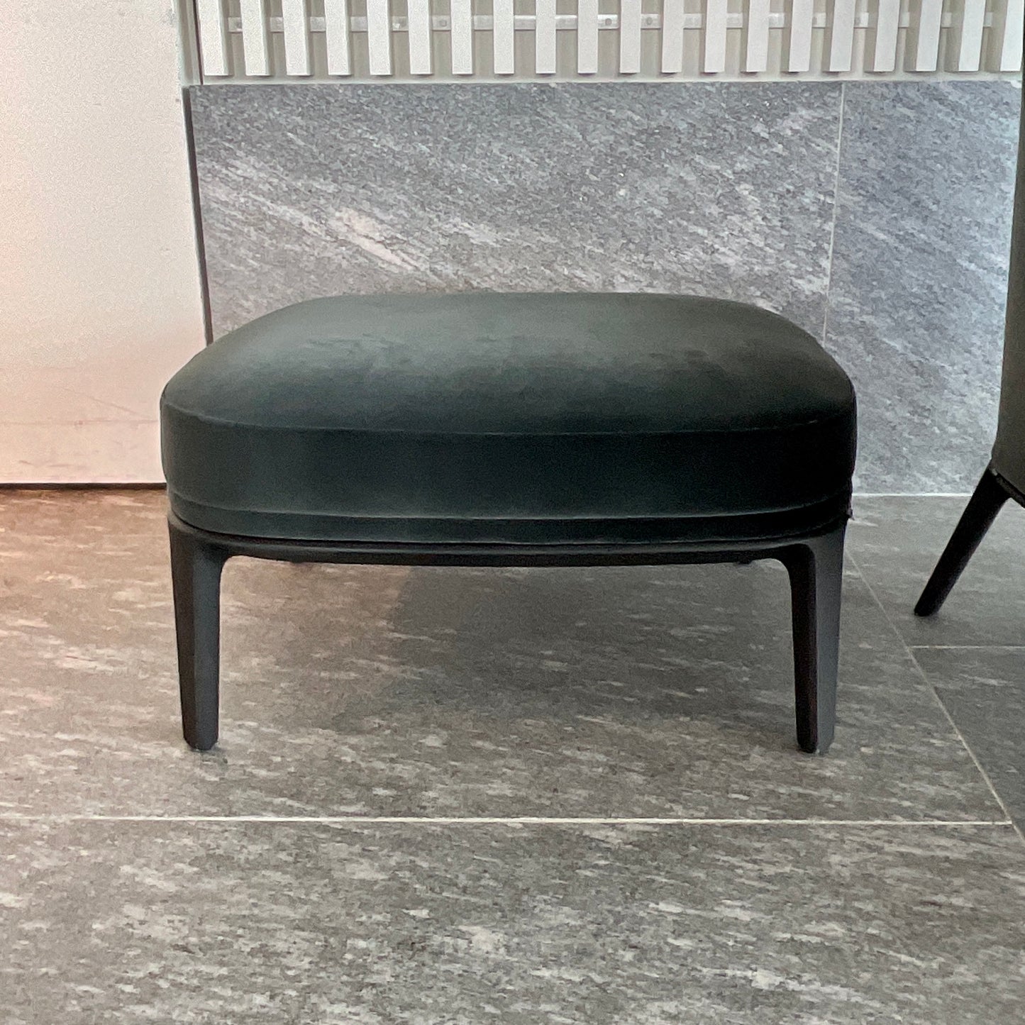 The chair and footstool we have on offer is upholstered in Poliform Velvet Persia colour Carbone.