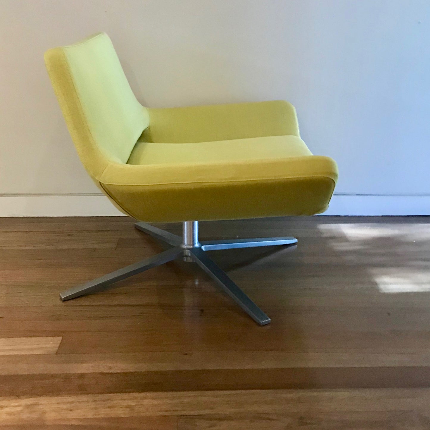 Produced by B&B Italia, Jeffrey Bernett's Metropolitan Armchair is a broad chair for relaxation. A refined design, open and inviting for the user. Seats that flow uninterrupted into the armrests are the hallmark of a small armchair and a relax armchair. The small Metropolitan armchair on a revolving aluminium base with four spokes looks inviting and refined from any direction. The relax armchair, which also revolves and is complete with an ottoman, is larger and more comfortable thanks to a headrest with a magnetic adjustment system. It is available with two different bases, one in aluminium with spokes, the other consisting of a disk. The chair we have on offer is the small with a four spoke base. The chair is upholstered in bright green fabric.