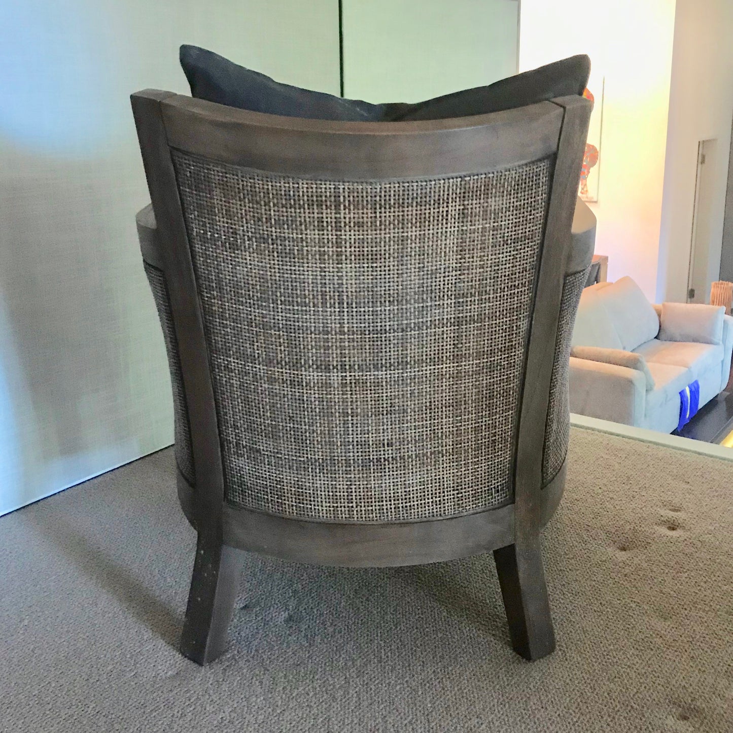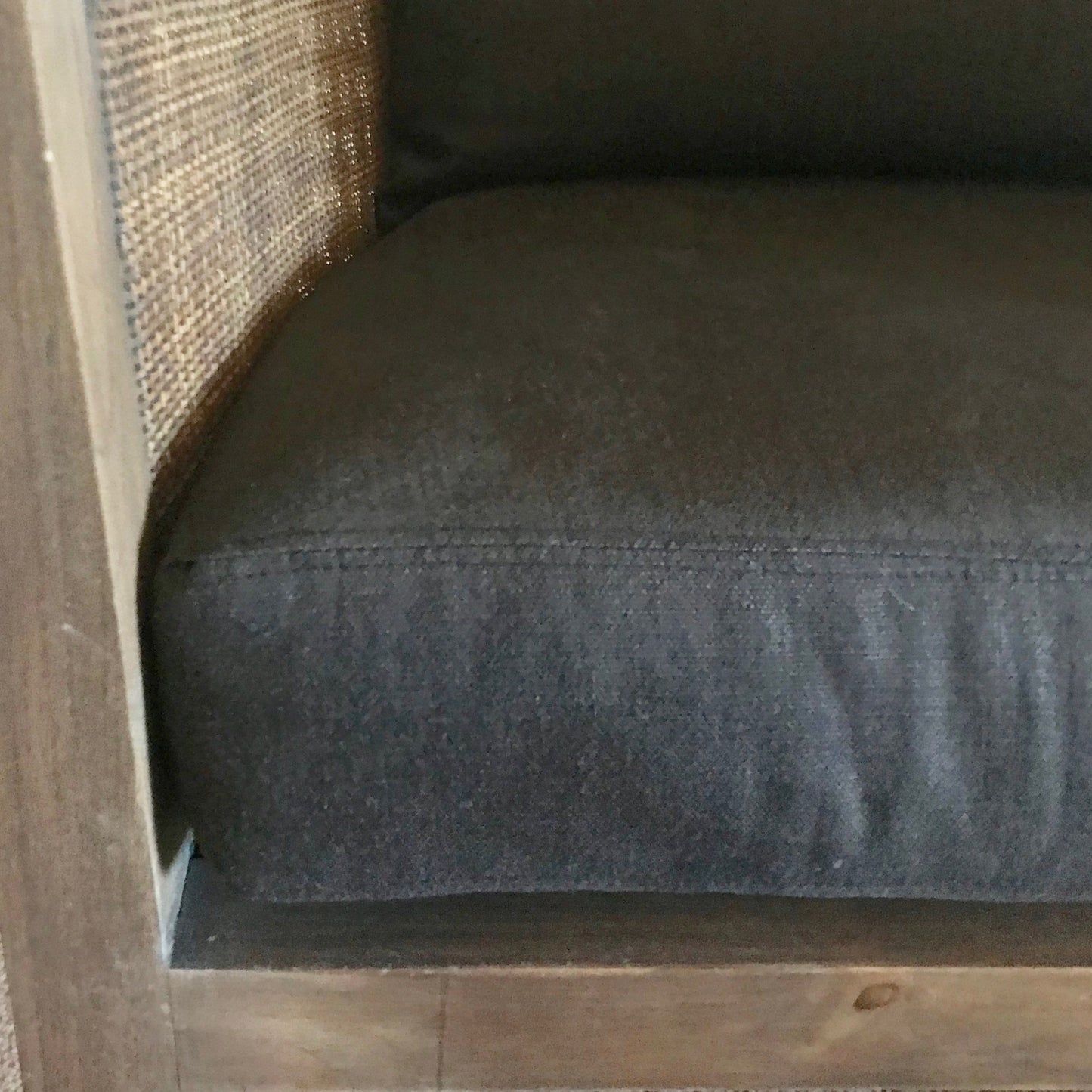The natural beauty of rattan highlights this handsome wood armchair. The Mumba Chair has a tropical style that melds nicely with coastal and contemporary decors. It features an exposed solid Teak frame and high arms with rattan sides and back. Cushions feature outdoor grade white upholstery for easy cleaning and usability. Webbed suspension and high grade polyurethane cushioning. The chair we have on offer has a drifted timber finish with black fabrick seat and back cushion.