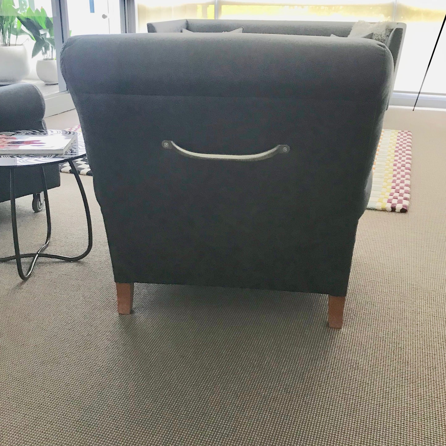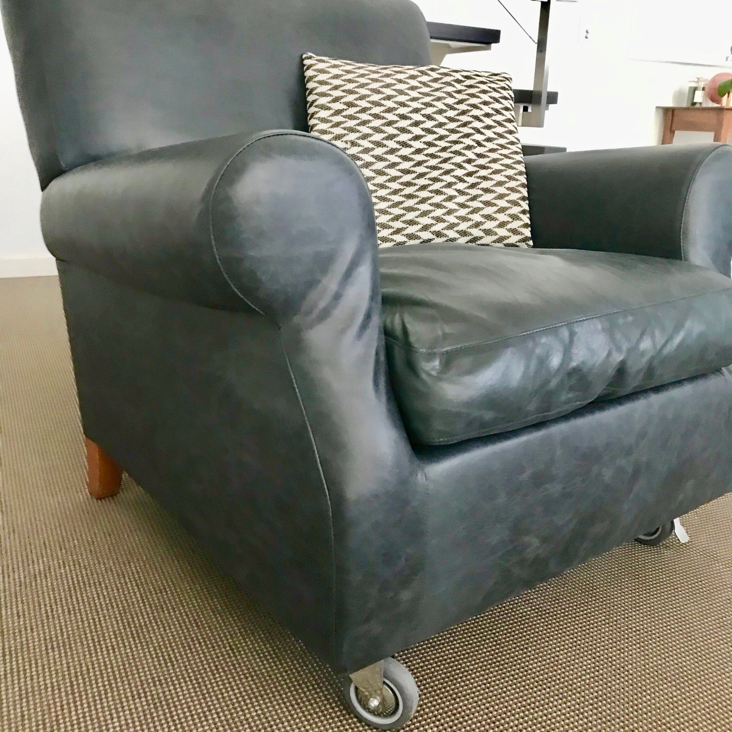 The forerunner of the design approach known as “family sofas,” NONNAMARIA is a collection that reprises the traditional image of period sofas and updates it by reducing, polishing and slimming the proportions. The result is a familiar line, but stripped of the classical ornament, shifted into the contemporary world. The family includes component configurations and linear sofas, daybeds, armchairs and an ottoman. The sofa with its soft, curved silhouette, accentuated by the rounded armrest that simplifies the scroll armrests of the tradition, is equipped with self-braking frontal casters and rear legs in beech. The chair we have on offer has been upholstered in a charcoal grey leather.