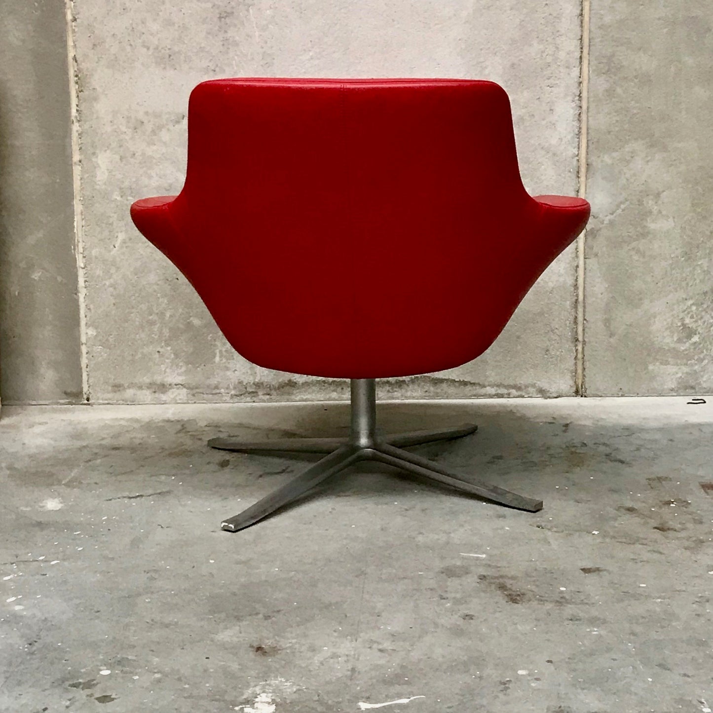 This splendid stand-alone item is a pleasure to behold from whatever angle. Sculpture with that feel-good factor. Flowing lines add up to body-responsive styling. Organic design for relaxed sitting. Special care went into the upholstery, a subtly blend of modern materials being used for seat and back. The chair we have on offer is in red leather.