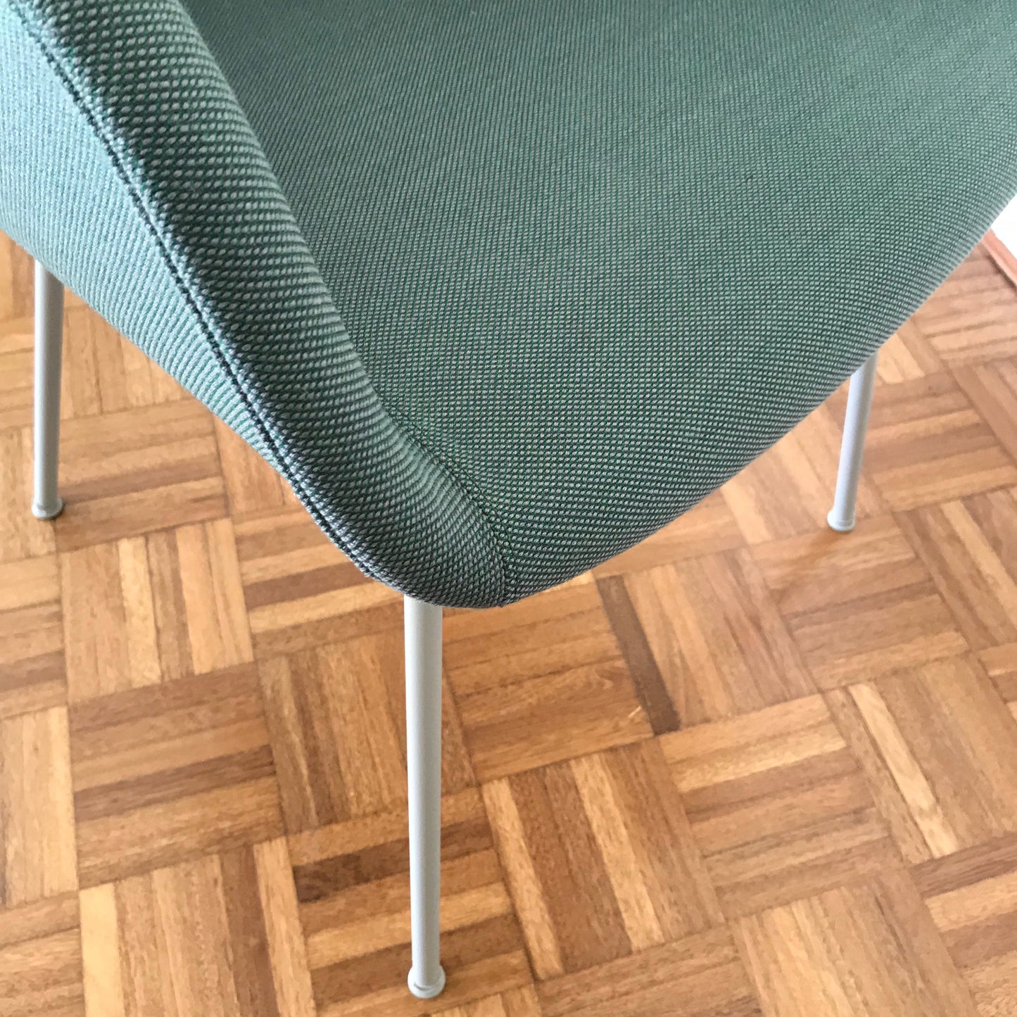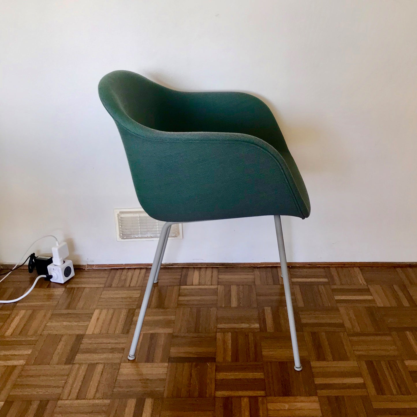 The Fiber chair has been designed to balance maximum comfort with minimum space. The chair has been produced from an innovative bio-composite material that includes 25% wood fibres. From a distance, the shell appears to be normal smooth plastic, however, when viewed up close the tiny pieces of the wooden fibres become apparent, giving the chair a whole new character. The chairs we have on offer are upholstered in green fabric with grey powder coated legs.