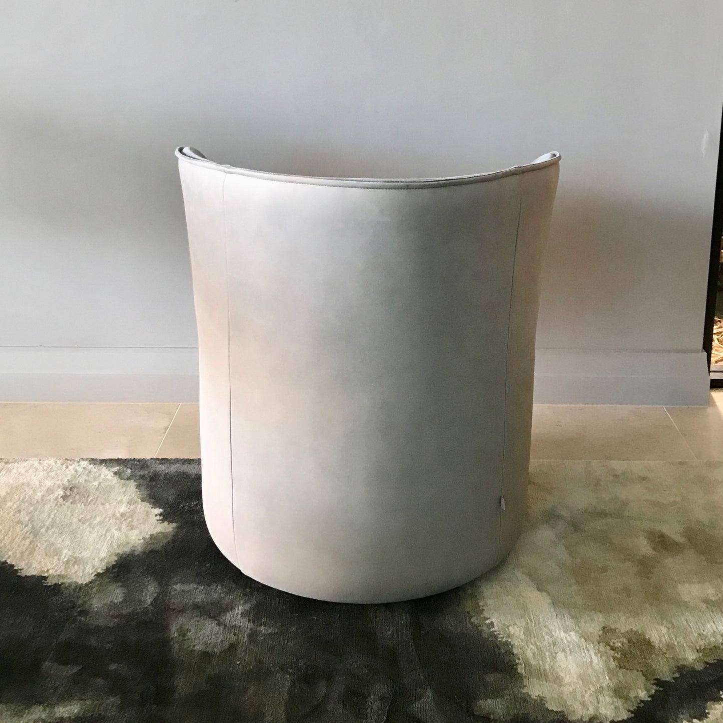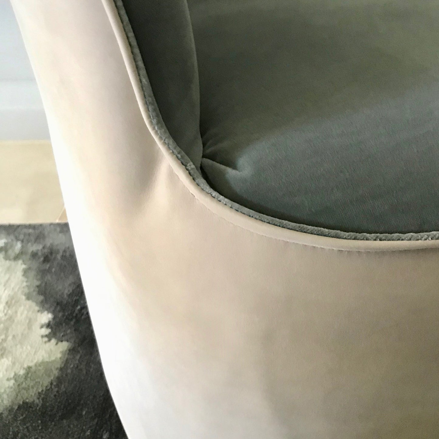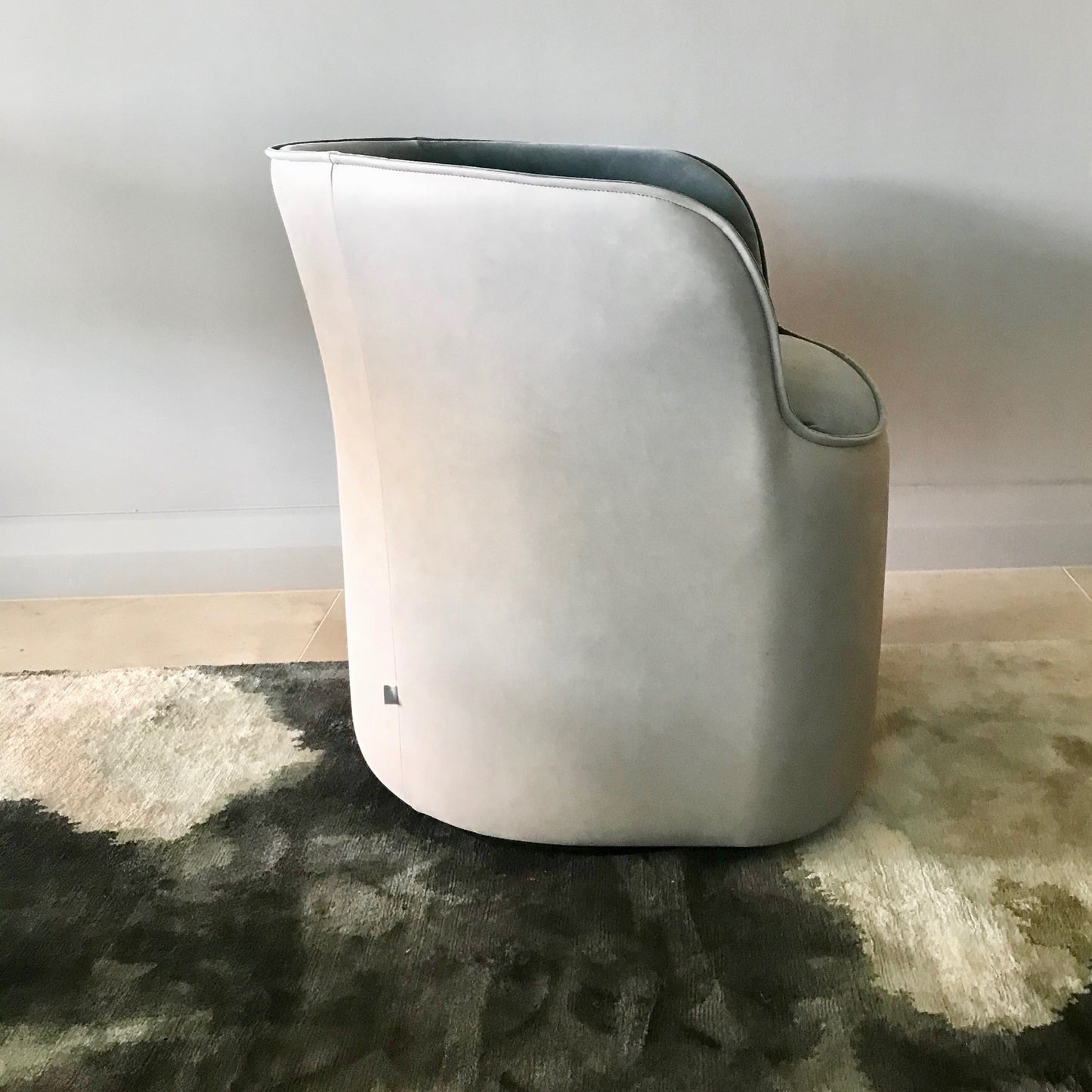 Upholstered steel and recycled plastic frame with a high resilience foam seat and back. Our foams are all GECA certified and timber is sourced from sustainably managed forests. Designed by Jardan Lab, our furniture takes shape at our Design + Manufacturing HQ in Melbourne, Australia. The chairs we have on offer have a swivel base. Frame and outside back is a neutral suede and the seat and inside back is blue/ grey velvet.