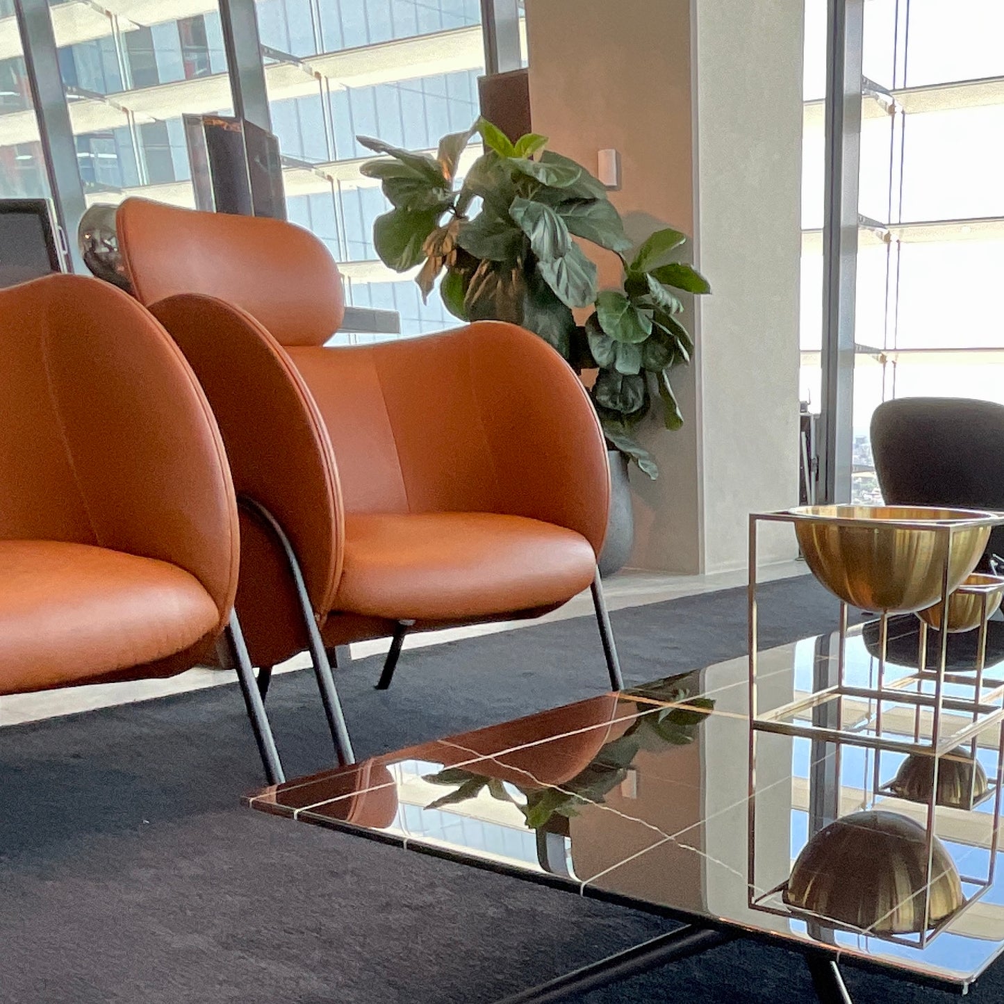 A sculptural and compact armchair available in two variants, with or without headrest. Royce joins SP01’s elegant collection of character driven designs. The original avian inspiration behind the design animates the new piece, giving it a distinct sense of character. The simple geometric line is reduced to a bird-like silhouette that appears ready for take-off. Originally shown as a dining chair at Stockholm Furniture Fair in 2018, Nikolai worked with SP01 to develop the concept into an armchair with an enveloping wing shaped design. The chair we have on offer has a satin black frame with Tan Antwerp Leather.