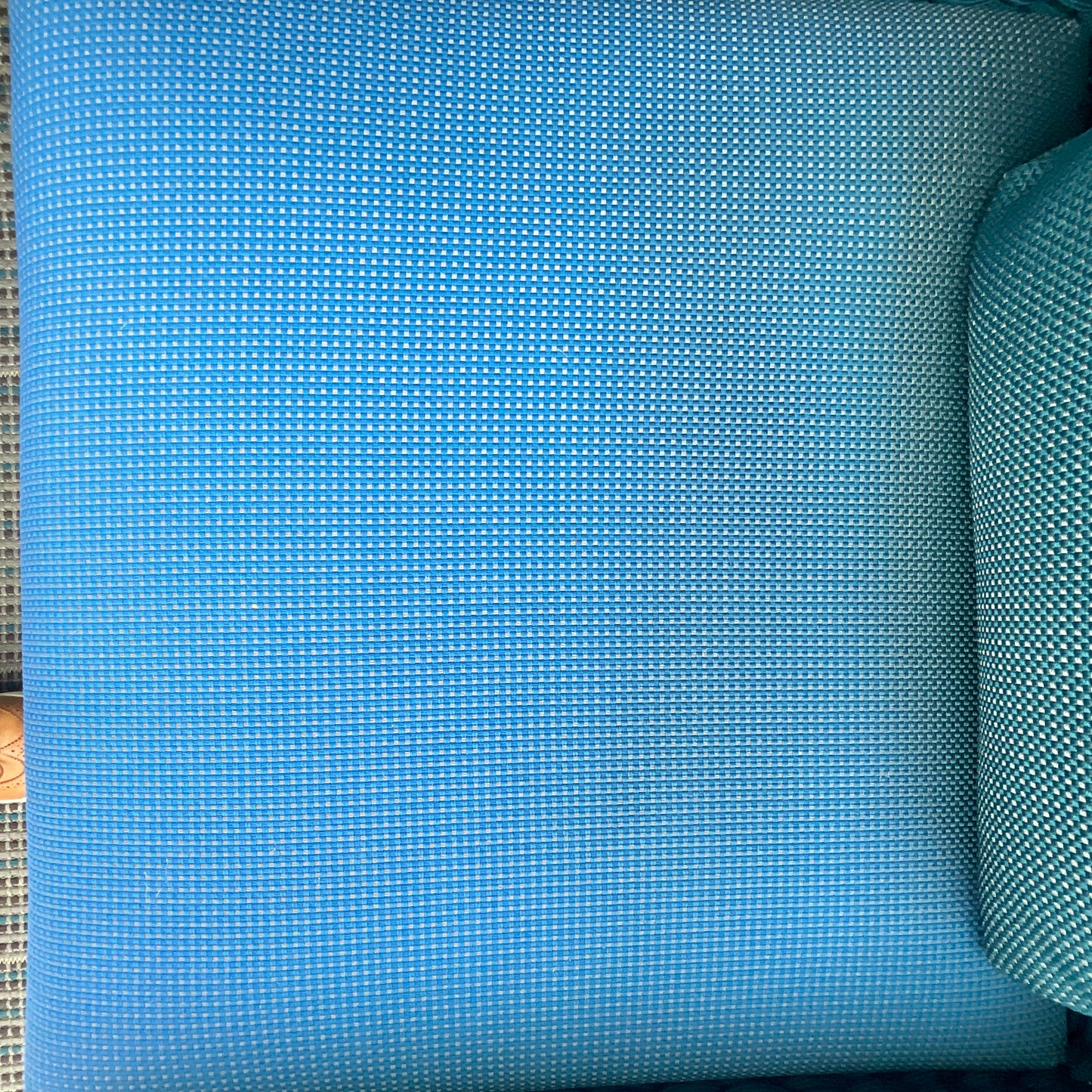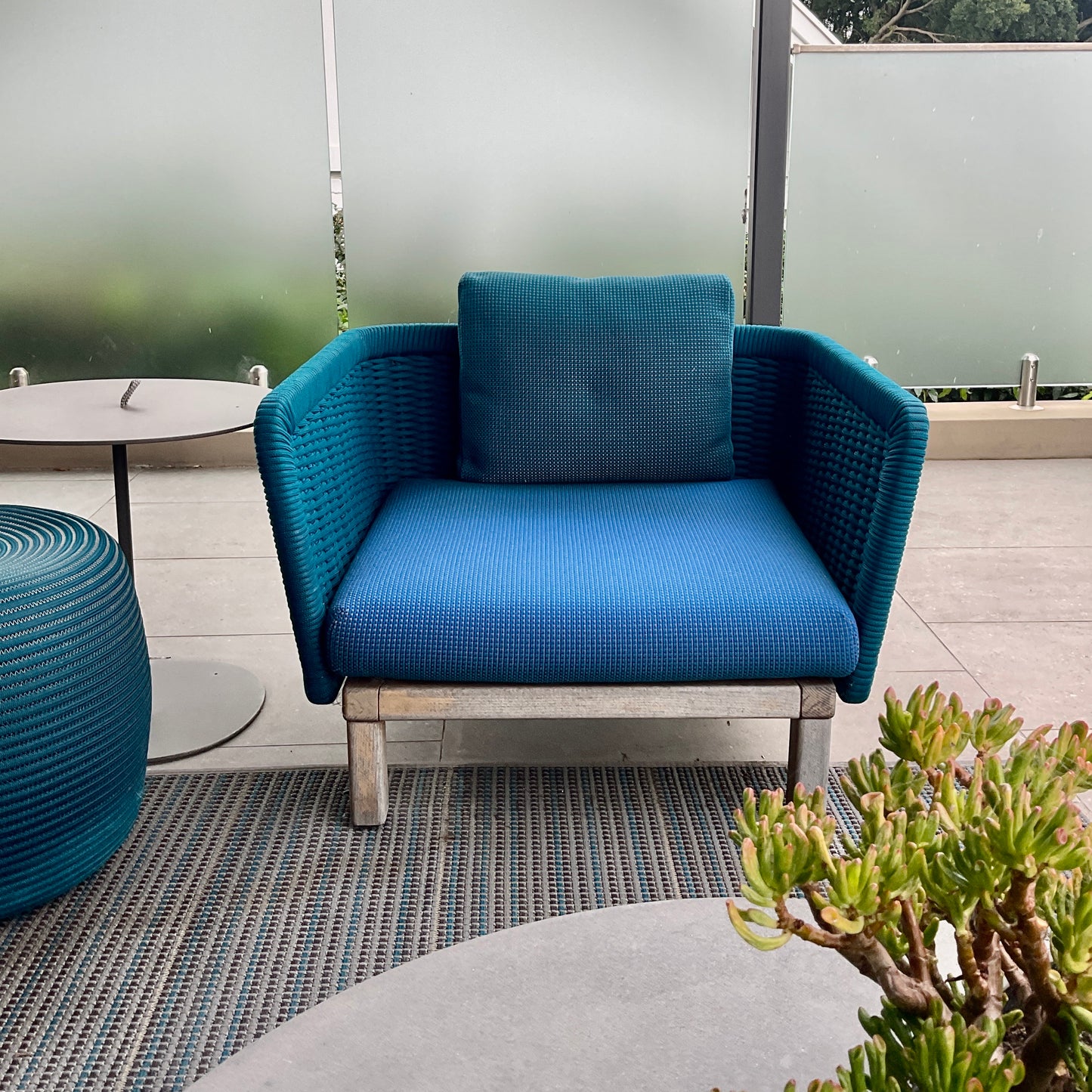 The chair we have on offer an aqua rope frame with blue seat and back cushion and teak feet.