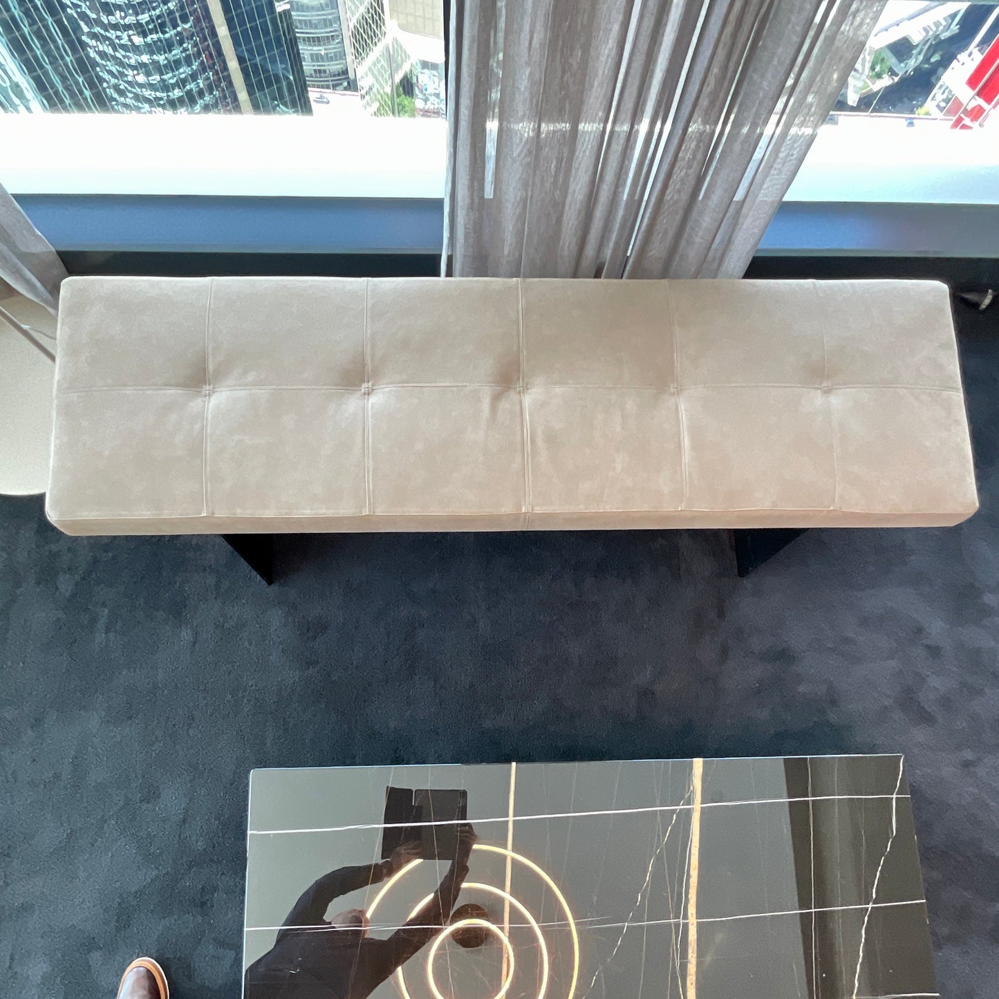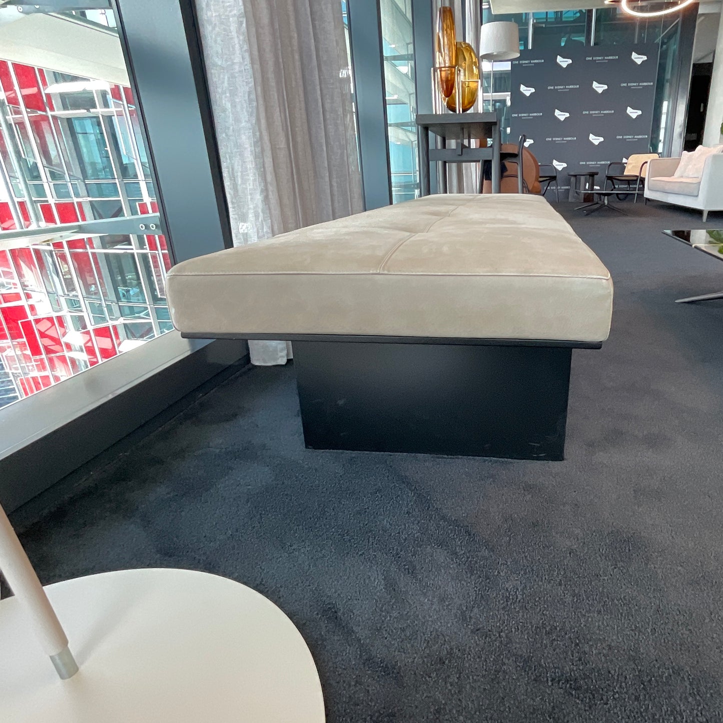Track is a bench with a wide and regular shape embellished by its finishes. The bench we have on offer has a matt black frame with Cat B Seta Tortora Leather.