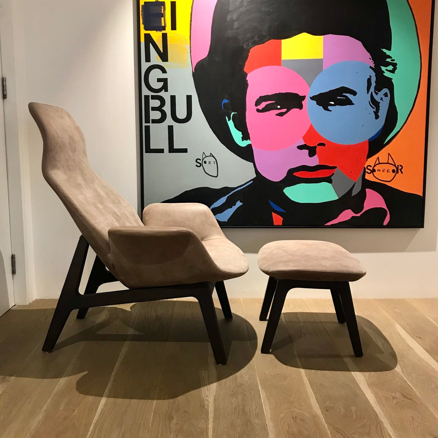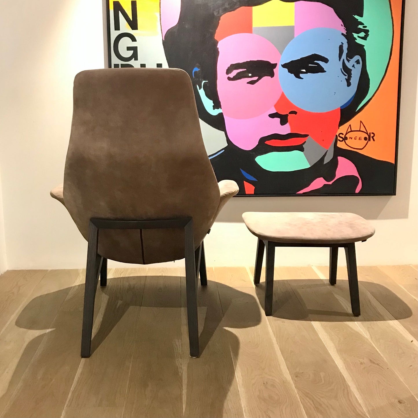 Ventura is a quintessential piece born from the collaboration between Jean-Marie Massaud and Poliform. Enveloping, fluid and sensual shapes are combined with an upholstered comfort and refinement for the creation of the perfect lounge armchair. The chair and footstool we have on offer are in Pelle tobacco Cat S/Y with stitching in Sahara. The timber is Cenere Oak.