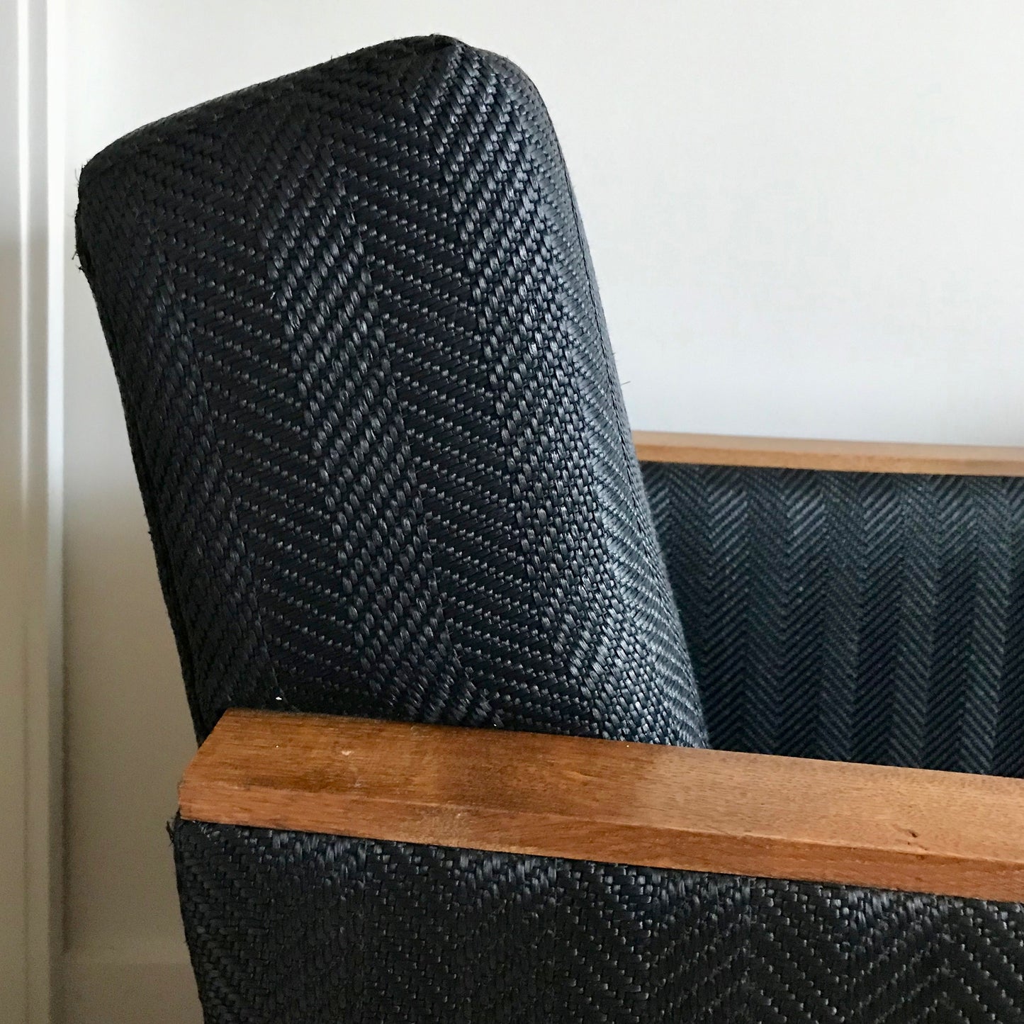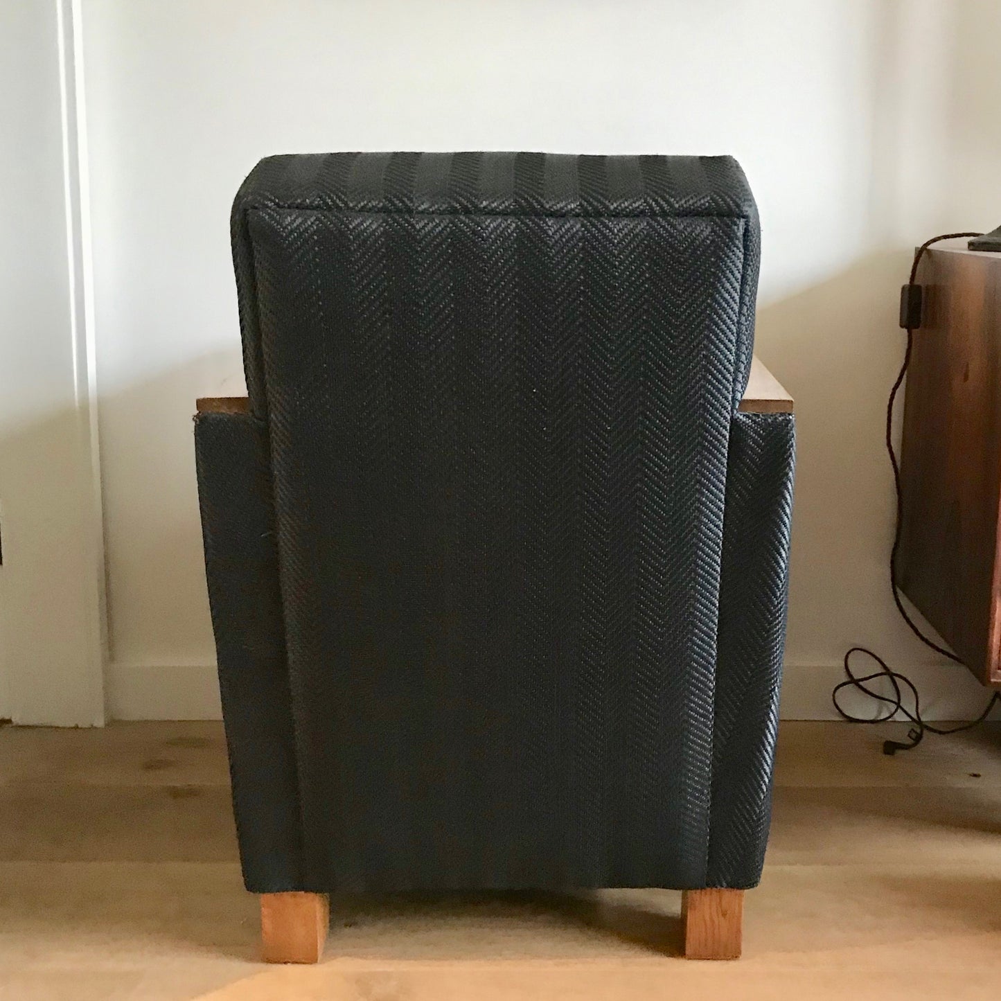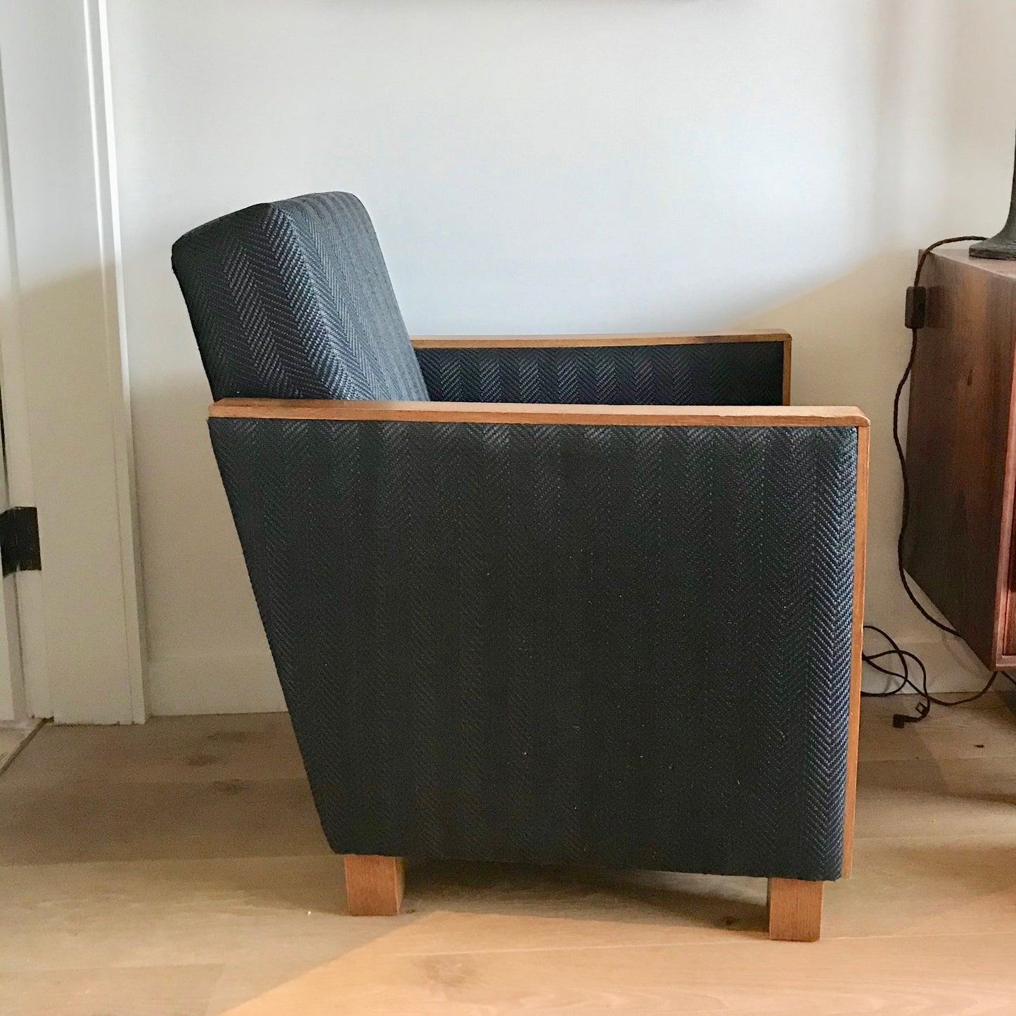 Sachin Hesslein Fabric (navy). The arms are a natural oak. Not only stylish, they are a comfortable chair, by this distinguished British designer of the Art Deco era.