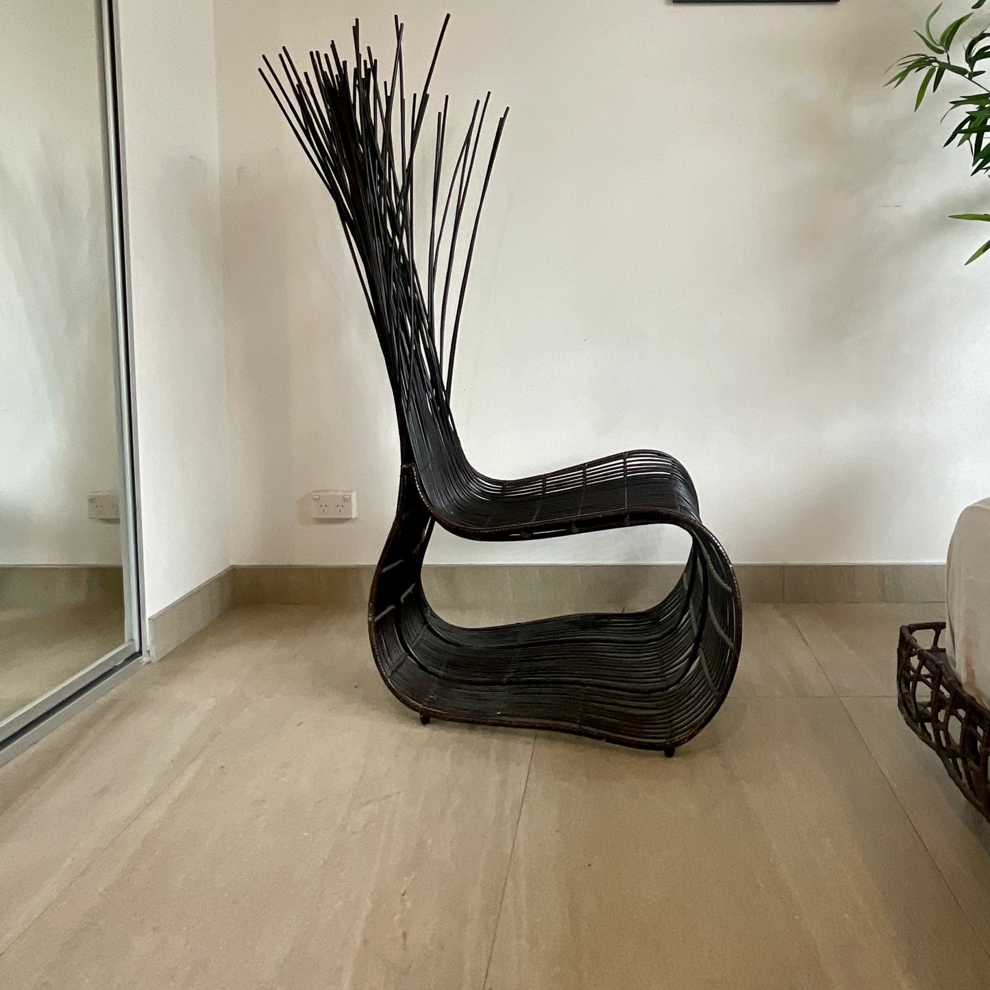 The Yoda Chair by Kenneth Cobonpue is a striking sculptural seat that marries organic form with contemporary craftsmanship. Constructed from rattan and abaca fibres, its distinctive silhouette features sweeping, wing-like arms that cocoon the sitter in dramatic fashion. The chair's name pays homage to the beloved Star Wars character, evoking his wise, enveloping presence. Handwoven by Filipino artisans, it exemplifies Cobonpue's signature fusion of traditional techniques and avant-garde design. Both a functional seating piece and an objet d'art, the Yoda Chair commands attention in any interior whilst offering unexpected comfort within its theatrical embrace.
