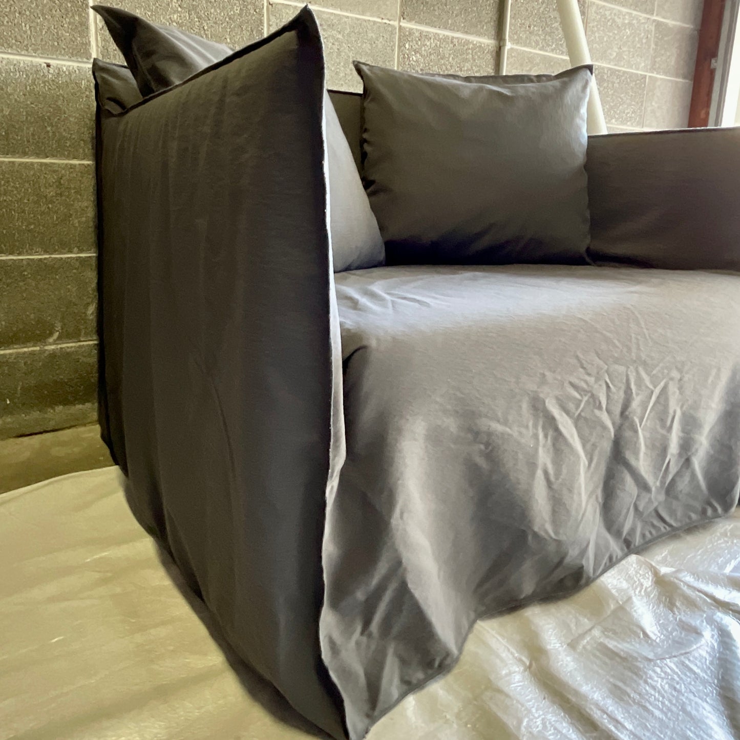 Comfort and versatility are the keywords that define Ghost, a collection of seats that are as comfortable and enveloping as their upholstery. The name of the collection is inspired by the white version which, thanks to the soft falling fabric, brings to mind the common imagination of ghosts. The wide Ghost seats Collection is developed around a light body with essential volumes that contains soft cushions. The main feature is the upholstery: an oversized housse whose profile is underlined by the visible stitching. Sofas, armchairs, ottomans, chairs and beds are undressed and dressed in a flash, like a change of clothes, taking on a different image each time, simple or sophisticated, depending on the personality of those who choose and live them. The chair & ottoman we have on offer are in grey linen.