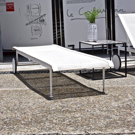 Richard Schultz designed the collection in 1966 at the request of Florence Knoll, who wanted well-designed outdoor furnishings that would withstand the corrosive salt air at her home in Florida. Through the years, the 1966 Collection has earned a special place in the world of outdoor furniture and is considered a classic design for the garden. The 1966 Collection has also been chosen to be included in various museums, including the Permanent Design Collection of the Museum of Modern Art, New York (MoMA). We emphasize exceptional durability. We have re-engineered the furniture to incorporate the best modern materials, including Teflon thread, powder coat paint and stainless steel. The item we have on offer is the adjustable chaise that lies completely flat. It has a white frame with white mesh and tape.