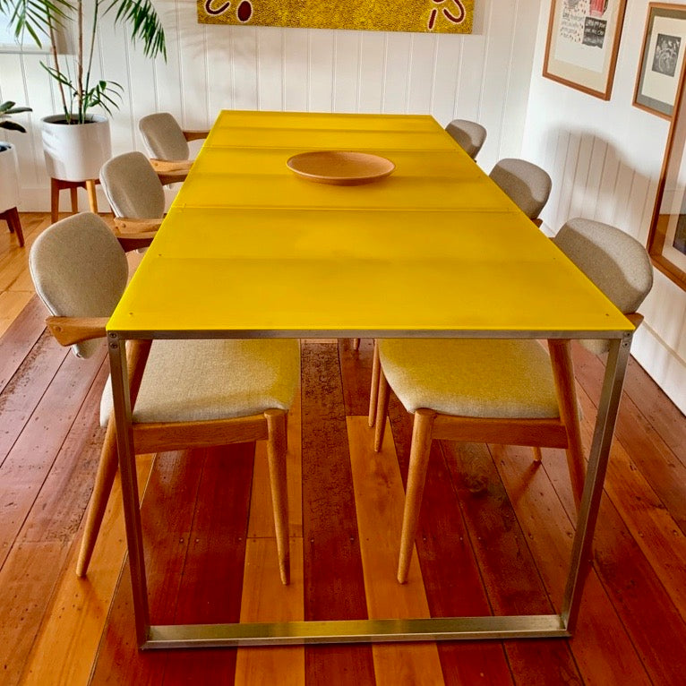 The Luna pieces that form the collection by Gandia Blasco play with the lightness and subtlety and at the same time they seek integration in any environment, without losing presence. The geometry bases its appeal on the poetic implication, combining simplicity and character. On the basis of a translucent material as is the methacrylate satin, and of a light structure, and surrounding of stainless steel structure, was born a collection of pieces that bring lightness to the environment. The table we have on offer has a yellow methacrylate satin top with a stainless steel structure base.