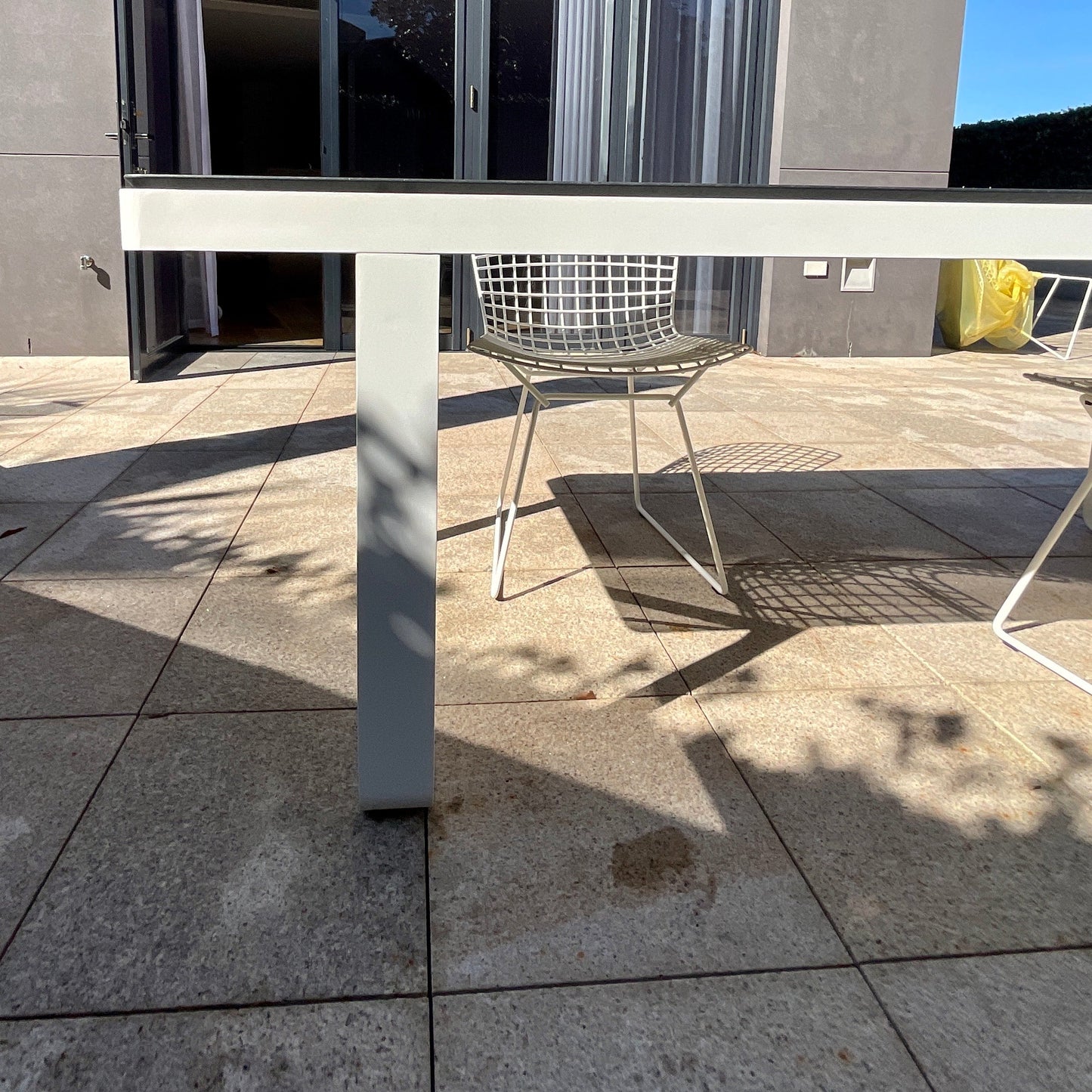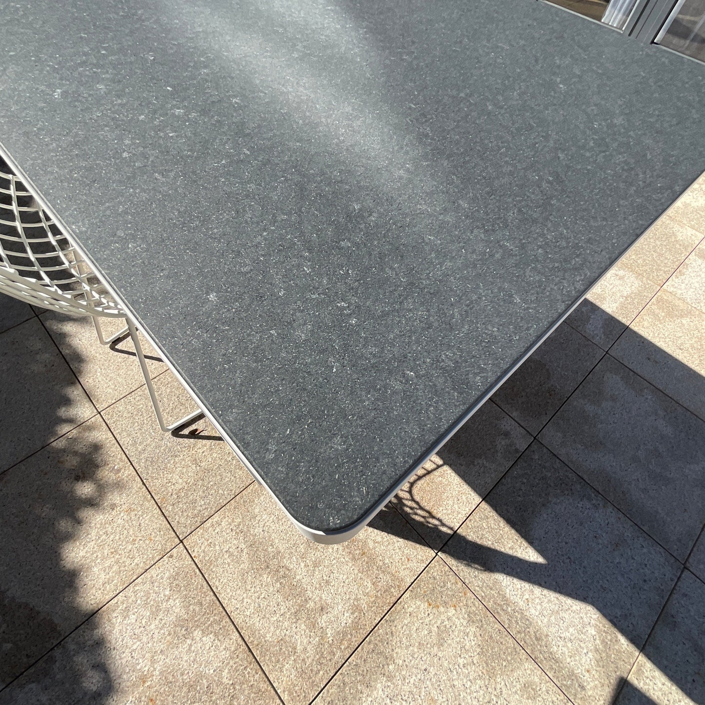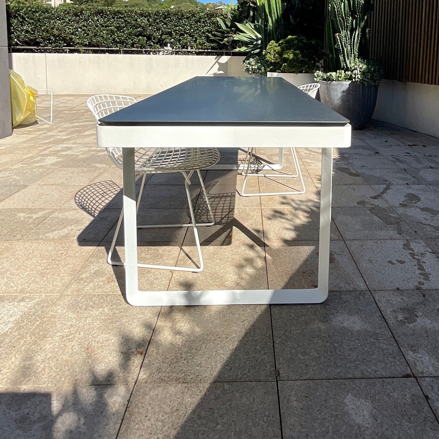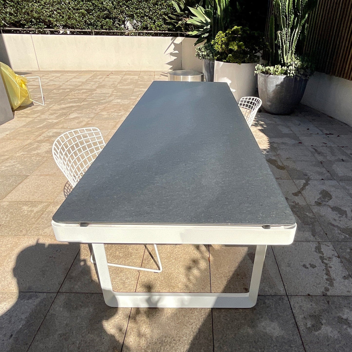 Tribu Neutra outdoor dining table from Cosh Living was made to a custom size to fit on a narrow balcony. The table we have on offer has a white frame with black granite top.