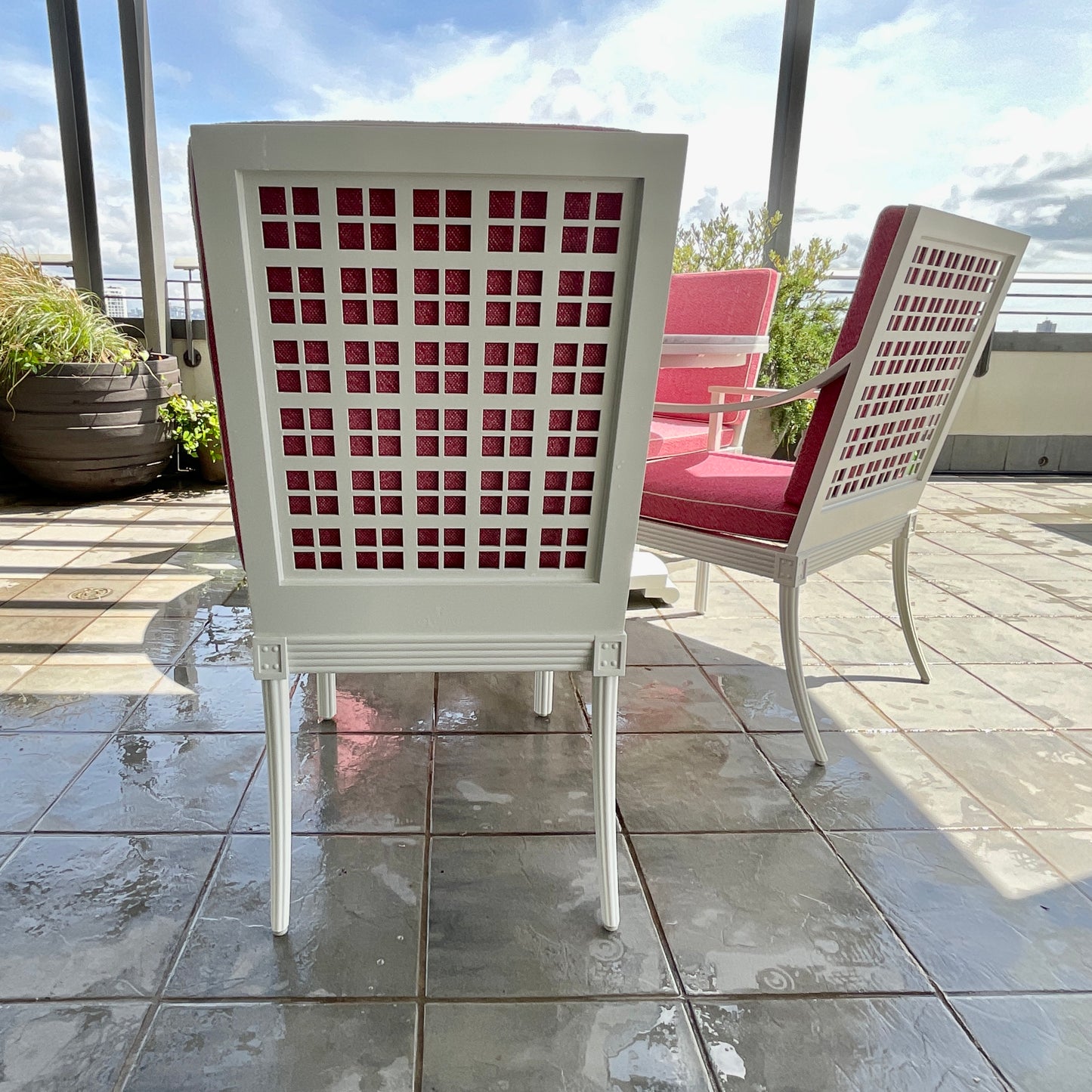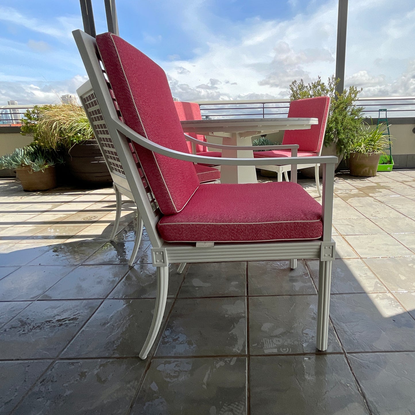 Cuban-American designer Orlando Diaz-Azcuy has teamed with Janus et Cie to produce a sophisticated line of powder-coated-aluminum outdoor furniture. Quadratl, one of four collections in the brand’s Masters Aluminum Series, is a collaboration between Diaz-Azcuy and Janus et Cie president and CEO Janice Feldman, who was inspired to exercise her own design talent while watching Diaz-Azcuy’s creative process. The collection owes its crisp geometry to a Josef Hoffmann print owned by Diaz-Azcuy, who has long seen the Wiener Werkstätte as an influence. Feldman, too, feels a special connection to the movement and its aesthetic—Janus et Cie’s topiary logo was inspired by a sculpture atop Vienna’s Secession building. The collection’s title, German for “square,” was Hoffmann’s nickname. The set of chairs we have on offer consists of two armchairs and two side chairs. The chairs have an aluminium frame with Cirrus White Januscoat ™ The seat cushions are in a pink fabric with white piping.