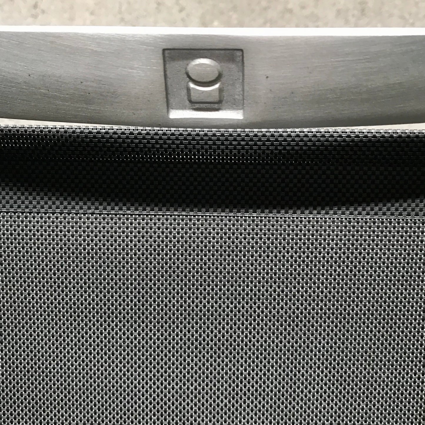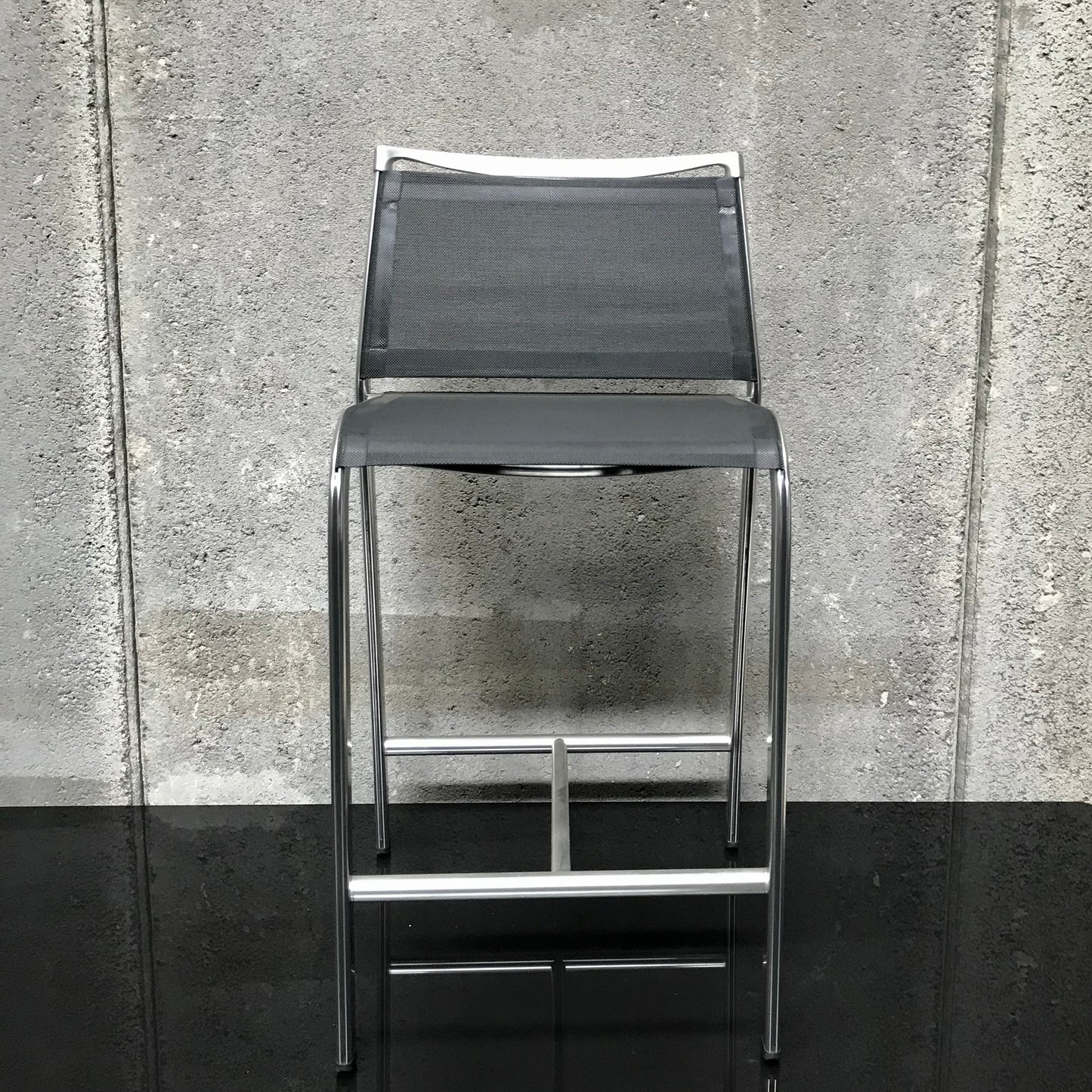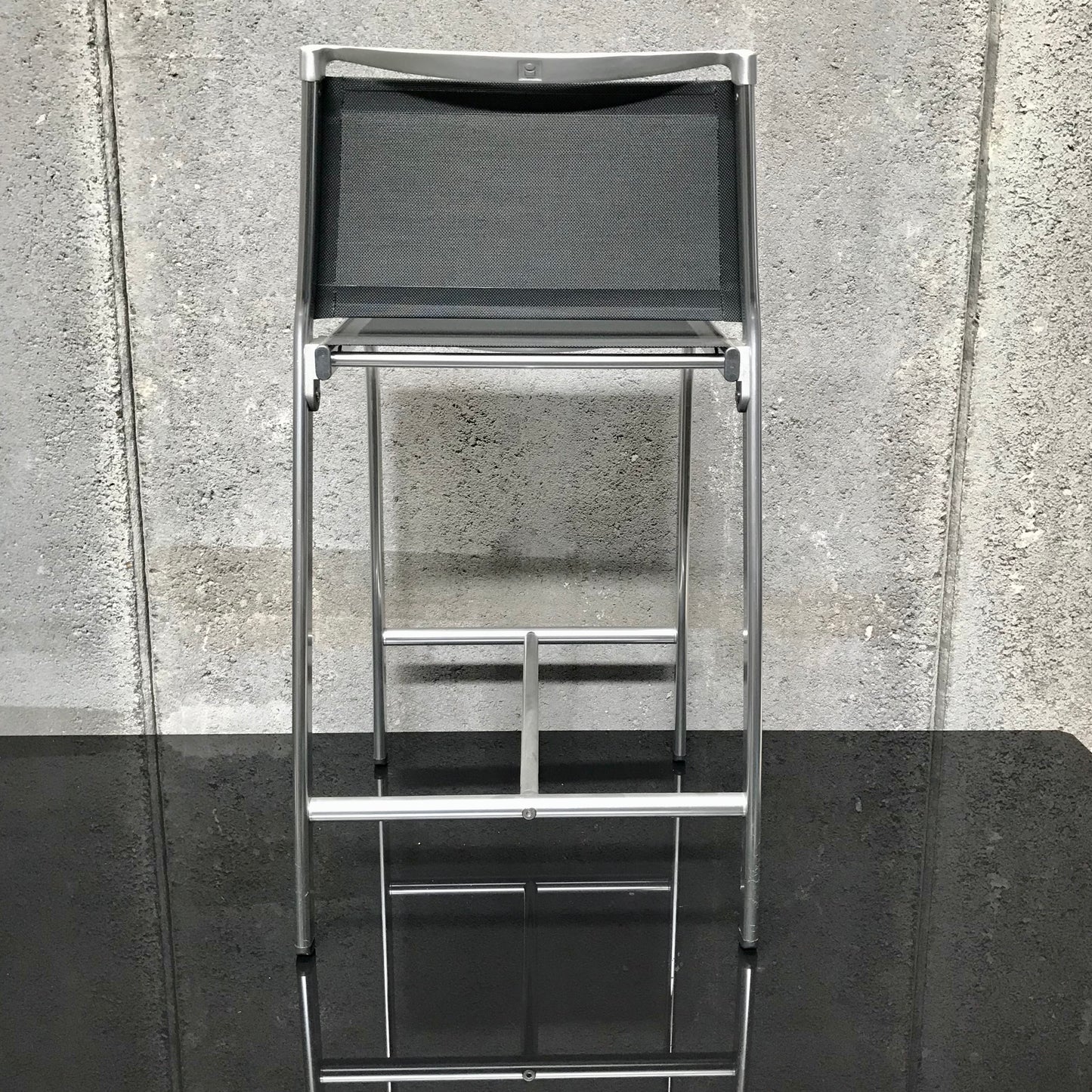 Stool with seat and backrest in a black textline net, structure in anodised aluminium frame. Suitable for indoor & outdoor use.