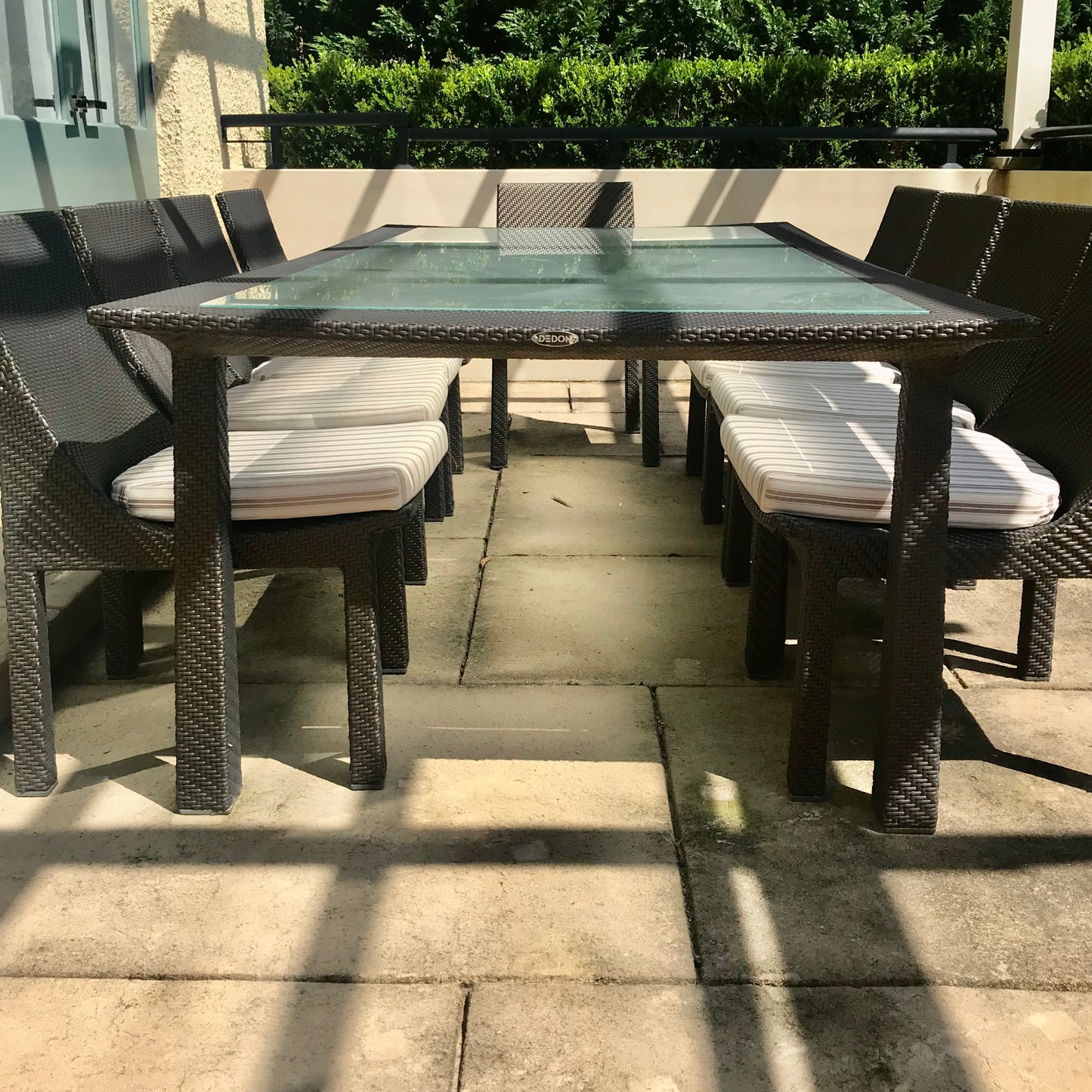 Calmness comes from balance. This Asian-look follows a clear design, inspired by mental balance. The elements come together in harmony and calm the body and soul equally. The table we have on offer has a bronzed frame with glass top. Seats 10.