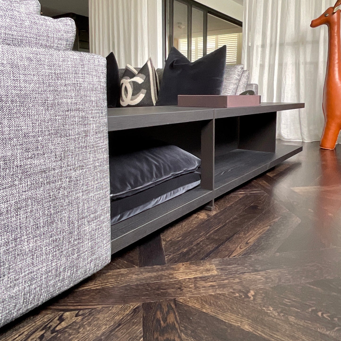 POLIFORM TR200 BRISTOL SYSTEM BEHIND SOFA ELEMENT + OPEN SPACES FOR OPTIONAL EQUIPMENT, FINISH : BLACK ELM BE , INSERTS + FEET FINISH : GLOSSY BROWN NICKEL BKL 200WX42DX43H CM J.M. MASSAUD