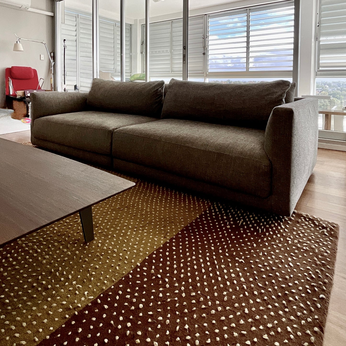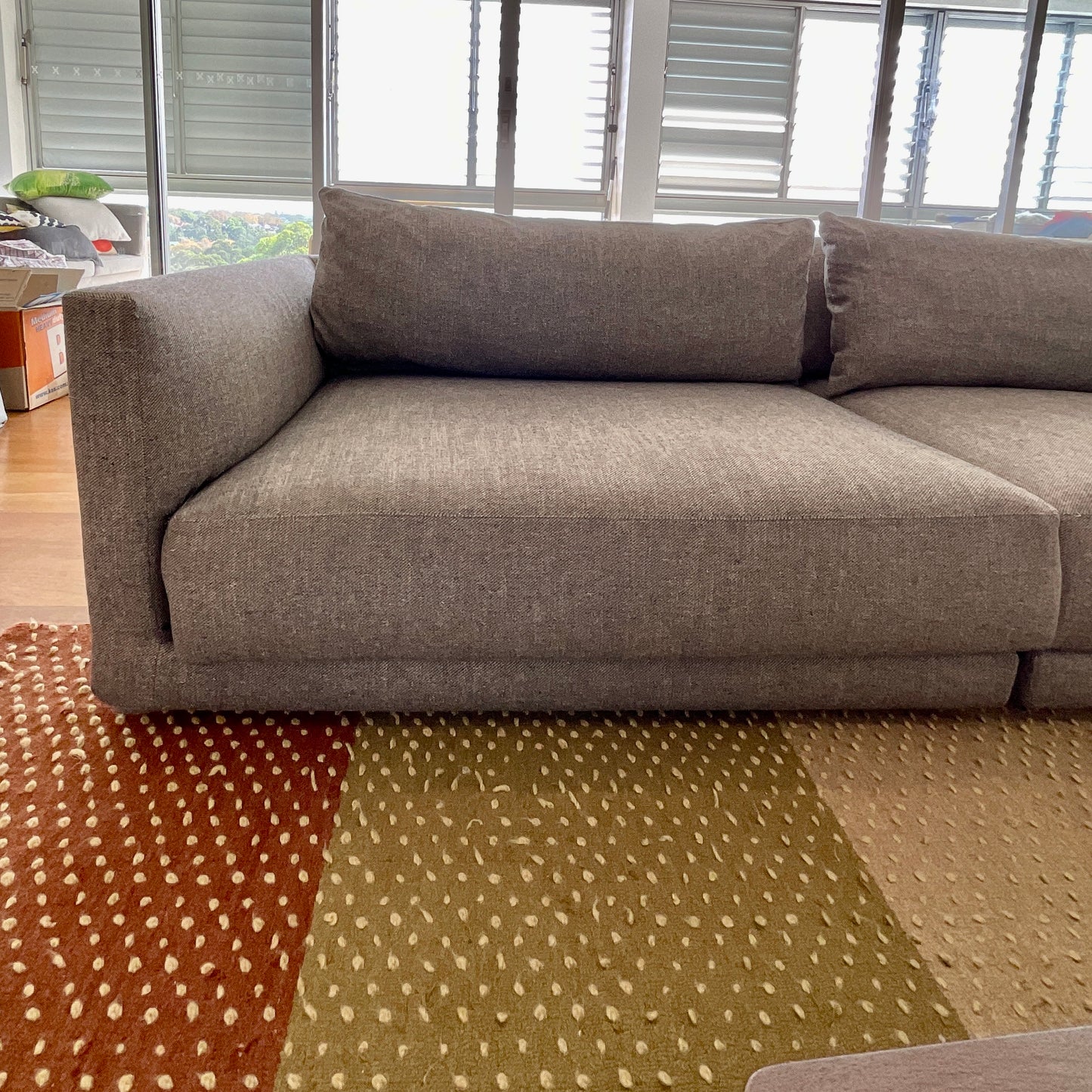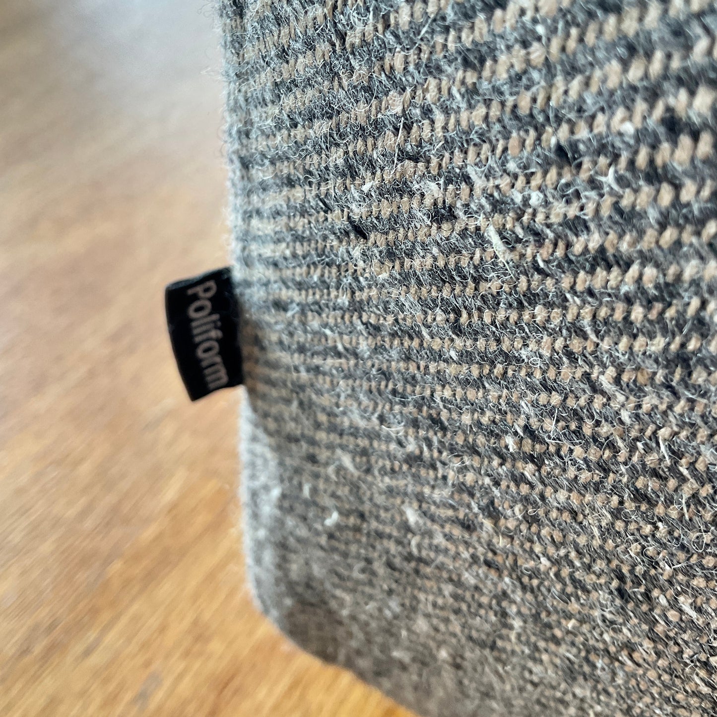 The Bristol sofa features broad, soft and comfortable shapes, with a wrap-around double backrest cushion, complemented against the thin armrests. Designed by Jean-Marie Massaud for Poliform, is versatile enough to allow for highly original living combinations and layouts. The sofa we have on offer is in two pieces; Left arm facing and right arm facing. The sofa is upholstered in a wool fabric.