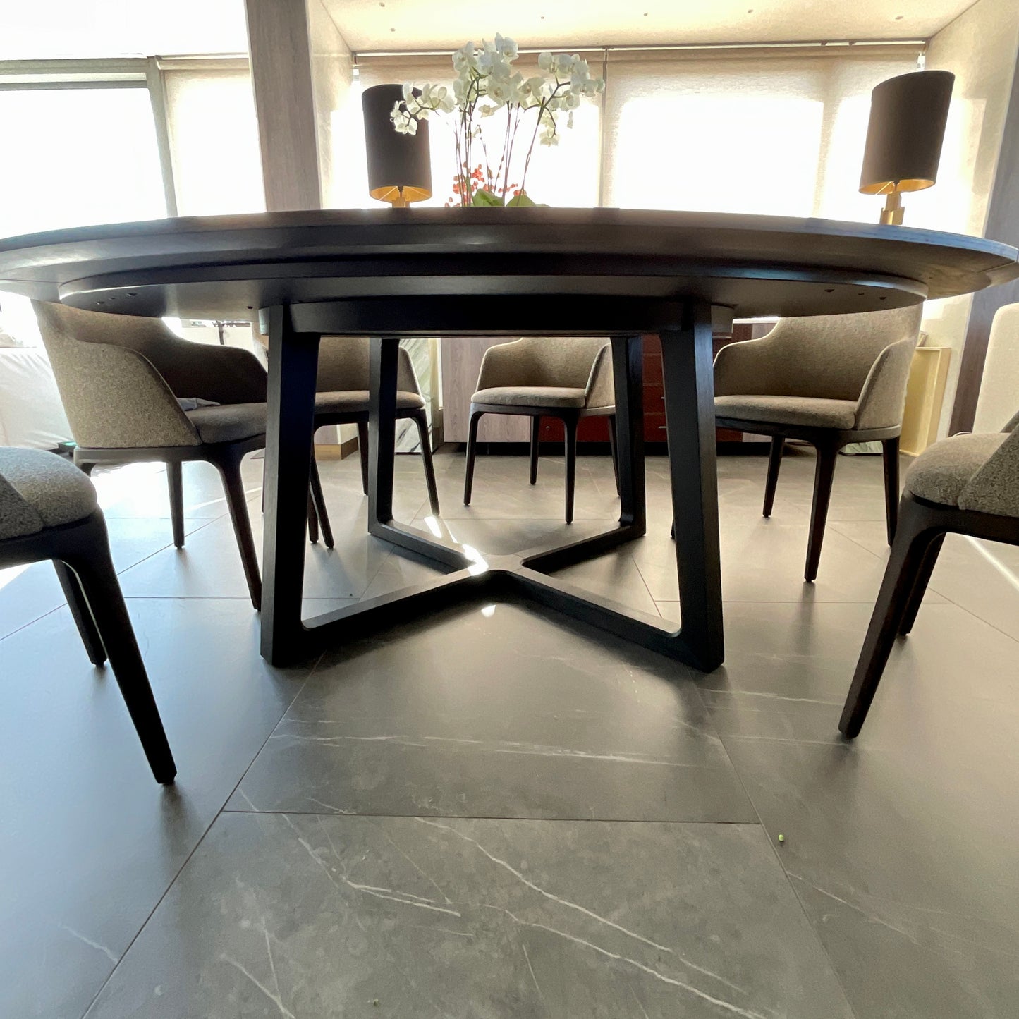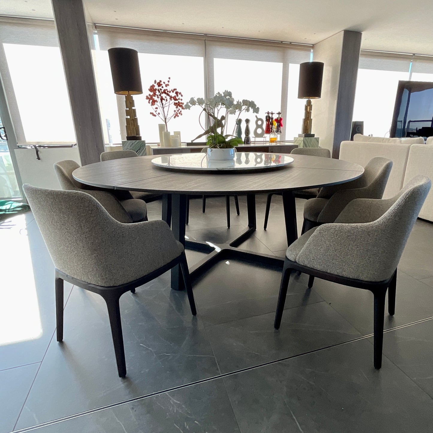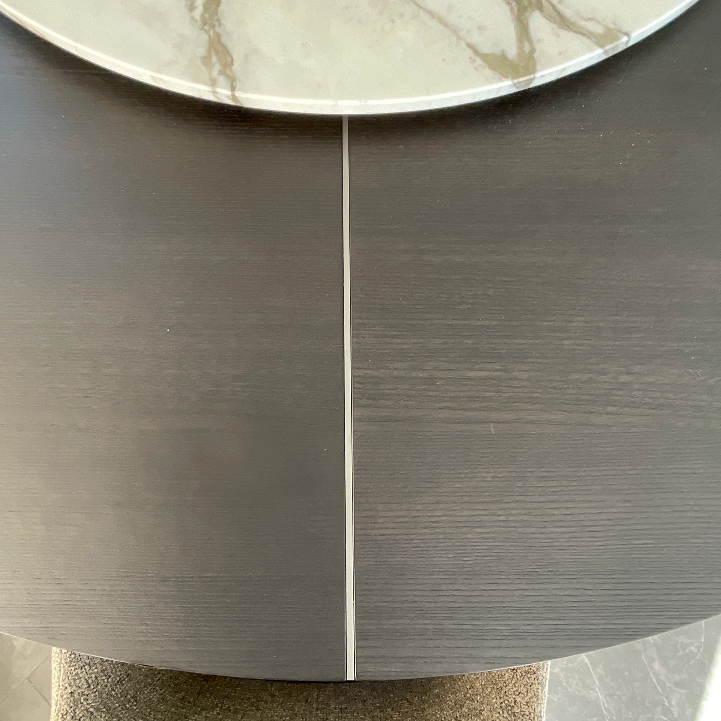 Emmanuel Gallina's Concorde Table is certain to become the absolute centre of attention in any dining setting. Soft shapes interpreted with essential style have resulted in the creation of this remarkable piece. Available constructed completely from wood or with a marble top. The table we have on offer has a Black Elm table base and top with metal dividers. The table also has a spinning tray in glossy Calacatta Gold Marble.