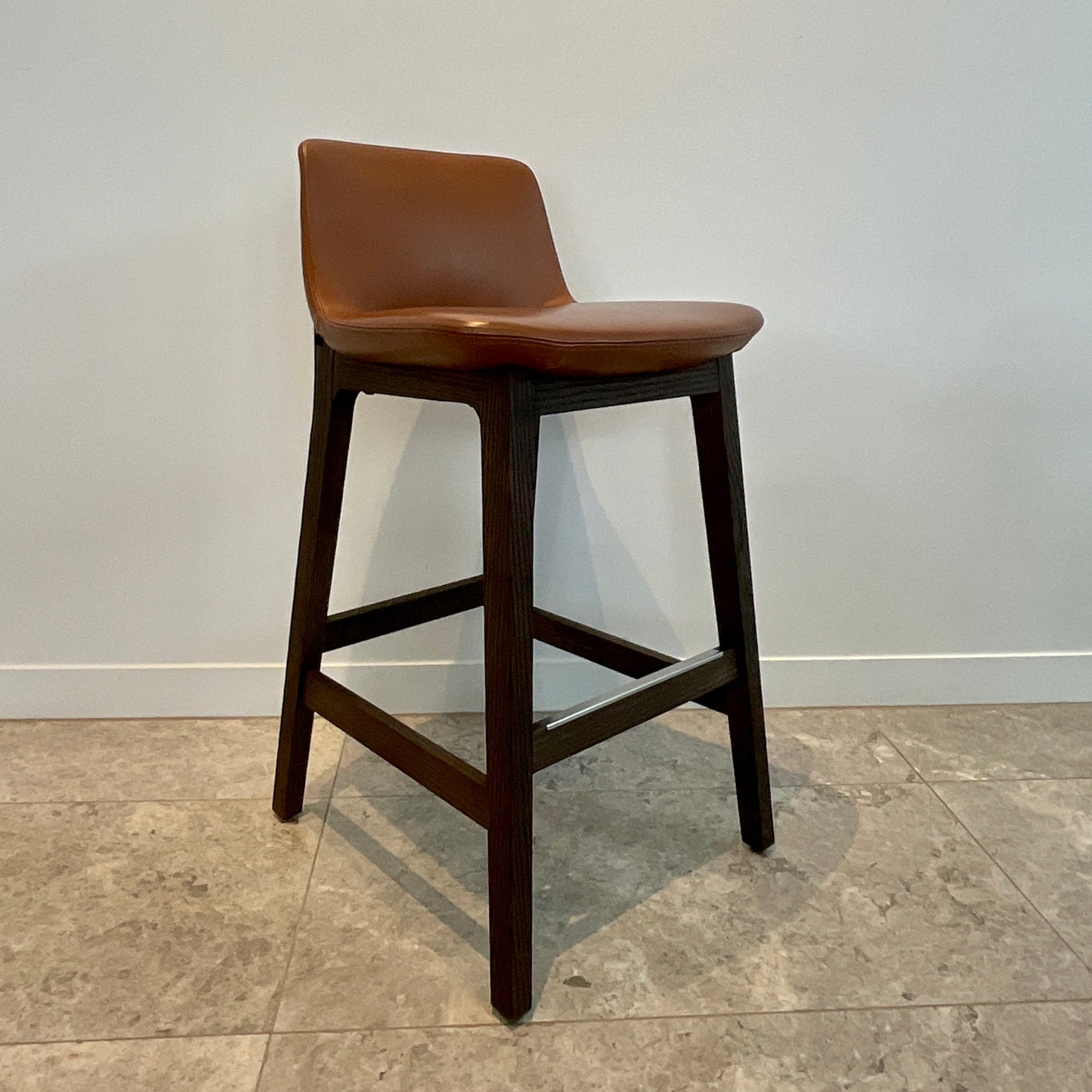 The Ventura stool echoes the distinctive structure of the seating collection of the same name. Designed to complement breakfast bars in the most on-trend kitchens, Ventura combines contemporary styling and comfort thanks to its backrest and padding, which can be upholstered in fabric or leather as desired. The stainless steel footrest ensures an easy and comfortable seat. The stool we have on offer has a timber frame with tan leather seat.