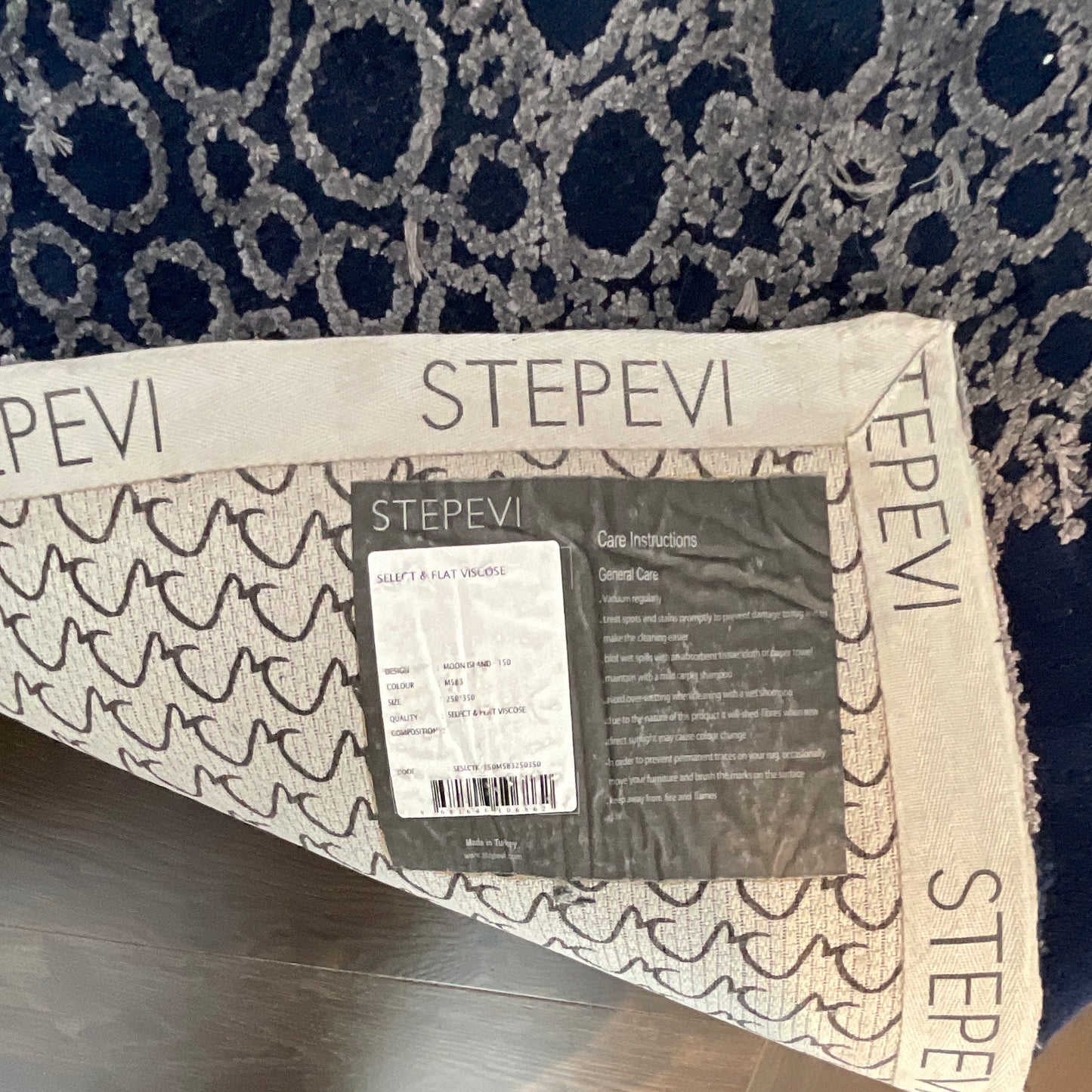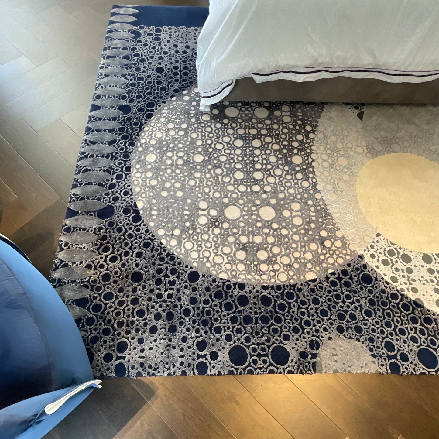 The spectacular Moonlight rug from the Moon Island collection, the result of the collaboration between designer Juan Montoya and STEPEVI, features shades of grey, ecru and navy blue.
