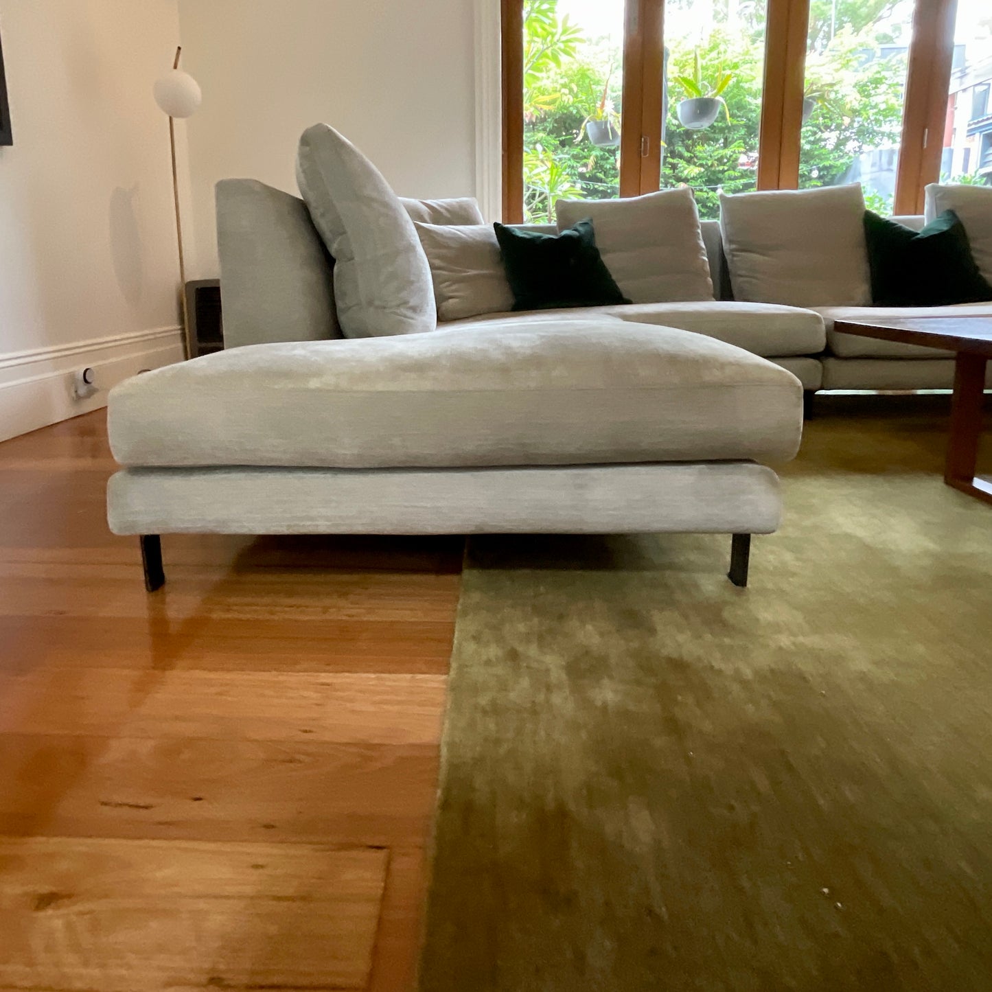The Andersen seating system, designed by Rodolfo Dordoni for Minotti, is a cornerstone of modern Italian furniture. Characterized by its "floating" aesthetic and balanced proportions, it is a highly versatile modular collection intended for contemporary living spaces. The sofa is elevated off the floor by a slender, pressure-cast metal base with elegantly shaped feet. Features a slightly backward inclination of the seat and generous goose-down cushioning divided into sections to ensure lasting softness. The sofa we have on offer is upholstered in a champaigne coloured low pile velvet.