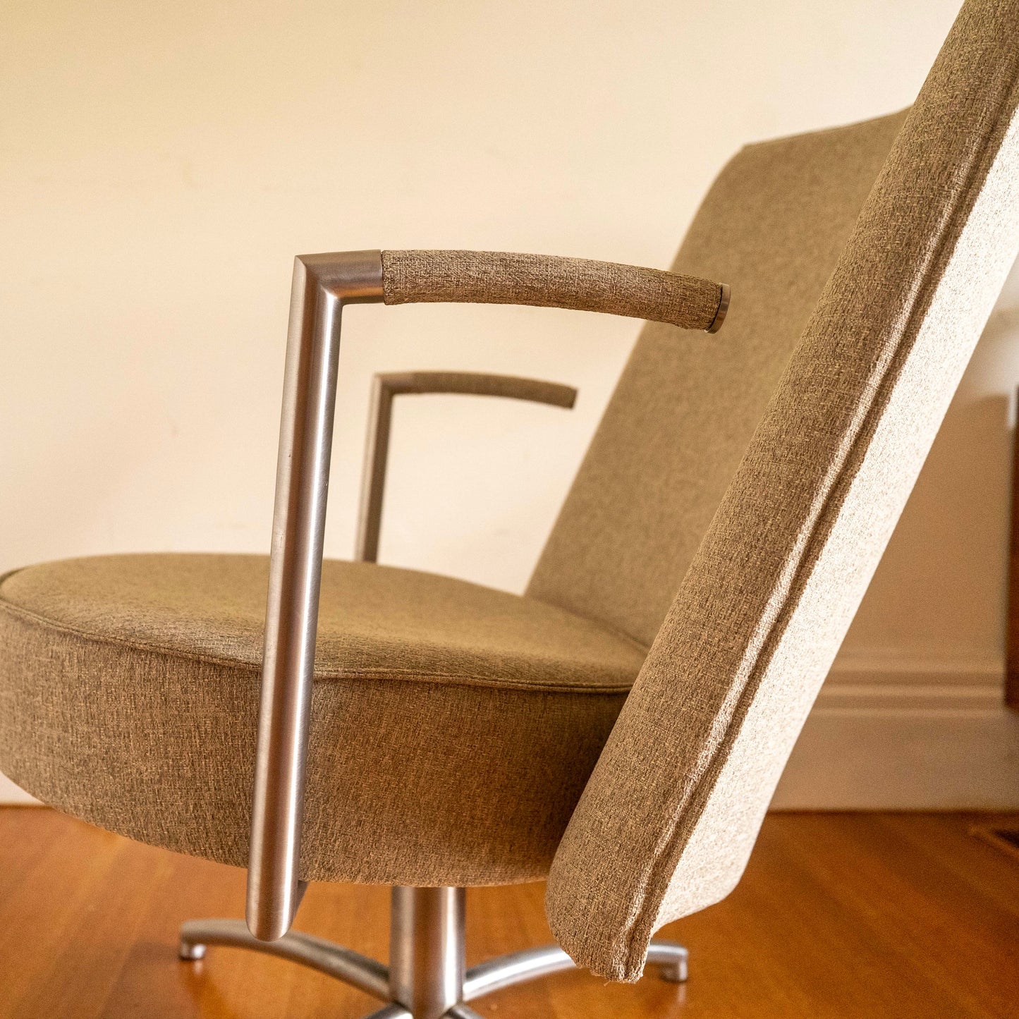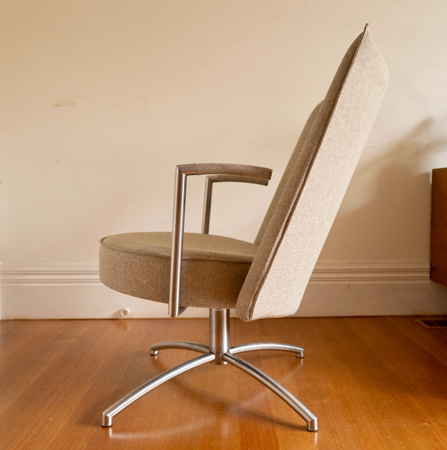 With their organic thinking the Danish design duo Foersom & Hiort-Lorenzen’s goal is to create long-lasting value. Partner combines a masculine look with soft organic forms. The wide back and small round seat are carried by a cross-shaped steel frame that underlines the chair’s executive status. Do not be fooled by the chair’s sharp-edged and serious look – Partner is a very comfortable chair too. The chair has a round seat that has been upholstered in moulded polyurethane foam. With Partner Foersom & Hiort-Lorenzen have created a chair where a tough exterior is united with a soft interior.