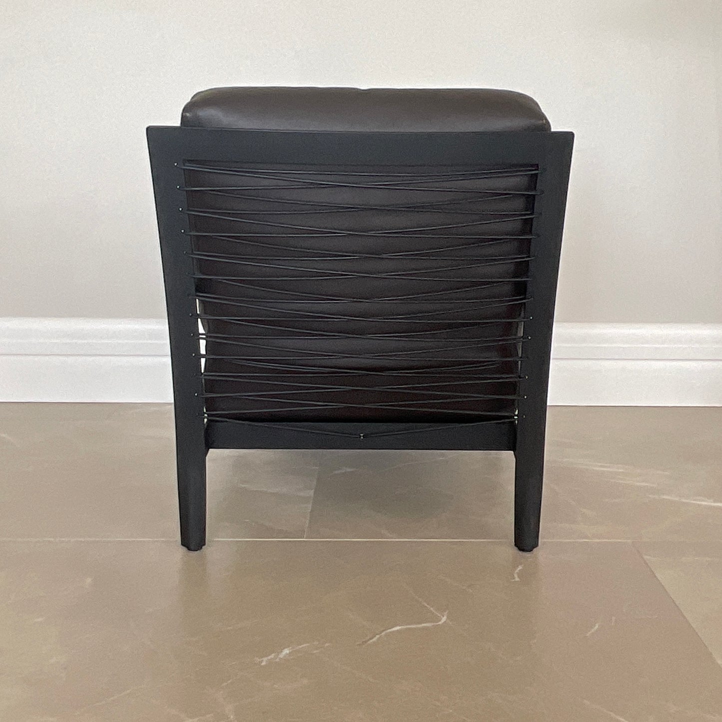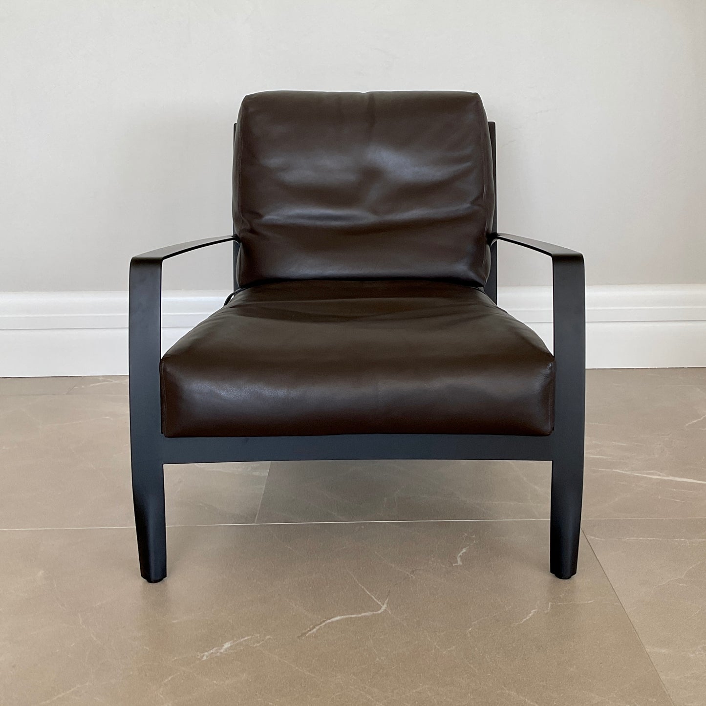 The backrest/frame, is made from hand-woven leather string in black and the material of the frame is metal lacquered in baked black. The seat and back cushion is a soft brown minotti pelle leather.