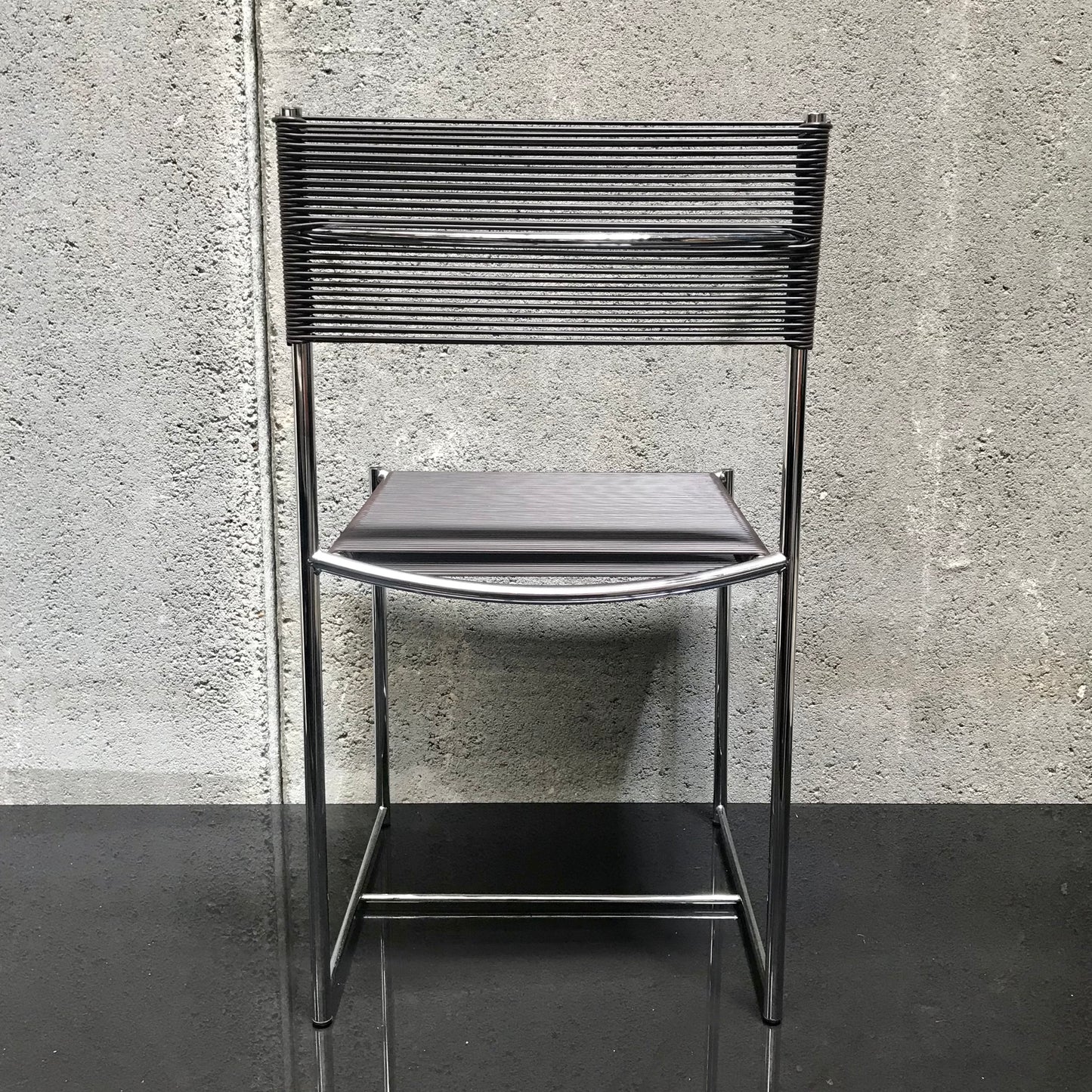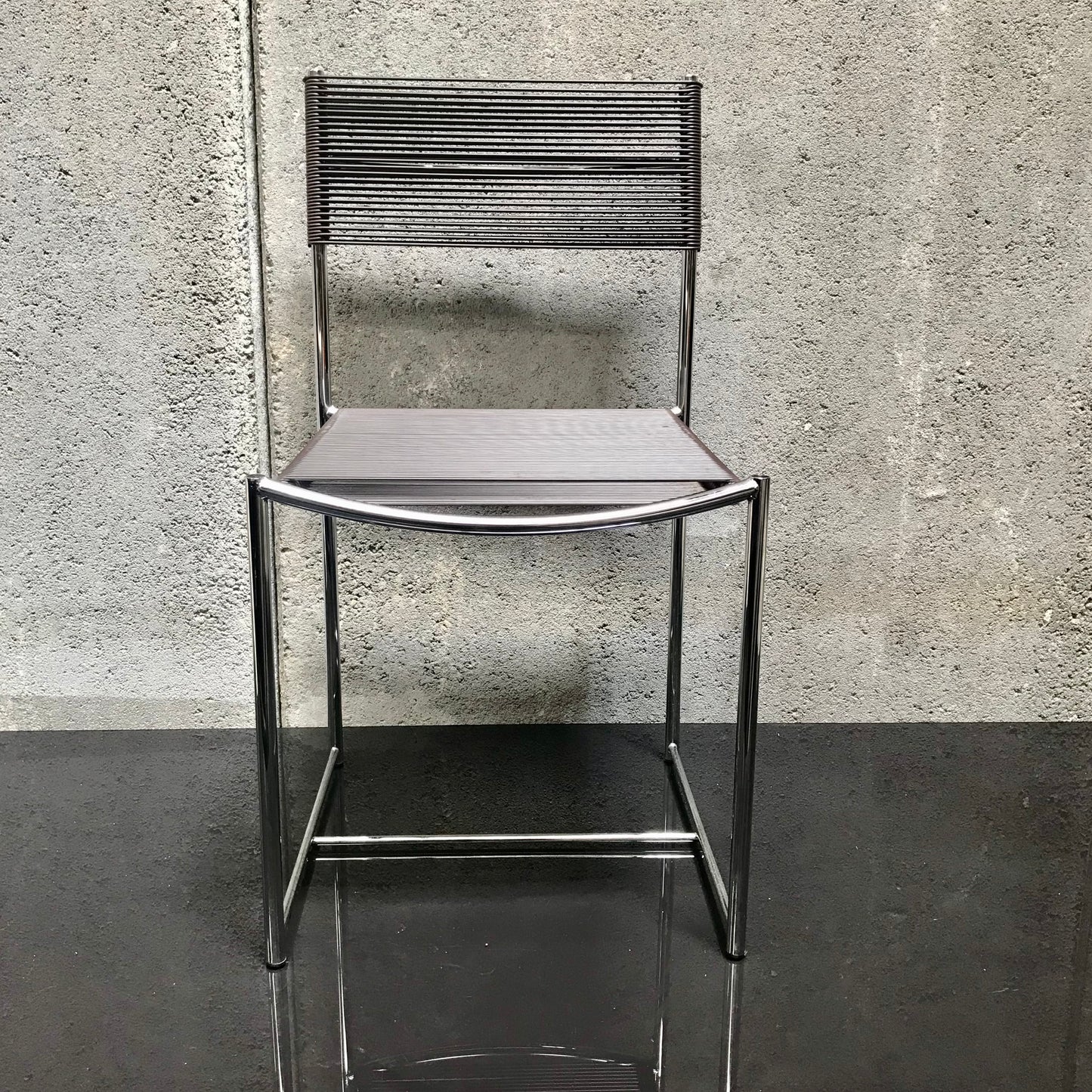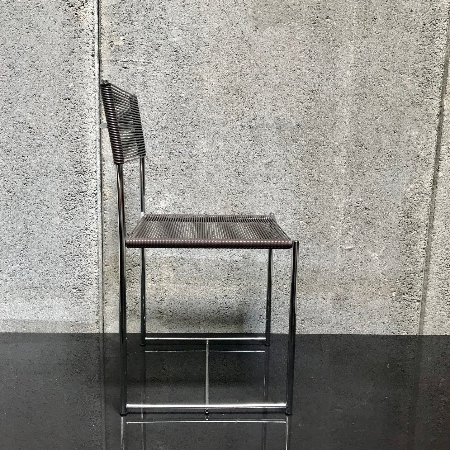 The classic Spaghetti Dining Chairs by Giandomenico Belotti have a polished chrome frame with brown PVC strapping.