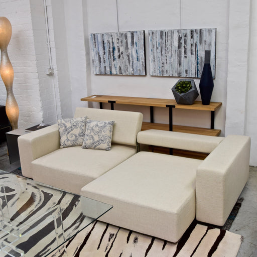 Since its first appearance Andy has become a classic with the elegance born of the calibrated proportions that design its effective geometry. The back can change its inclination from a horizontal and more modern position to a vertical one for more comfortable sitting. Even converted from sofa with multiple configuration options to chaise longue and bed, it maintains the formal rigour intact. This sofa has just been reupholstered in Unique Fabric ‘Blake’ Colour Sandstone.
