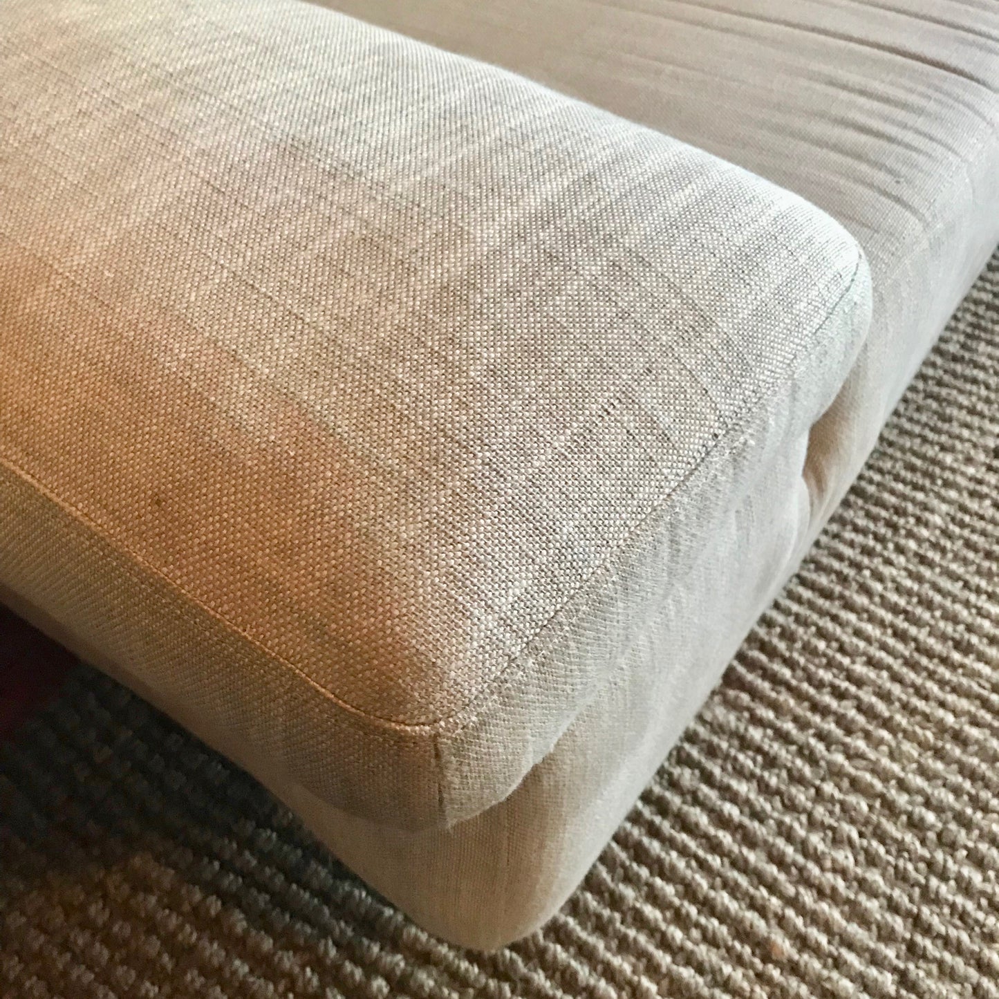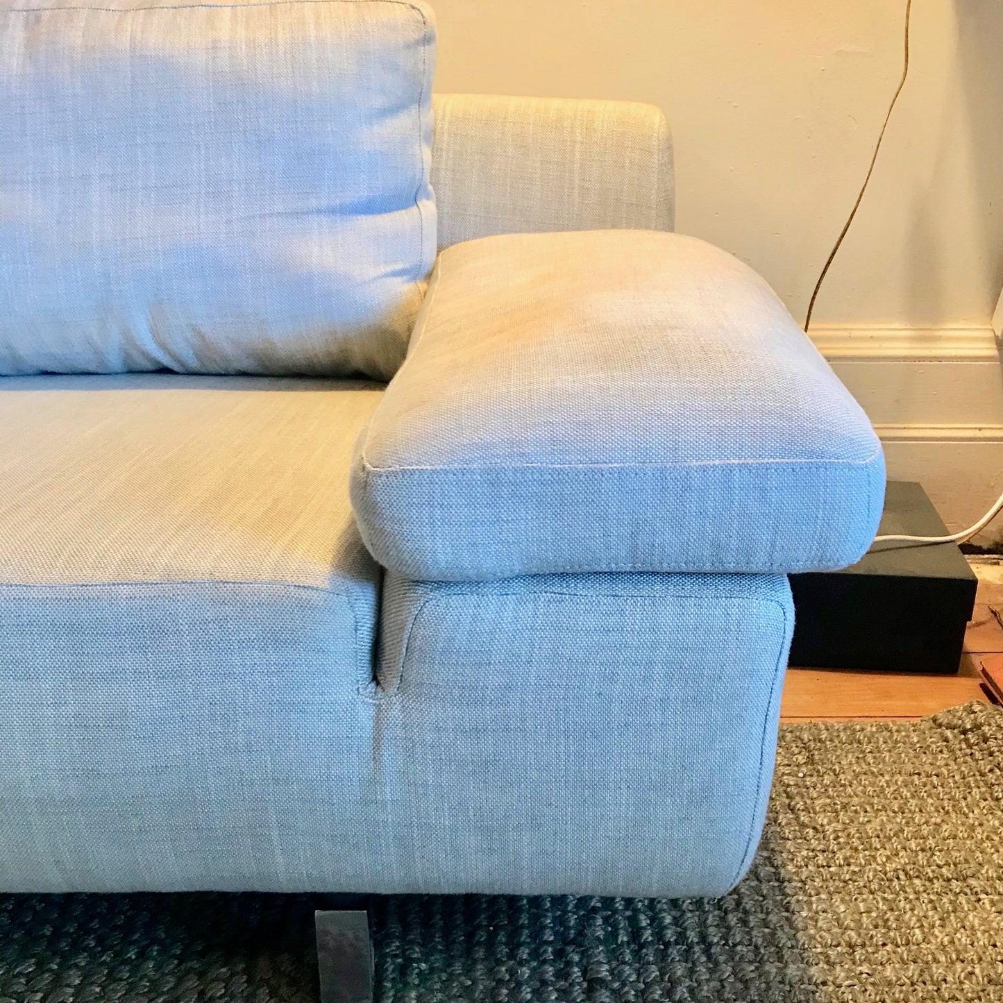 The Butterfly sofa by Domicil is a stylish three seat sofa. The sofa is upholstered in a neutral fabric. The arms have mechanisms to allow tilt up. Purchased from David Jones 2017.