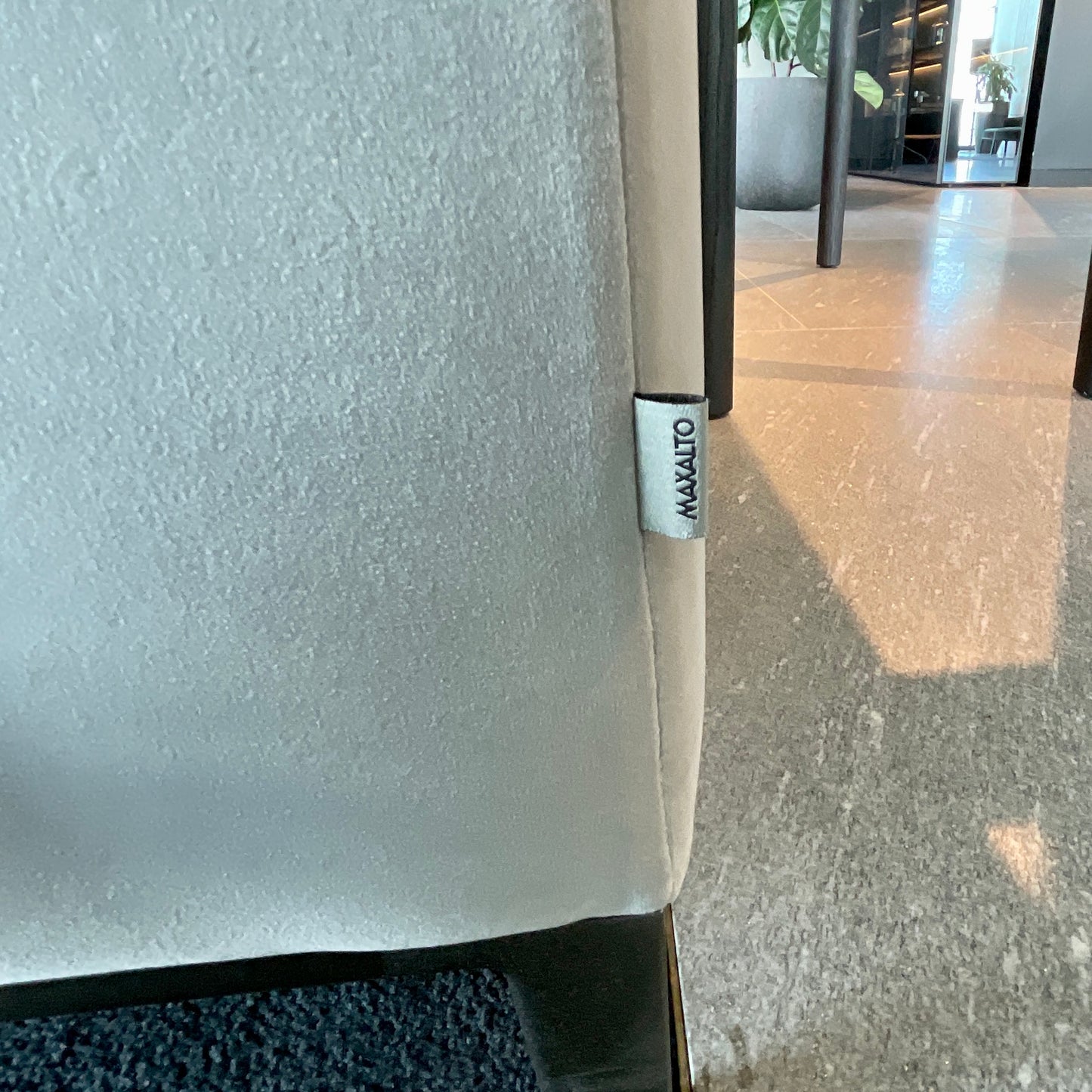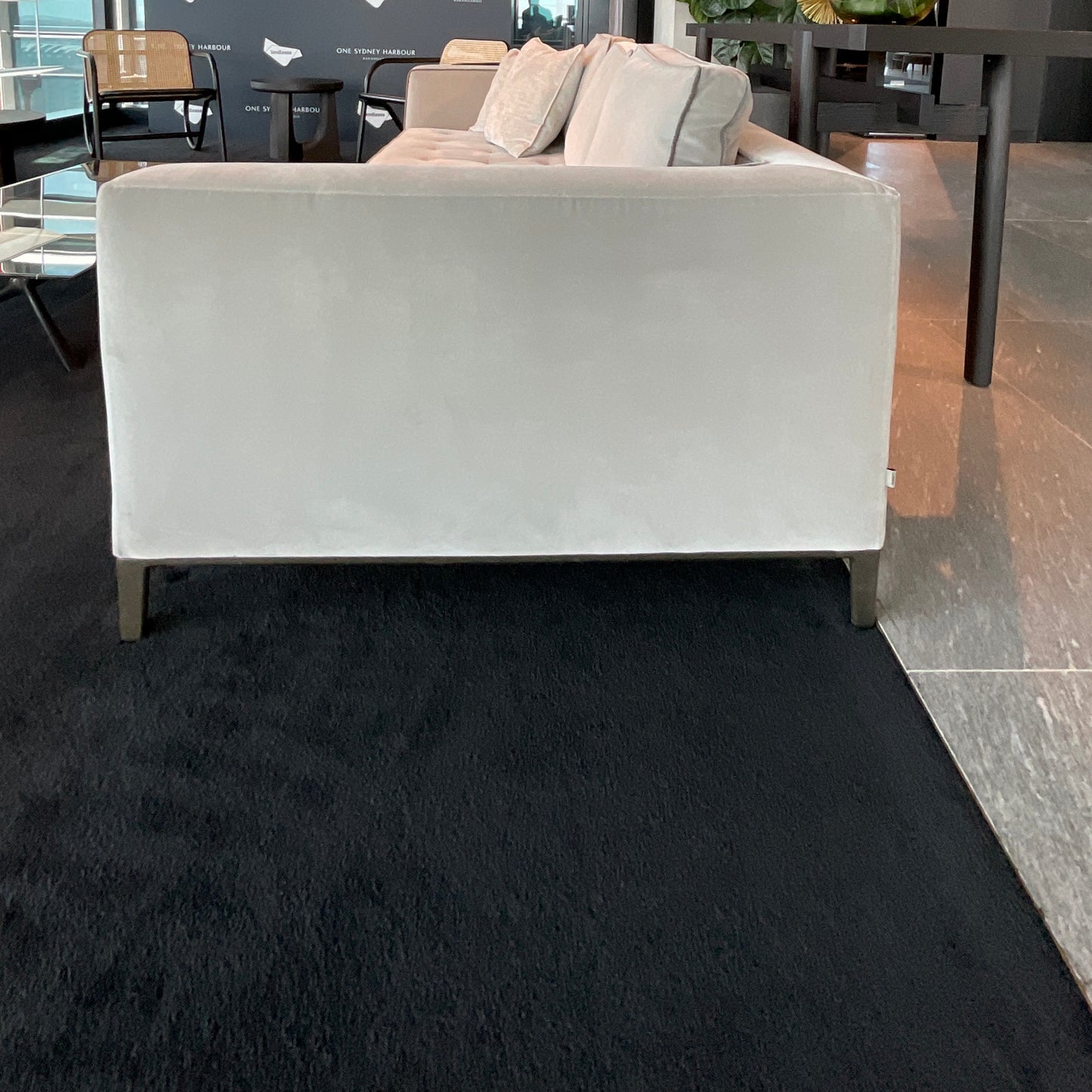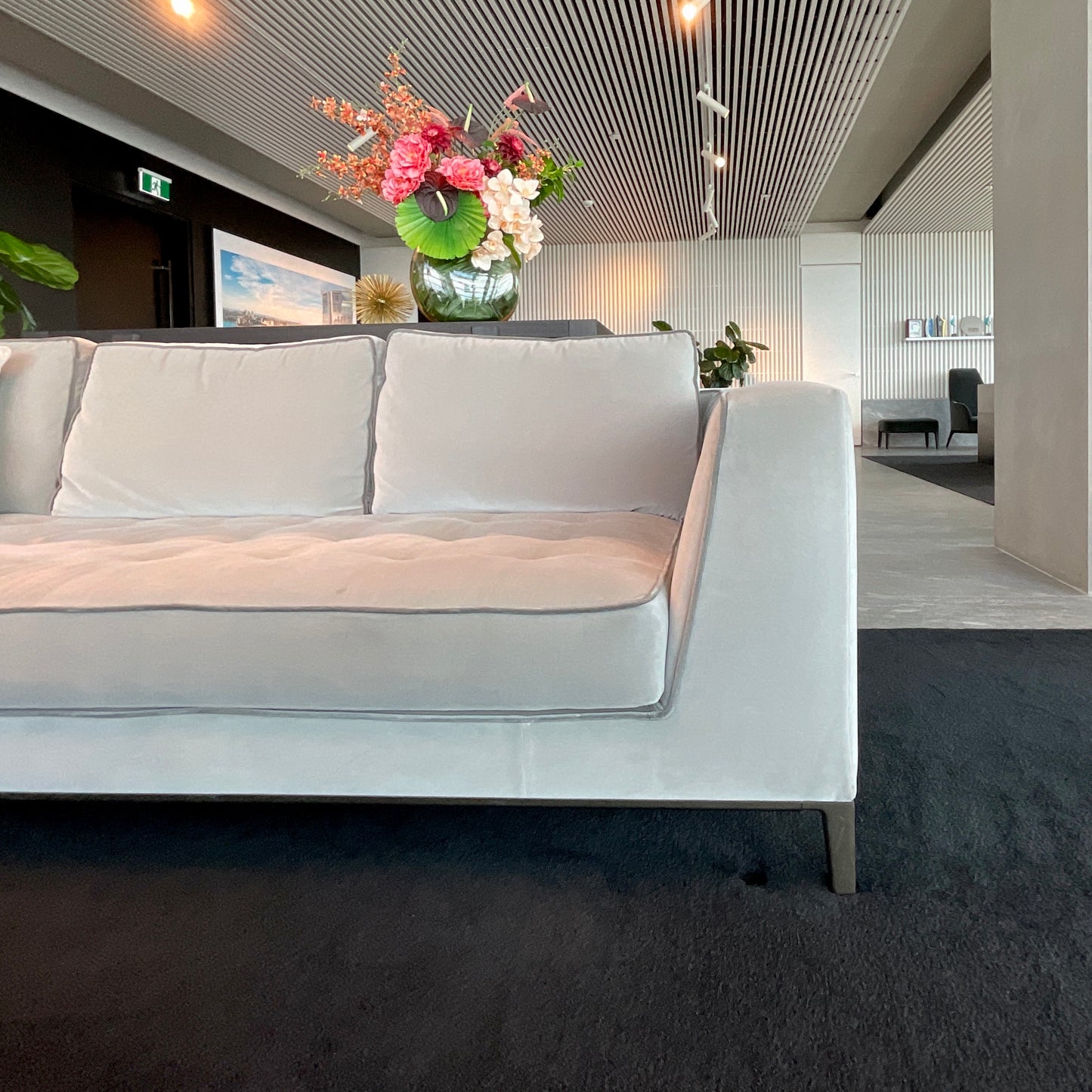 Lucrezia Soft is a range of sofas defined by generous padding and rounded forms. The many elements making up the series of linear and modular sofas, available in two depths and multiple sizes, come in two versions. The first offers a plain seat cushion with a band and piping, the second a seat cushion with capitonné stitching. Both offer two options as regards the back cushions: a more compact version with lumbar support, for more restrained, formal seating arrangement; and a softer version with down feather cushions, for a more comfortable, laid back look. The sofa we have on offer is upholstered in Maxalto Sirio Velvet 2053258