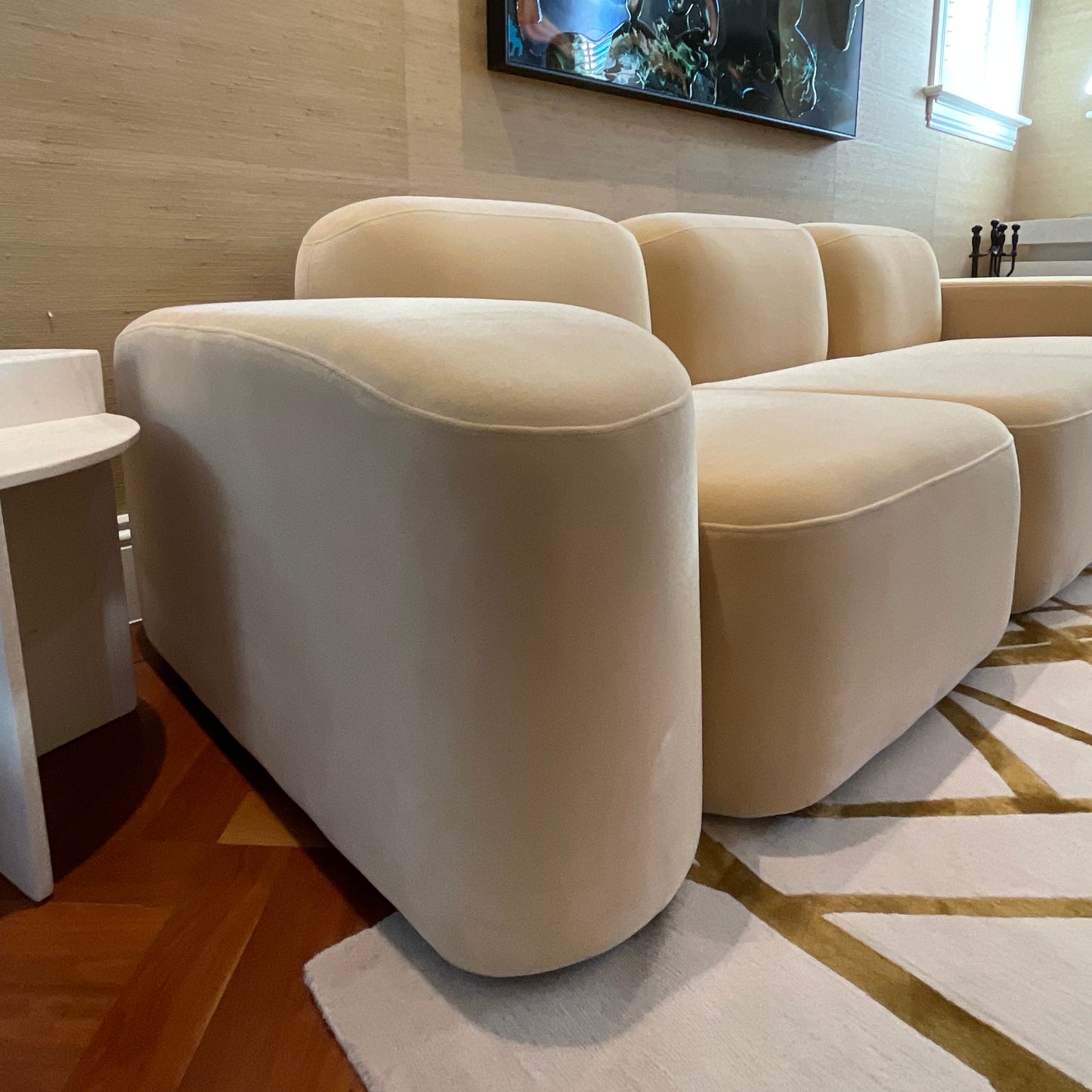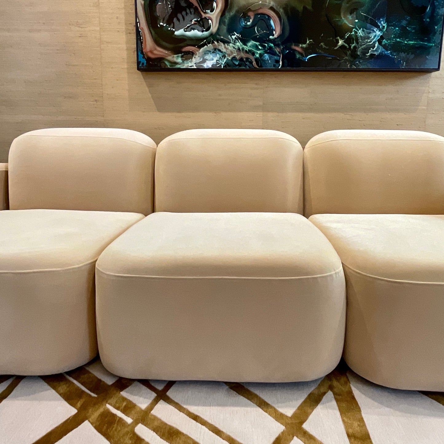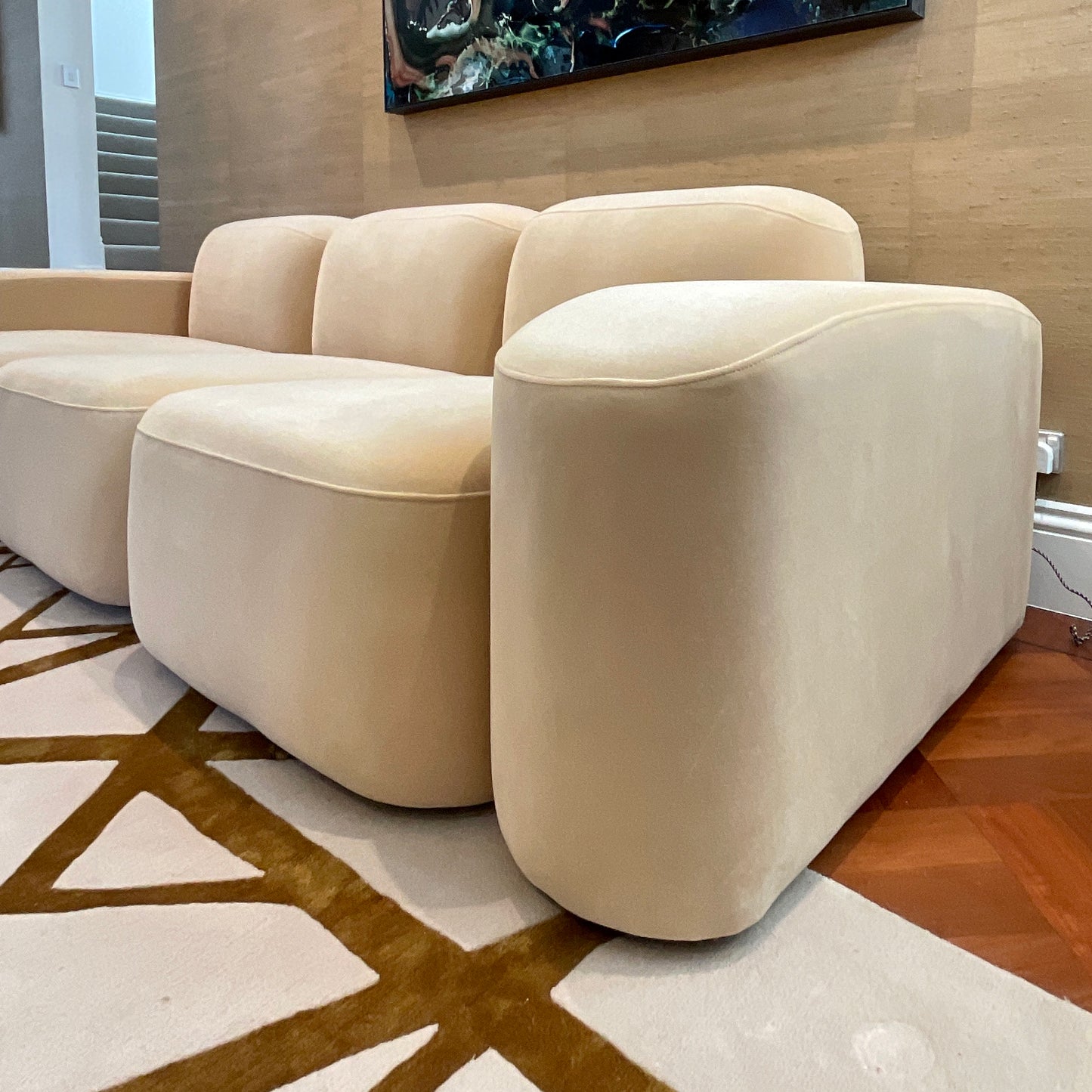 Designed by Sarah Ellison for ELLISON STUDIOS., Seat and cushions are made with high-resiliency foams and high-gauge sinuous springs for support. The sofa we have on offer is in three modules and upholstered in Malibu Dune Velvet.